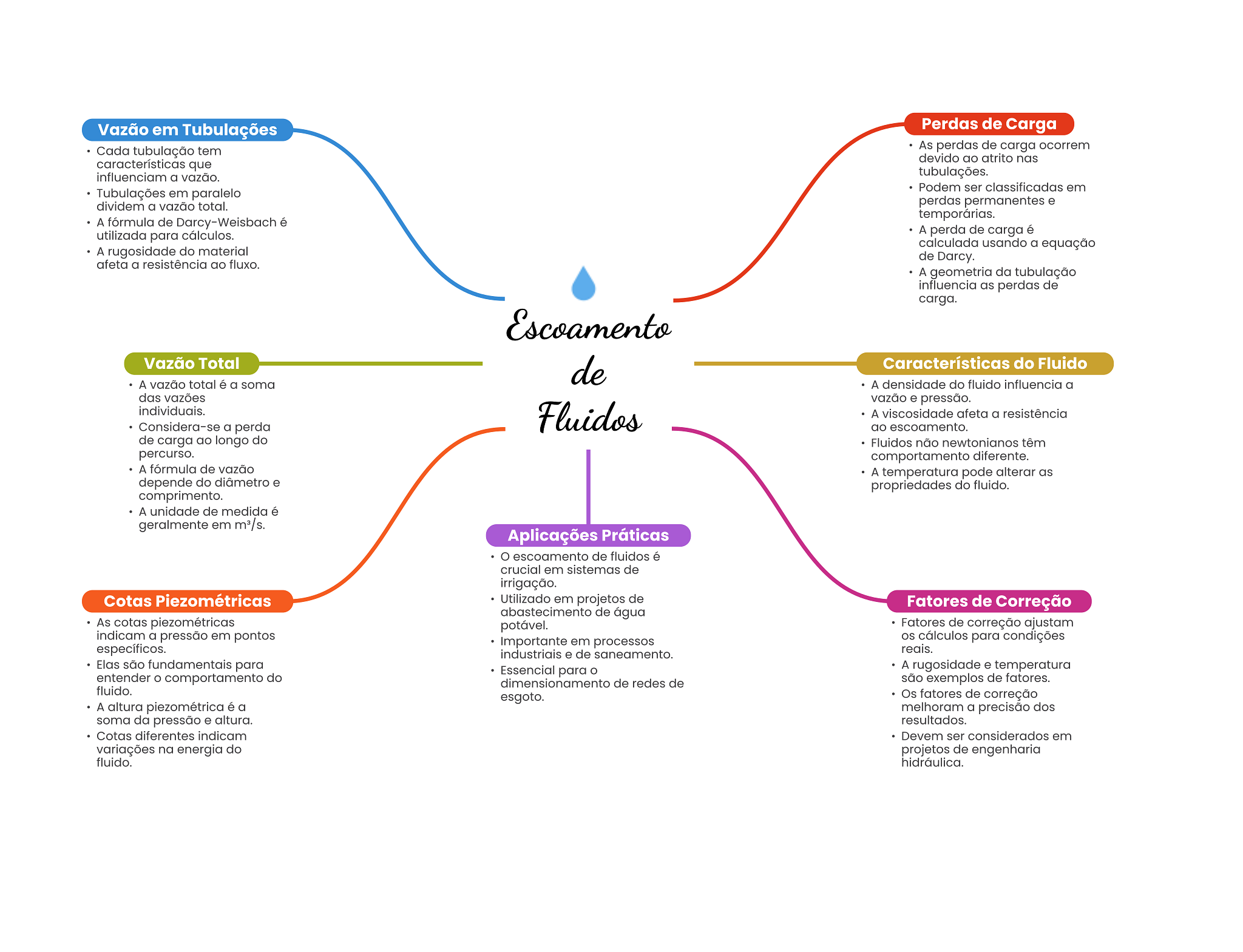 Vazão em Tubulações Perdas de Carga Cada tubulação tem As perdas de carga ocorrem devido ao atrito nas características que influenciam a vazão. tubulações. Podem ser classificadas em Tubulações em paralelo dividem a vazão total. perdas permanentes e temporárias. A fórmula de Darcy-Weisbach é utilizada para cálculos. A perda de carga é calculada usando a equação A rugosidade do material de Darcy. afeta a resistência ao fluxo. A geometria da tubulação influencia as perdas de carga. Escoamento Vazão Total de Características do Fluido A vazão total é a soma A densidade do fluido influencia a das vazões vazão e pressão. individuais. Considera-se a perda Fluidos A viscosidade afeta a resistência ao escoamento. de carga ao longo do Fluidos não newtonianos têm percurso. comportamento diferente. A fórmula de vazão A temperatura pode alterar as depende do diâmetro e propriedades do fluido. comprimento. A unidade de medida é geralmente em m³/s. Aplicações Práticas escoamento de fluidos é crucial em sistemas de irrigação. Cotas Piezométricas Utilizado em projetos de Fatores de Correção abastecimento de água As cotas piezométricas potável. Fatores de correção ajustam indicam a pressão em pontos Importante em processos OS cálculos para condições específicos. industriais e de saneamento. reais. Elas são fundamentais para Essencial para A rugosidade e temperatura entender comportamento do dimensionamento de redes de são exemplos de fatores. fluido. esgoto. Os fatores de correção A altura piezométrica é a melhoram a precisão dos soma da pressão e altura. resultados. Cotas diferentes indicam Devem ser considerados em variações na energia do projetos de engenharia fluido. hidráulica.