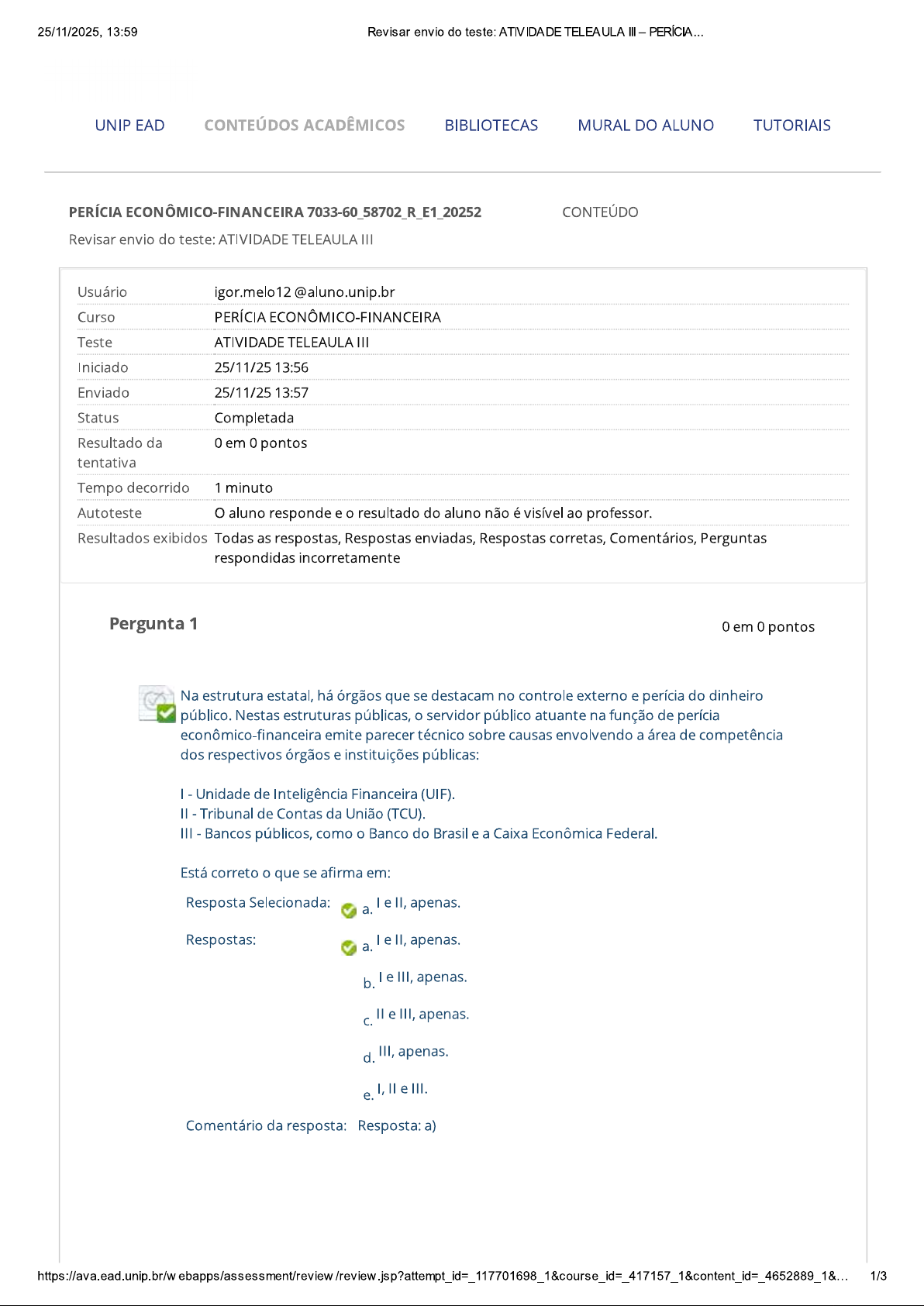 25/11/2025, 13:59 Revisar envio do teste: ATIVIDADE TELEAULA III PERÍCIA... UNIP EAD CONTEÚDOS ACADÊMICOS BIBLIOTECAS MURAL DO ALUNO TUTORIAIS PERÍCIA 7033-60_58702_R_E1_20252 CONTEÚDO Revisar envio do teste: ATIVIDADE TELEAULA III Usuário igor.melo @aluno.unip.br Curso PERÍCIA Teste ATIVIDADE TELEAULA III Iniciado 25/11/25 13:56 Enviado 25/11/25 13:57 Status Completada Resultado da 0 em 0 pontos tentativa Tempo decorrido 1 minuto Autoteste aluno responde e resultado do aluno não é visível ao professor. Resultados exibidos Todas as respostas, Respostas enviadas, Respostas corretas, Comentários, Perguntas respondidas incorretamente Pergunta 1 0 em 0 pontos Na estrutura estatal, há órgãos que se destacam no controle externo e perícia do dinheiro público. Nestas estruturas públicas, servidor público atuante na função de perícia econômico-financeira emite parecer técnico sobre causas envolvendo a área de competência dos respectivos órgãos e instituições públicas: I - Unidade de Inteligência Financeira (UIF). Tribunal de Contas da União (TCU). III Bancos públicos, como Banco do Brasil e a Caixa Econômica Federal. Está correto que se afirma em: Resposta Selecionada: le II, apenas. a. Respostas: a. e II, apenas. b. le III, apenas. e III, apenas. d. III, apenas. e. I, e III. Comentário da resposta: Resposta: a) 1/325/11/2025, 13:59 Revisar envio do teste: ATIVIDADE TELEAULA III PERÍCIA... Pergunta 2 0 em 0 pontos Sobre a Lei n. 12.683, de 09/07/2012, e crime de lavagem de dinheiro, temos: I Há uma busca por mais eficiência na persecução penal dos crimes de lavagem de dinheiro. crime de lavagem de dinheiro não é considerado uma infração derivada, pois não se origina de um crime primário como tráfico de drogas, contrabando, jogos de azar, entre outros. III São indícios de crimes de lavagem de dinheiro os aumentos substanciais de depósitos bancários sem causa aparente, troca de grandes quantidades de notas de pequeno valor em notas de maior valor. Está correto que se afirma em: Resposta Selecionada: b. e III, apenas. Respostas: a. e II, apenas. b. le III, apenas. e III, apenas. d. III, apenas. I, e III. e. Comentário da resposta: Resposta: b) Pergunta 3 0 em 0 pontos Sobre as peças de finanças públicas, como PPA, LDO e LOA: I PPA faz a previsão para os próximos 8 anos. A LOA e a LDO devem dispor sobre a alocação dos recursos previstos na composição dos programas, projetos e atividades, explicitados de acordo com as diretrizes estabelecidas na LOA e em consonância com as prioridades do PPA. III A LDO é elo entre PPA e LOA, pois define as metas e prioridades (PPA) e orienta a legislação tributária a aplicar os recursos (LOA). Está correto que se afirma em: Resposta Selecionada: d. III, apenas. Respostas: e II, apenas. a. b. le III, apenas. C. e III, apenas. d. III, apenas. I, e III. e. Comentário da resposta: Resposta: d) 2/325/11/2025, 13:59 Revisar envio do teste: ATIVIDADE TELEAULA III PERÍCIA... Pergunta 4 0 em 0 pontos Conforme consta no livro-texto, a perícia econômico-financeira do TCU, sobre as contas do Governo Dilma Rousseff, verificou 101 de um total de 1.132 metas presentes no PPA 2016- 2019. Dessa amostra, 35 metas apresentaram problemas de qualidade e/ou de confiabilidade. Quanto à qualidade, foram apontadas deficiências em 32 metas. Portanto: I Das 1.132 metas presentes no PPA 2016-2019, 32% apresentaram problemas de qualidade e/ou de confiabilidade. Das 101 metas examinadas no trabalho, 35% apresentaram problemas de qualidade. III Das metas presentes, foram examinadas 8,9% que apresentaram problemas e deficiências relacionados de qualidade e/ou de confiabilidade. Está correto que se afirma em: Resposta Selecionada: d. III, apenas. Respostas: a. le II, apenas. b. le III, apenas. e III, apenas. d. III, apenas. I, e III. e. Comentário da resposta: Resposta: d) OK Terça-feira, 25 de Novembro de 2025 13h57min24s GMT-03:00 3/3
