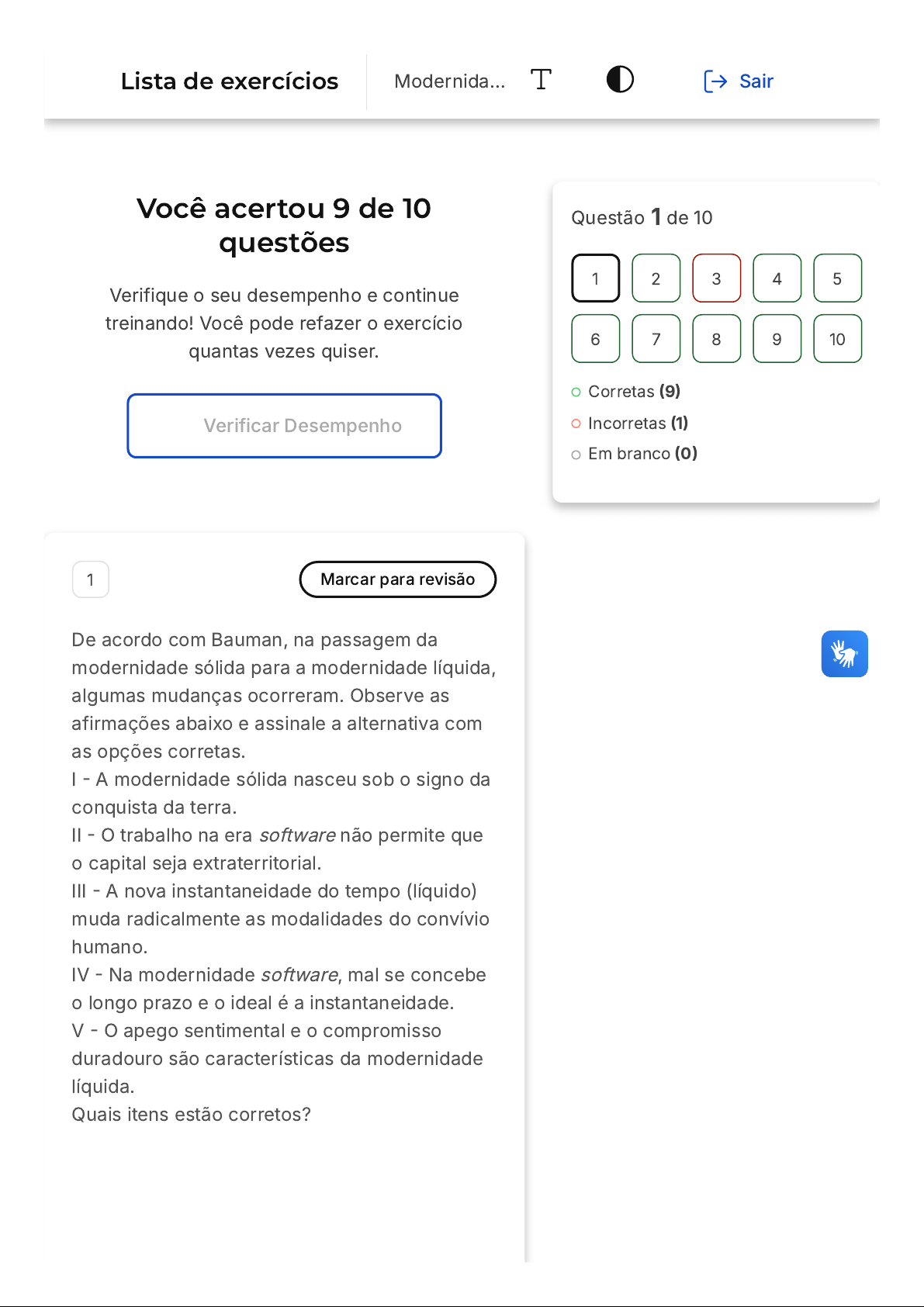 Você acertou 9 de 10 questões Verifique o seu desempenho e continue treinando! Você pode refazer o exercício quantas vezes quiser. Verificar Desempenho 1 Marcar para revisão De acordo com Bauman, na passagem da modernidade sólida para a modernidade líquida, algumas mudanças ocorreram. Observe as afirmações abaixo e assinale a alternativa com as opções corretas. I - A modernidade sólida nasceu sob o signo da conquista da terra. II - O trabalho na era software não permite que o capital seja extraterritorial. III - A nova instantaneidade do tempo (líquido) muda radicalmente as modalidades do convívio humano. IV - Na modernidade software, mal se concebe o longo prazo e o ideal é a instantaneidade. V - O apego sentimental e o compromisso duradouro são características da modernidade líquida. Quais itens estão corretos? Questão 1 de 10 Corretas (9) Incorretas (1) Em branco (0) 1 2 3 4 5 6 7 8 9 10 Lista de exercícios Modernida… Sair A B C D E I e V I, III e IV I e II II, III e V I e III Resposta correta Parabéns, você selecionou a alternativa correta. Confira o gabarito comentado! Gabarito Comentado I - A modernidade sólida nasceu sob o signo da conquista da terra. Esta afirmação está correta. A modernidade sólida focava na conquista, na expansão territorial e na estabilização de estruturas políticas e sociais. II - O trabalho na era software não permite que o capital seja extraterritorial. Esta afirmação está incorreta. Na verdade, na era do trabalho "software", o capital se torna ainda mais extraterritorial, movendo- se rapidamente entre fronteiras graças à globalização e à digitalização. III - A nova instantaneidade do tempo (líquido) muda radicalmente as modalidades do convívio humano. Esta afirmação está correta. Bauman argumenta que a instantaneidade do tempo na modernidade líquida altera A B C significativamente as formas de interação social e convívio humano. IV - Na modernidade software, mal se concebe o longo prazo e o ideal é a instantaneidade. Esta afirmação está correta. Na modernidade líquida, o foco é na gratificação instantânea e no curto prazo, com menos ênfase em compromissos de longo prazo. V - O apego sentimental e o compromisso duradouro são características da modernidade líquida. Esta afirmação está incorreta. A modernidade líquida tende a evitar compromissos duradouros e apego sentimental, privilegiando relações mais temporárias e menos vinculantes. Portanto, as afirmativas corretas são I, III e IV. 2 Marcar para revisão (CESGRANRIO / 2008) A imagem de um planeta atravessado por auto-estradas da informação ajuda a configurar o que o sociólogo Zygmunt Bauman denominou de tempos líquidos. Segundo este conceito, o mundo atual seria marcado pela(o) insegurança. solidariedade. liberdade. D E paz. amor. Resposta correta Parabéns, você selecionou a alternativa correta. Confira o gabarito comentado! Gabarito Comentado Segundo Bauman, a precariedade é marca da modernidade líquida. As palavras que mais nos definem no capitalismo atual são: falta de garantias, incerteza e insegurança. 3 Marcar para revisão A Grã-Bretanha se destacou entre os seus vizinhos europeus por ter destruído seu campesinato e, com isso, também a ligação "natural" entre o tema trabalho humano e riqueza. Esse marco abriu caminho para grandes mudanças geopolíticas, que caracterizaram a modernidade sólida e a modernidade líquida. Qual das alternativas abaixo não corresponde a essas realidades: A B C D E Na visão pré-industrial da riqueza, a terra era uma atividade quase que por inteiro ligada àqueles que a cultivavam e a aravam. A emancipação do trabalho de suas limitações e da força de trabalho de seu caráter hereditário se deu sobretudo no século XIX. A corrida para a expansão espacial e a maximização das tarefas visando eliminar o tempo improdutivo não faziam parte da "racionalidade instrumental" do capitalismo sólido. No capitalismo hardware, quem viajasse mais depressa podia reivindicar mais territórios, mapeá-los e supervisioná-los. A realidade se prontificou para ganhar uma nova forma, baseada no mútuo engajamento de capital, trabalho e vínculos locais. Resposta incorreta Opa! A alternativa correta é a letra C. Confira o gabarito comentado! Gabarito Comentado A "racionalidade instrumental" do capitalismo sólido, de fato, envolvia a expansão espacial e a maximização das tarefas para eliminar o tempo improdutivo. Essa racionalidade estava voltada para a eficiência e a produtividade, características A B C D E marcantes do capitalismo sólido. Portanto, a afirmação de que esses elementos não faziam parte da "racionalidade instrumental" do capitalismo sólido está incorreta, diferentemente das demais alternativas que apresentam características corretas da modernidade sólida e líquida. 4 Marcar para revisão Qual dupla de características NÃO representa uma passagem da modernidade sólida para a modernidade líquida? Sociedade de produtores - Sociedade de consumidores Vigilância panóptica - Vigilância pós- panóptica Comunidade - Individualidade Burocracia e controle - "Liberdade" Medo - Segurança Resposta correta Parabéns, você selecionou a alternativa correta. Confira o gabarito comentado! Gabarito Comentado A alternativa correta é "Medo - Segurança". Esta opção não representa uma transição da modernidade sólida para a modernidade líquida. Na verdade, o medo e a segurança são aspectos presentes tanto na modernidade sólida quanto na líquida. Na modernidade sólida, o medo pode ser gerado por estruturas rígidas e burocráticas, enquanto na modernidade líquida, a insegurança pode surgir da falta de estruturas estáveis e previsíveis. Portanto, esses conceitos não representam uma mudança de um estado para o outro, mas sim aspectos que podem ser encontrados em ambos. 5 Marcar para revisão De acordo com Zygmunt Bauman, o mundo contemporâneo é marcado por