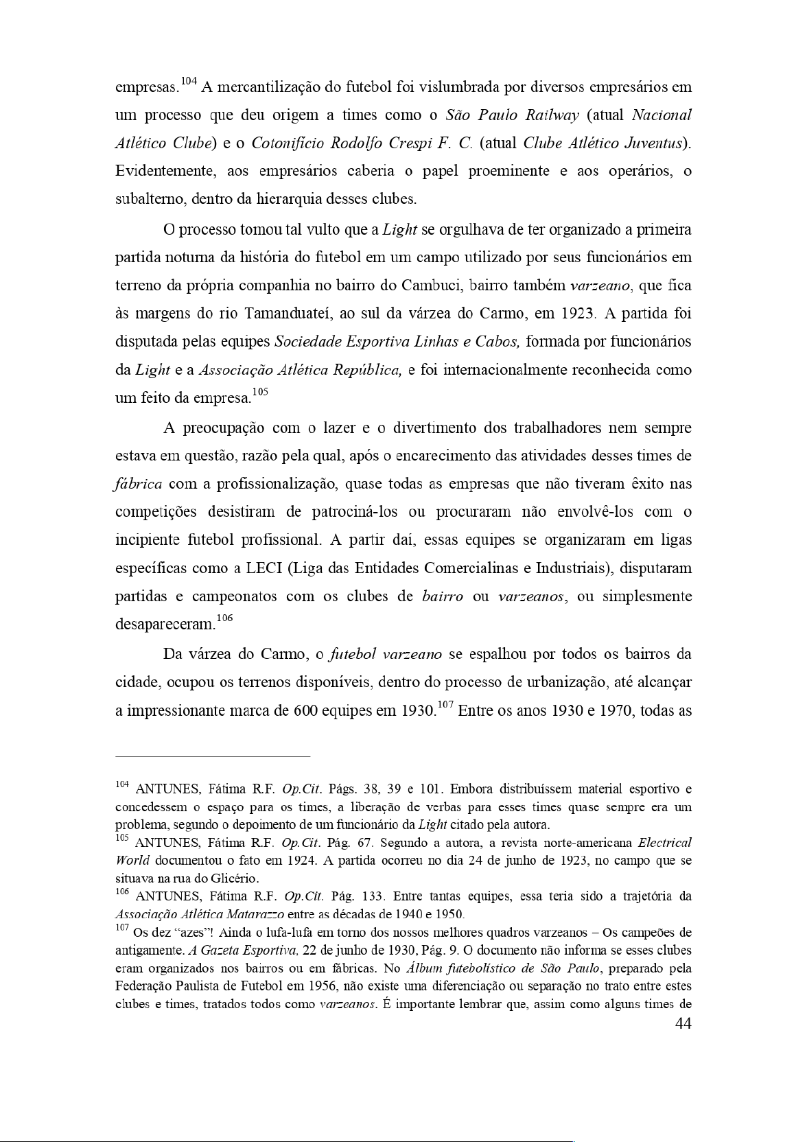empresas. * A mercantilização do futebol foi vislumbrada por diversos empresários em um processo que deu origem a times como o São Paulo Railway (atual Nacional Atlético Clube) e o Cotonifício Rodolfo Crespi F. C. (atual Clube Atlético Juventus). Evidentemente, aos empresários caberia o papel proeminente e aos operários, o subalterno, dentro da hierarquia desses clubes. O processo tomou tal vulto que a Light se orgulhava de ter organizado a primeira partida noturna da história do futebol em um campo utilizado por seus funcionários em terreno da própria companhia no bairro do Cambuci, bairro também varzeano, que fica às margens do rio Tamanduateí, ao sul da várzea do Carmo, em 1923. A partida foi disputada pelas equipes Sociedade Esportiva Linhas e Cabos, formada por funcionários da Light e a Associação Atlética República, e foi internacionalmente reconhecida como um feito da empresa. * A preocupação com o lazer e o divertimento dos trabalhadores nem sempre estava em questão, razão pela qual, após o encarecimento das atividades desses times de fabrica com a profissionalização, quase todas as empresas que não tiveram êxito nas competições desistiram de patrociná-los ou procuraram não envolvê-los com o incipiente futebol profissional. A partir daí, essas equipes se organizaram em ligas específicas como a LECI (Liga das Entidades Comercialinas e Industriais), disputaram partidas e campeonatos com os clubes de bairro ou varzeanos, ou simplesmente desapareceram. * Da várzea do Carmo, o futebol varzeano se espalhou por todos os bairros da cidade, ocupou os terrenos disponíveis, dentro do processo de urbanização, até alcançar a impressionante marca de 600 equipes em 1930."*” Entre os anos 1930 e 1970, todas as 104 ANTUNES, Fátima RF. Op.Cit. Págs. 38, 39 e 101. Embora distribuissem material esportivo e concedessem o espaço para os times, a liberação de verbas para esses times quase sempre era um problema, segundo o depoimento de um funcionário da Light citado pela autora. 195 ANTUNES, Fátima RF. Op.Cit. Pág. 67. Segundo a autora, a revista norte-americana Electrical World documentou o fato em 1924. A partida ocorreu no dia 24 de junho de 1923, no campo que se situava na rua do Glicério. 106 ANTUNES, Fátima RF. Op.Cit. Pág. 133. Entre tantas equipes, essa teria sido a trajetória da Associação Atlética Matarazzo entre as décadas de 1940 e 1950. 197 Os dez “azes™! Ainda o lufa-lufa em torno dos nossos melhores quadros varzeanos — Os campedes de antigamente. 4 Gazeta Esportiva, 22 de junho de 1930, Pag. 9. O documento não informa se esses clubes eram organizados nos bairros ou em fabricas. No Álbum futebolistico de São Paulo, preparado pela Federação Paulista de Futebol em 1956, não existe uma diferenciagdo ou separação no trato entre estes clubes e times, tratados todos como varzeanos. É importante lembrar que, assim como alguns times de 44 áreas próximas aos corregos e rios da cidade se converteram em espaços utilizados para o futebol. Apenas no início dos anos 1970, as avenidas tomaram, definitivamente, o lugar dos campos e clubes. A atuação da Prefeitura em relação à várzea do Carmo e a criação da Chácara da Floresta ajudaram a disseminar pelas várzeas da cidade o futebol praticado pelos grupos pobres da cidade. Em algumas ocasiões, o futebol era integrado nas práticas festivas, religiosas e paroquiais tão características dos bairros. º Com o processo de massificação e espetacularização, o futebol construiria um espaço autônomo de lazer em relação à religião e ao paroquismo na construção de identidades diretas com os bairros e seus moradores.'*® Os nomes dos times varzeanos, com o tempo, passaram a se remeter aos locais de origem. Alguns se remetiam à filiação política de seus fundadores e simpatizantes ou 4 origem nacional dos individuos. '’ Em alguns casos, os times de varzea chegaram a ser os coletivos que se assumiam perante a cidade enquanto representantes dos seus bairros.'’! Era uma conjungdo de festa, de ludico, de sagrado e profano, de familia, de muitos amigos, de muita atividade que contava com a presenga do padre e de políticos. * Para Burke, “estas instituições voluntdrias a meio caminho entre o mundo privado e o mundo público contribuiram para o surgimento do que hoje é chamado de sociedade civil. ” *"*? Na pratica, todo bairro de São Paulo possuia um ou mais clubes que se dedicavam ao esporte. Mais uma vez, o depoimento do Sr. Amadeu nos esclarece sobre a relagéo entre os bairros e seus times e campos de futebol, no final dos anos 1920, um pouco antes da profissionalizagdo: bairro ascenderam ao futebol oficial (depois profissional), alguns desses times de fdbrica também vivenciaram o mesmo processo como o Juventis ou o Nacional, mencionados. 198 SEABRA,0.C.L. Op. Cit. Pág. 140 (ou 170). 19 SEABRA,O.C.L. Op. Cit. Pág. 277 (ou 375). 1% SEABRA,O.C.L. Op. Cit. Pag. 361 (ou 429). A autora sugere a necessidade de se aprofundarem os estudos para que se possa compreender outros aspectos importantes dessas agremiagdes como o uso constante de nomes como Flor e Estrela, assim como as relagdes entre estes nomes e os utilizados por diversas padarias paulistanas. 1 SEABRA,O.C.L. Op. Cit. Pág. 364 (ou 432). 112 SEABRA,0.C.L. Op. Cit. Pág. 389 (ou 487). '3 BURKE, Peter. A historia social dos clubes. Folha de S. Paulo. 24/02/2002. 45 “Naquele tempo tinha mais de mil campos de várzea. Na Vila Maria, no Canindé, na Várzea do Glicério, cada um tinha mais ou menos cingiienta campos de futebol. Penha, pode pôr cinqiienta campos. Barra Funda, Lapa, entre vinte e vinte e cinco campos. Ipiranga, junto com Vila Prudente, pode pôr uns cinqiienta campos. Vila Matilde, uns vinte.”*** Com a profissionalizagdo, as equipes varzeanas e de fábrica se consolidaram como trampolim para jogadores novatos despontarem antes de serem descobertos pelos olheiros'”’ e ingressarem
