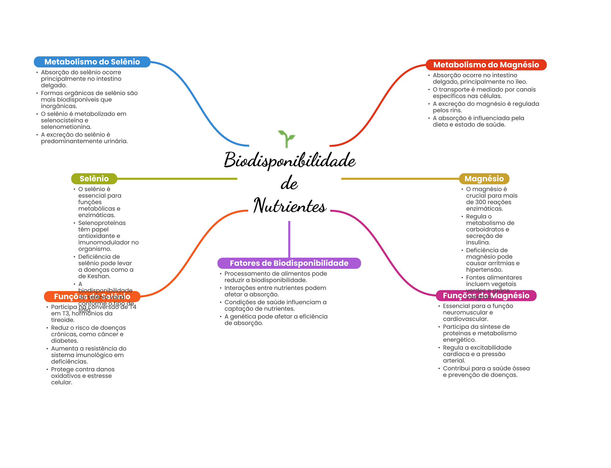 Metabolismo do Selênio Metabolismo do Magnésio Absorção do selênio ocorre Absorção ocorre no intestino principalmente no intestino delgado, principalmente no íleo. delgado. transporte é mediado por canais Formas orgânicas de selênio são específicos nas células. mais biodisponíveis que inorgânicas. A excreção do magnésio é regulada selênio é metabolizado em pelos rins. selenocisteína e A absorção é influenciada pela selenometionina. dieta e estado de saúde. A excreção do selênio é predominantemente urinária. Biodisponibilidade Selênio de Magnésio selênio é magnésio é essencial para crucial para mais funções metabólicas e Nutrientes de 300 reações enzimáticas. enzimáticas. Regula Selenoproteínas metabolismo de têm papel carboidratos e antioxidante e secreção de imunomodulador no insulina. organismo. Deficiência de Deficiência de magnésio pode selênio pode levar Fatores de Biodisponibilidade causar arritmias e a doenças como a hipertensão. de Keshan. Processamento de alimentos pode reduzir a biodisponibilidade. Fontes alimentares A incluem vegetais biodisponibilidade Interações entre nutrientes podem verdes grãos Funções de afetar a absorção. Funções do Magnésio conforme Condições de saúde influenciam a Participa na de T4 captação de nutrientes. Essencial para a função em hormonios da neuromuscular e tireoide. A genética pode afetar a eficiência cardiovascular. de absorção. Reduz risco de doenças Participa da síntese de crônicas, como câncer e proteínas e metabolismo diabetes. energético. Aumenta a resistência do Regula a excitabilidade sistema imunológico em cardíaca e a pressão deficiências. arterial. Protege contra danos Contribui para a saúde óssea oxidativos e estresse e prevenção de doenças. celular.