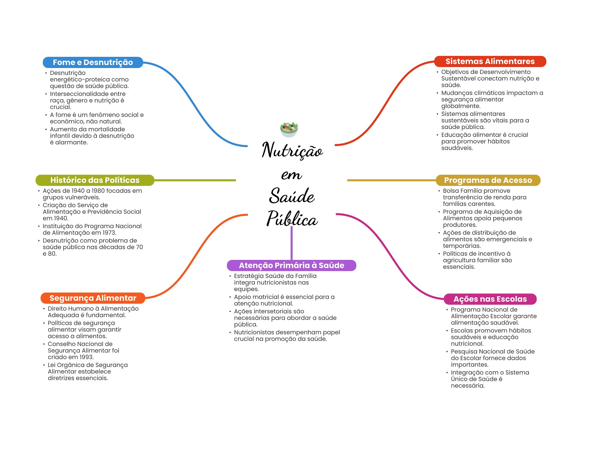 Fome e Desnutrição Sistemas Alimentares Desnutrição Objetivos de Desenvolvimento energético-proteica como Sustentável conectam nutrição e questão de saúde pública. saúde. Interseccionalidade entre Mudanças climáticas impactam a raça, gênero e nutrição é segurança alimentar crucial. globalmente. A fome é um fenômeno social e Sistemas alimentares econômico, não natural. sustentáveis são vitais para a Aumento da mortalidade saúde pública. infantil devido à desnutrição Educação alimentar é crucial é alarmante. para promover hábitos Nutrição saudáveis. em Histórico das Políticas Programas de Acesso Ações de 1940 a 1980 focadas em Saúde Bolsa Família promove grupos vulneráveis. transferência de renda para Criação do Serviço de famílias carentes. Alimentação e Previdência Social Pública Programa de Aquisição de em 1940. Alimentos apoia pequenos Instituição do Programa Nacional produtores. de Alimentação em 1973. Ações de distribuição de Desnutrição como problema de alimentos são emergenciais e saúde pública nas décadas de 70 temporárias. e 80. Políticas de incentivo à agricultura familiar são Atenção Primária à Saúde essenciais. Estratégia Saúde da Família integra nutricionistas nas equipes. Segurança Alimentar Apoio matricial é essencial para a Ações nas Escolas atenção nutricional. Direito Humano à Alimentação Ações intersetoriais são Programa Nacional de Adequada é fundamental. necessárias para abordar a saúde Alimentação Escolar garante Políticas de segurança pública. alimentação saudável. alimentar visam garantir Nutricionistas desempenham papel Escolas promovem hábitos acesso a alimentos. crucial na promoção da saúde. saudáveis e educação Conselho Nacional de nutricional. Segurança Alimentar foi Pesquisa Nacional de Saúde criado em 1993. do Escolar fornece dados Lei Orgânica de Segurança importantes. Alimentar estabelece Integração com O Sistema diretrizes essenciais. Único de Saúde é necessária.