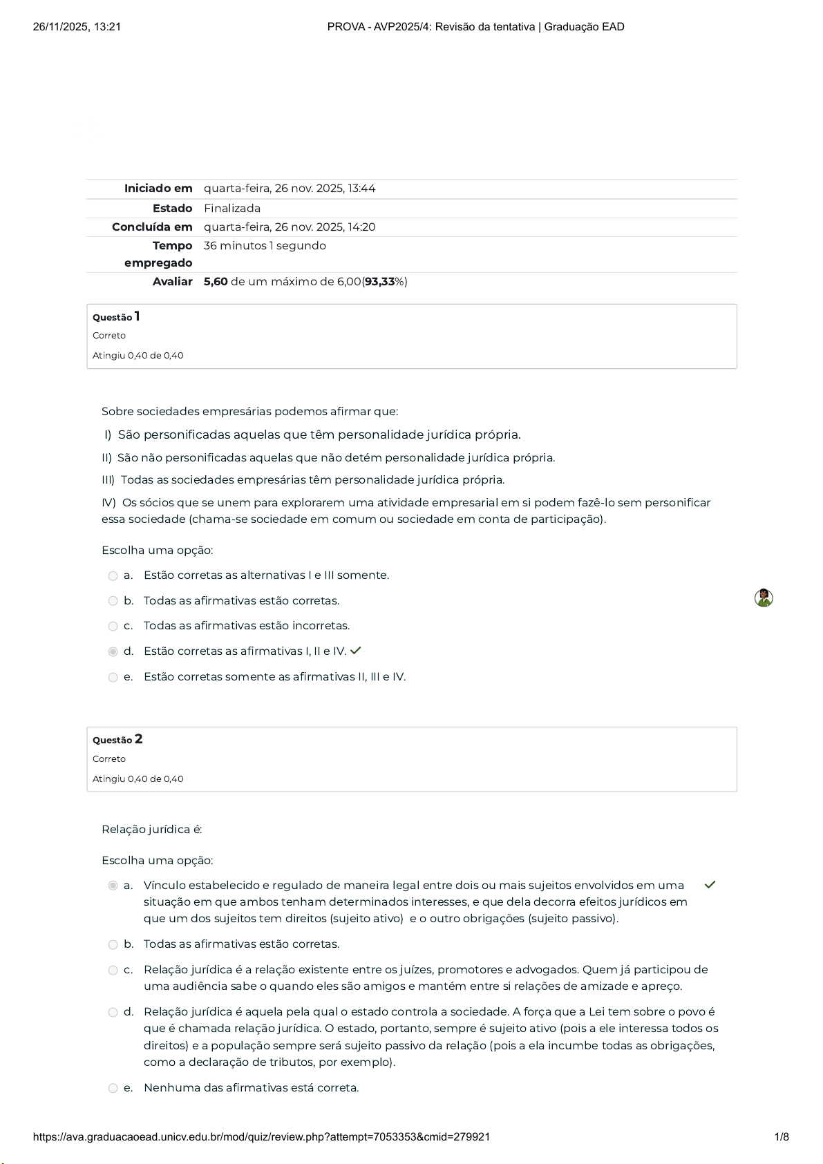 Iniciado em quarta-feira, 26 nov. 2025, 13:44 Estado Finalizada Concluída em quarta-feira, 26 nov. 2025, 14:20 Tempo empregado 36 minutos 1 segundo Avaliar 5,60 de um máximo de 6,00(93,33%) Questão 1 Correto Atingiu 0,40 de 0,40 Questão 2 Correto Atingiu 0,40 de 0,40 Sobre sociedades empresárias podemos afirmar que: I) São personificadas aquelas que têm personalidade jurídica própria. II) São não personificadas aquelas que não detém personalidade jurídica própria. III) Todas as sociedades empresárias têm personalidade jurídica própria. IV) Os sócios que se unem para explorarem uma atividade empresarial em si podem fazê-lo sem personificar essa sociedade (chama-se sociedade em comum ou sociedade em conta de participação). Escolha uma opção: a. Estão corretas as alternativas I e III somente. b. Todas as afirmativas estão corretas. c. Todas as afirmativas estão incorretas. d. Estão corretas as afirmativas I, II e IV. ✓ e. Estão corretas somente as afirmativas II, III e IV. Relação jurídica é: Escolha uma opção: a. Vínculo estabelecido e regulado de maneira legal entre dois ou mais sujeitos envolvidos em uma situação em que ambos tenham determinados interesses, e que dela decorra efeitos jurídicos em que um dos sujeitos tem direitos (sujeito ativo) e o outro obrigações (sujeito passivo). ✓ b. Todas as afirmativas estão corretas. c. Relação jurídica é a relação existente entre os juízes, promotores e advogados. Quem já participou de uma audiência sabe o quando eles são amigos e mantém entre si relações de amizade e apreço. d. Relação jurídica é aquela pela qual o estado controla a sociedade. A força que a Lei tem sobre o povo é que é chamada relação jurídica. O estado, portanto, sempre é sujeito ativo (pois a ele interessa todos os direitos) e a população sempre será sujeito passivo da relação (pois a ela incumbe todas as obrigações, como a declaração de tributos, por exemplo). e. Nenhuma das afirmativas está correta. 26/11/2025, 13:21 PROVA - AVP2025/4: Revisão da tentativa | Graduação EAD https://ava.graduacaoead.unicv.edu.br/mod/quiz/review.php?attempt=7053353&cmid=279921 1/8 Questão 3 Correto Atingiu 0,40 de 0,40 Questão 4 Correto Atingiu 0,40 de 0,40 O Município de Aporá-BA, editou lei municipal ( Lei 045/2011) que emendava o inciso IV do artigo 29 da constituição federativa do Brasil. Segundo nossa apostila, no que tange à hierarquia das normas, assinale a afirmativa correta: Escolha uma opção: a. O município de Aporá não pode emendar ou alterar a constituição por meio de Lei Municipal, tendo em vista que leis municipais, hierarquicamente, conforme mostra a pirâmide de kelsen, não pode contrariar ou alterar dispositivo da constituição. ✓ b. Lei Municipal sempre será a norma hierarquicamente superior à todas as outras, pois ela está mais próxima da população daquele lugar. Ora a constituição foi feita em Brasília, longe de tudo, já a Lei de Aporá foi feita dentro da própria cidade, e por isso, tendo em vista a representação democrática, a Lei municipal representa mais os interesses da população local, por isso deve se sobrepor a todas as outras normas. c. Buscando a dinamicidade social, e contando que os legisladores tenham acesso pleno às fontes do Direito, é possível que a Lei municipal de Aporá altere parte da constituição que é de seu interesse, tendo em vista o Direito de representação social. Isso quer dizer que, se a população de Aporá deseja aplicar de forma diferenciada uma determinação constitucional, tendo em vista o interesse público, seus legisladores podem sim revogar em uma pequena parte a constituição federal. d. A Lei municipal não pode revogar dispositivo constitucional, pois a constituição é de interesse público, e a Lei municipal é de interesse privado. e. Como o número da Lei municipal é 45 e o artigo da constituição é de número 29, é plenamente possível a revogação deste. Ora, se a lei municipal tem número maior, é porque é mais forte. Usa-se aqui as regras do “Super Trunfo”. Você é um investidor, descobre um grupo de meninos programadores que estão desenvolvendo um aplicativo genial, resolve investir uma grana nos meninos, mas não quer ter seu patrimônio pessoal comprometido pelos possíveis erros de gestão dos meninos mas, por outro lado, quer a participação nos lucros obtidos. Qual o melhor tipo societário? Escolha uma opção: a. Sociedade em conta de participação. ✓ b. Sociedade de pessoas. c. Sociedade simples. d. Sociedade de capital. e. Sociedade civil organizada. 26/11/2025, 13:21 PROVA - AVP2025/4: Revisão da tentativa | Graduação EAD https://ava.graduacaoead.unicv.edu.br/mod/quiz/review.php?attempt=7053353&cmid=279921 2/8 Questão 5 Correto Atingiu 0,40 de 0,40 Questão 6 Correto Atingiu 0,40 de 0,40 A diferença entre o sujeito passivo e o sujeito ativo da relação jurídica é que: Escolha uma opção: a. Sujeito passivo é aquele que mais ganha com a relação jurídica. É aquele a qual o lucro da relação, ou o principal benefício é direcionado. Geralmente políticos e magnatas. b. Todas as alternativas estão corretas. c. O sujeito passivo é aquele que mais atua na relação jurídica, gerlamente são pessoas com a saúde equilibrada, comem de forma balanceada e fazem exercícios físicos regularmente. d. Enquanto o sujeito ativo tem o direito de exigir legalmente (juridicamente) o cumprimento da obrigação, o sujeito passivo tem o dever de cumprir com tal obrigação. ✓ e. Todas as alternativas estão incorretas. É correto dizer que: Escolha uma opção: a. O indivíduo tem obrigações e direitos autonomos. Ele não tem nada a ver com a convivência em sociedade. Tal afirmação é tão verdadeira que podemos provar de forma fácil, por exemplo, com a morte de uma pessoa. Assim que uma pessoa morre morre com ela suas obrigações e direitos, e esse desaparecimento