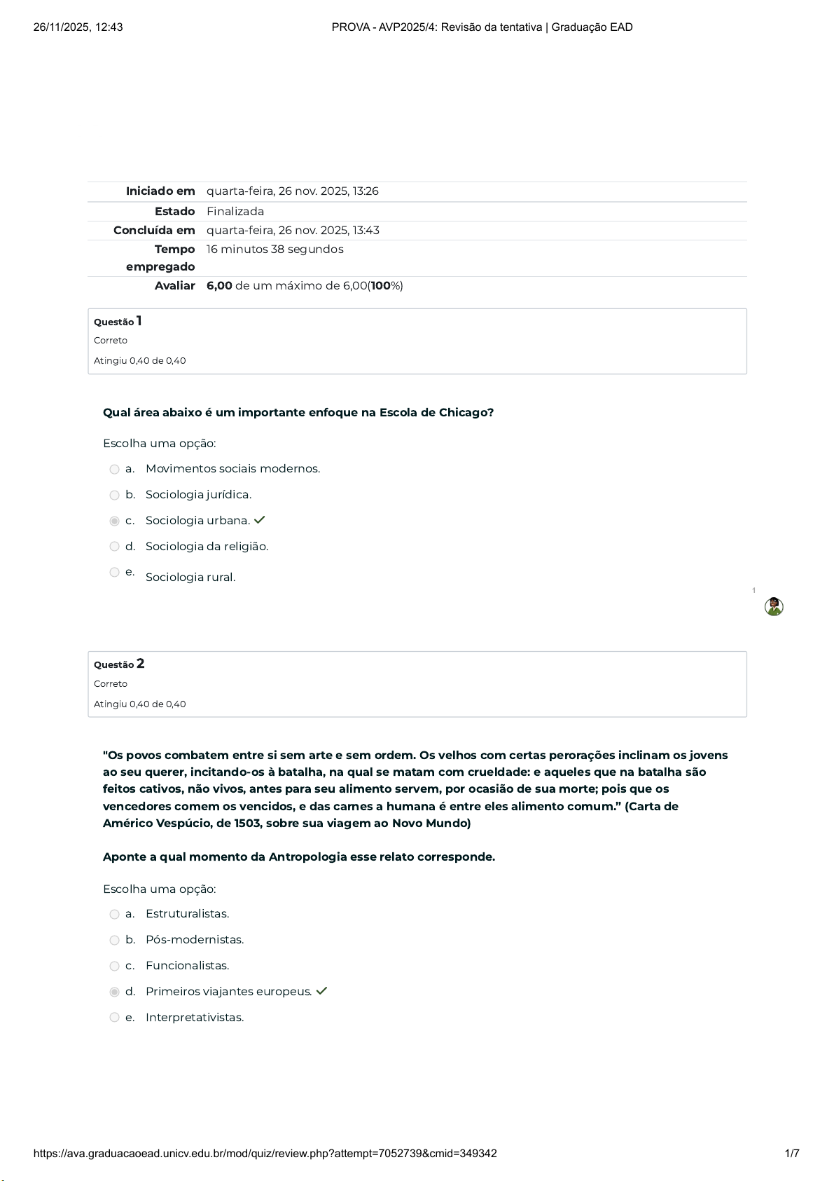 Iniciado em quarta-feira, 26 nov. 2025, 13:26 Estado Finalizada Concluída em quarta-feira, 26 nov. 2025, 13:43 Tempo empregado 16 minutos 38 segundos Avaliar 6,00 de um máximo de 6,00(100%) Questão 1 Correto Atingiu 0,40 de 0,40 Questão 2 Correto Atingiu 0,40 de 0,40 Qual área abaixo é um importante enfoque na Escola de Chicago? Escolha uma opção: a. Movimentos sociais modernos. b. Sociologia jurídica. c. Sociologia urbana. ✓ d. Sociologia da religião. e. Sociologia rural. "Os povos combatem entre si sem arte e sem ordem. Os velhos com certas perorações inclinam os jovens ao seu querer, incitando-os à batalha, na qual se matam com crueldade: e aqueles que na batalha são feitos cativos, não vivos, antes para seu alimento servem, por ocasião de sua morte; pois que os vencedores comem os vencidos, e das carnes a humana é entre eles alimento comum.” (Carta de Américo Vespúcio, de 1503, sobre sua viagem ao Novo Mundo) Aponte a qual momento da Antropologia esse relato corresponde. Escolha uma opção: a. Estruturalistas. b. Pós-modernistas. c. Funcionalistas. d. Primeiros viajantes europeus. ✓ e. Interpretativistas. 1 26/11/2025, 12:43 PROVA - AVP2025/4: Revisão da tentativa | Graduação EAD https://ava.graduacaoead.unicv.edu.br/mod/quiz/review.php?attempt=7052739&cmid=349342 1/7 Questão 3 Correto Atingiu 0,40 de 0,40 Questão 4 Correto Atingiu 0,40 de 0,40 Questão 5 Correto Atingiu 0,40 de 0,40 A chamada Escola de Chicago, de Sociologia, prega, entre outras coisas, a: Escolha uma opção: a. Transcendência do contexto. b. objetividade científica. ✓ c. especulação das teses científicas. d. Utilidade dos resultados. e. falsificação da hipótese. Acerca da crise democrática e dos novos modelos de democratização do Estado, assinale a alternativa correta. Escolha uma opção: a. Apesar da eficiência dos institutos de participação tradicionalmente reconhecidos, novos instrumentos, como o orçamento participativo, surgem para qualificar a democracia semidireta. b. A democracia participativa implica em uma ampliação do diálogo e da participação concreta, dispensando técnicas formais e reinserindo o povo em todos os Poderes do Estado. ✓ c. A presença de mecanismos de participação, como a iniciativa popular e o plebiscito, permitiram o engajamento do povo no cenário político, revitalizando a democracia representativa. d. A concretização das promessas estatais pelo modelo democrático permitiu o avanço para novas conquistas por meio da democracia participativa. e. A crise da democracia não passa pelos partidos políticos, que logram êxito em reafirmar a sua importância diante da impossibilidade de tomada de decisão pelo próprio povo. Trabalhando cada vez mais em sociedades de grande escala, os antropólogos desenvolveram formas inovadoras de misturar etnografia e survey. Sobre o trabalho do antropólogo, assinale a alternativa correta: Escolha uma opção: a. O método do survey aparece para suprir a necessidade de uma pesquisa mais aprofundada no dia a dia da cultura. b. O survey é um método que torna mais pessoal a pesquisa. c. O survey é um método que trabalha com amostragens. ✓ d. Como as sociedades, em alguns casos, como nas situações de fronteira, por exemplo, estão sempre em movimento, a Antropologia não pode cuidar de pesquisá-las. e. Nos dias atuais a observação direta não é mais utilizada como método de pesquisa. 1 26/11/2025, 12:43 PROVA - AVP2025/4: Revisão da tentativa | Graduação EAD https://ava.graduacaoead.unicv.edu.br/mod/quiz/review.php?attempt=7052739&cmid=349342 2/7 Questão 6 Correto Atingiu 0,40 de 0,40 Questão 7 Correto Atingiu 0,40 de 0,40 A cultura nos ensina a expressar de forma particular as demandas biológicas naturais que compartilhamos com outros animais. Sobre a cultura, de acordo com a obra Um espelho para a humanidade: uma introdução à Antropologia Cultural, de C. P. Kottak, que serve de texto-base para esta Unidade de Aprendizagem, marque a alternativa INCORRETA: Escolha uma opção: a. O ser humano herdou dos macacos a vida social em grupos. b. A possibilidade de cultura do ser humano remonta aos primeiros produtores de artefatos. c. Os humanos são os únicos animais que se utilizam de artefatos com alguma finalidade. ✓ d. A capacidade humana de segurar objetos e a destreza com as mãos indica que nossos ancestrais viveram em árvores. e. O termo hominídeo é utilizado para todas as espécies humanas já existentes. Para Weber o desenvolvimento da sociedade moderna foi acompanhado por importantes mudanças de ação social, o que levou a um afastamento de crenças tradicionais fundamentadas em superstição, religião, costumes e hábitos antigos. Assinale a afirmativa que corresponde ao fato/pensamento que motivou este afastamento: Escolha uma opção: a. A ordem social. b. O feudalismo. c. A racionalização. ✓ d. A Revolução Francesa. e. O protestantismo. 1 26/11/2025, 12:43 PROVA - AVP2025/4: Revisão da tentativa | Graduação EAD https://ava.graduacaoead.unicv.edu.br/mod/quiz/review.php?attempt=7052739&cmid=349342 3/7 Questão 8 Correto Atingiu 0,40 de 0,40 Questão 9 Correto Atingiu 0,40 de 0,40 Acerca do caráter científico da Ciência Política, está correto afirmar que: Escolha uma opção: a. a Ciência Política pode ser considerada ciência, posto que o seu estudo permite a identificação de categorias e conceitos imutáveis entre as gerações. b. a Ciência Política pode ser considerada ciência, já que permite, mesmo sem uma organização, identificar regras políticas generalizáveis e válidas para diferentes regimes políticos. c. a Ciência Política não pode ser considerada ciência, na medida em que o seu conhecimento está sujeito a constantes e visíveis variações entre as gerações. d. a Ciência Política pode ser considerada ciência justamente porque proporciona um estudo das relações de causa e efeito, ainda que decorrentes das rela