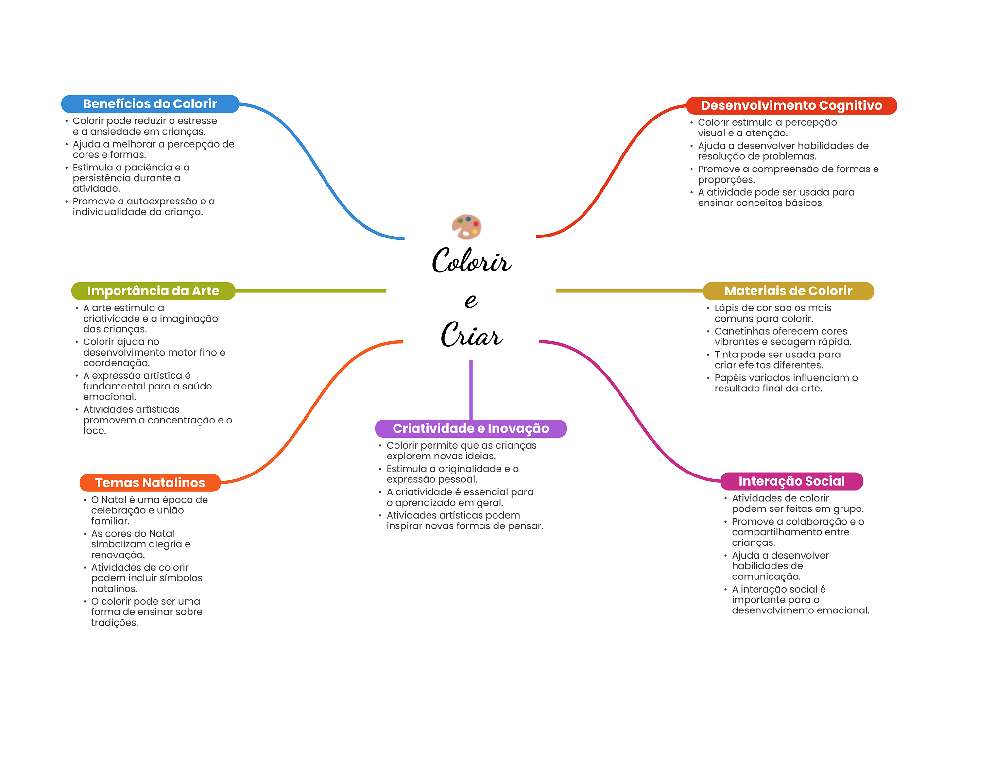 Benefícios do Colorir Desenvolvimento Cognitivo Colorir pode reduzir estresse Colorir estimula a percepção e a ansiedade em crianças. visual e a atenção. Ajuda a melhorar a percepção de Ajuda a desenvolver habilidades de cores e formas. resolução de problemas. Estimula a paciência e a Promove a compreensão de formas e persistência durante a proporções. atividade. A atividade pode ser usada para Promove a autoexpressão e a ensinar conceitos básicos. individualidade da criança. Colorir Importância da Arte Materiais de Colorir A arte estimula a e Lápis de cor são mais criatividade e a imaginação comuns para colorir. das crianças. Criar Canetinhas oferecem cores Colorir ajuda no vibrantes e secagem rápida. desenvolvimento motor fino e Tinta pode ser usada para coordenação. criar efeitos diferentes. A expressão artística é Papéis variados influenciam fundamental para a saúde resultado final da arte. emocional. Atividades artísticas promovem a concentração e foco. Criatividade e Inovação Colorir permite que as crianças explorem novas ideias. Estimula a originalidade e a Temas Natalinos expressão pessoal. Interação Social A criatividade é essencial para Natal é uma época de Atividades de colorir aprendizado em geral. celebração e união podem ser feitas em grupo. familiar. Atividades artísticas podem inspirar novas formas de pensar. Promove a colaboração e As cores do Natal compartilhamento entre simbolizam alegria e crianças. renovação. Ajuda a desenvolver Atividades de colorir habilidades de podem incluir símbolos comunicação. natalinos. A interação social é o colorir pode ser uma importante para forma de ensinar sobre desenvolvimento emocional. tradições.
