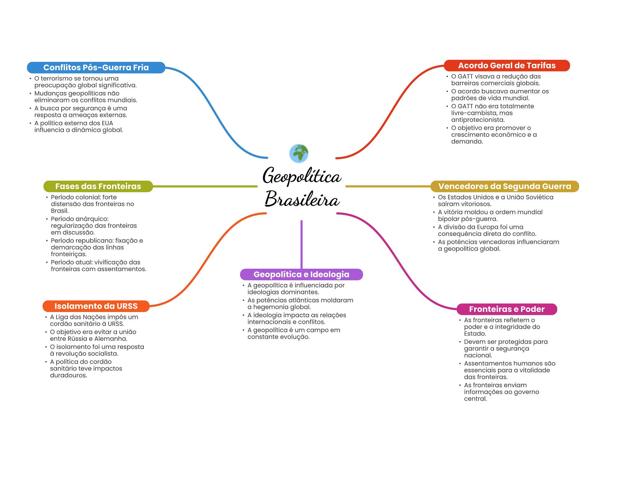 Conflitos Pós-Guerra Fria Acordo Geral de Tarifas o terrorismo se tornou uma GATT visava a redução das preocupação global significativa. barreiras comerciais globais. Mudanças geopolíticas não acordo buscava aumentar eliminaram conflitos mundiais. padrões de vida mundial. A busca por segurança é uma GATT não era totalmente resposta a ameaças externas. livre-cambista, mas A política externa dos EUA antiprotecionista. influencia a dinâmica global. objetivo era promover crescimento econômico e a demanda. Geopolítica Fases das Fronteiras Vencedores da Segunda Guerra Período colonial: forte Brasileira Os Estados Unidos e a União Soviética distensão das fronteiras no saíram vitoriosos. Brasil. A vitória moldou a ordem mundial Período anárquico: bipolar pós-guerra. regularização das fronteiras A divisão da Europa foi uma em discussão. consequência direta do conflito. Período republicano: fixação e As potências vencedoras influenciaram demarcação das linhas a geopolítica global. fronteiriças. Período atual: vivificação das fronteiras com assentamentos. Geopolítica e Ideologia A geopolítica é influenciada por ideologias dominantes. As potências atlânticas moldaram Isolamento da URSS a hegemonia global. Fronteiras e Poder A Liga das Nações impôs um A ideologia impacta as relações cordão sanitário à URSS. internacionais e conflitos. As fronteiras refletem objetivo era evitar a união A geopolítica é um campo em poder e a integridade do Estado. entre Rússia e Alemanha. constante evolução. Devem ser protegidas para isolamento foi uma resposta garantir a segurança à revolução socialista. nacional. A política do cordão Assentamentos humanos são sanitário teve impactos essenciais para a vitalidade duradouros. das fronteiras. As fronteiras enviam informações ao governo central.