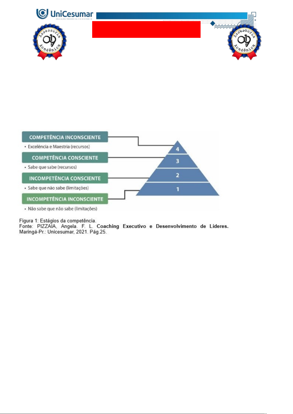 19 9 8773 4238 ATIVIDADE MAPA Esta atividade MAPA propõe que você embarque em uma viagem rumo ao universo do autoconhecimento e autogestão, aspectos fundamentais para o Coaching e para as organizações. Ter a capacidade de reflexão crítica sobre a própria trajetória, identificar a relação entre a teoria (estágios da competência) e a prática (vida acadêmica/profissional) e ser capaz de propor estratégias realistas para o desenvolvimento profissional, é essencial para uma atuação bem sucedida como administrador. Observe a figura a seguir. A figura apresentada demonstra os quatro estágios do processo de aprendizagem segundo Dilts et al. (1980): Incompetência Inconsciente, Incompetência Consciente, Competência Consciente e Competência Inconsciente. Fonte: DILTS, R. et al. Neuro-Linguistic Programming: the study of the structure of subjective experience. California: Meta Publications, v. 1, 1980. Proposta da atividade: Os Estágios da Competência e a Formação do Administrador Considerando sua trajetória acadêmica no curso de Administração e as competências exigidas no mercado de trabalho atual, elabore um texto dissertativo (mínimo de 20 linhas) respondendo às seguintes questões: 1. Como você identifica, em sua experiência acadêmica e prática, situações em que esteve em cada um dos quatro estágios da competência? 2. De que forma a passagem por esses estágios contribuiu (ou ainda pode contribuir) para sua formação como futuro administrador? 3. Escolha uma habilidade essencial para a carreira administrativa (por exemplo: liderança, negociação, gestão de pessoas, planejamento estratégico ou tomada de decisão) e descreva em qual estágio você acredita estar atualmente. 4. Quais estratégias pessoais e profissionais podem ser utilizadas para alcançar a Competência Inconsciente (maestria) nessa habilidade escolhida? Orientações gerais: Para esta atividade, você deverá utilizar o formulário padrão que está disponível no ícone “Material da Disciplina”. Considere as orientações para a atividade MAPA, acessando o link do vídeo explicativo. Não se esqueça de que este é um trabalho acadêmico. Assim, observe as Normas ABNT. Atenção: se identificado plágio (cópia indevida de textos pesquisados, ou cópia textual entre colegas) a atividade poderá ser zerada. Anexe o arquivo no campo de resposta da atividade MAPA, clicando sobre o botão Selecionar arquivo. Após anexar o arquivo, certifique-se de que se trata do arquivo correto, clique no botão Responder e, posteriormente, em Finalizar Questionário (após "Finalizar o Questionário", não será possível reenviar a atividade ou realizar qualquer modificação no arquivo enviado). Tendo dúvidas, não deixe de encaminhá-las por meio do "Fale com o Mediador". Bons estudos! Em caso de dúvidas, encaminhar mensagens pelo Fale com o Mediador! MAPA - ADM - COACHING EXECUTIVO E DESENVOLVIMENTO DE LÍDERES - 54_2025 19 9 8773 4238 ATIVIDADE MAPA 19 9 8773 4238 ATIVIDADE MAPA 19 9 8773 4238 ATIVIDADE MAPA 19 9 8773 4238 ATIVIDADE MAPA about:blank 2/2 image1.jpeg image2.png image3.png