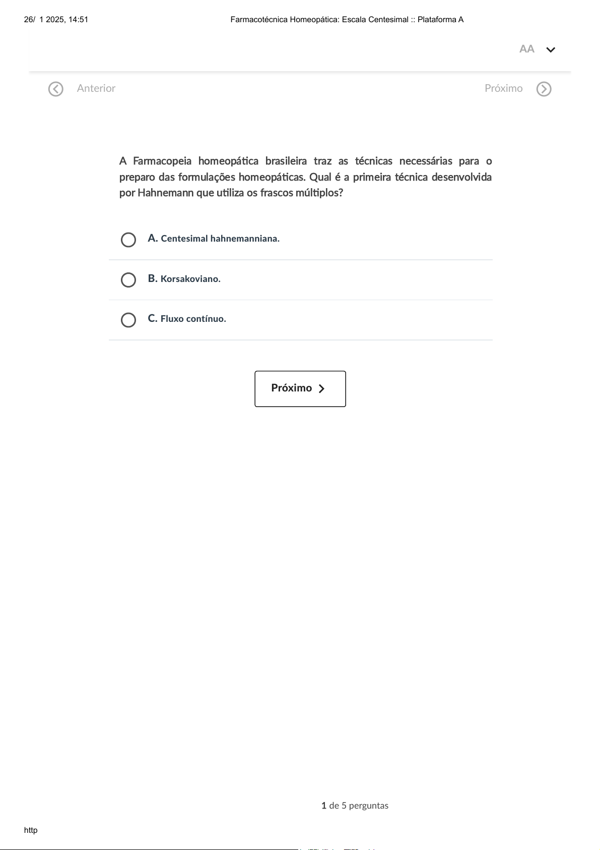 Pré Teste 1. A Farmacopeia homeopática brasileira traz as técnicas necessárias para o preparo das formulações homeopáticas. Qual é a primeira técnica desenvolvida por Hahnemann que utiliza os frascos múltiplos? A. Centesimal hahnemanniana. B. Korsakoviano. C. Fluxo contínuo. Próximo 1 de 5 perguntas Anterior Próximo AA 26/11/2025, 14:51 Farmacotécnica Homeopática: Escala Centesimal :: Plataforma A https://estacio.grupoa.education/sagah/object/default/120768121 1/2 1 de 5 perguntas Anterior Próximo AA 26/11/2025, 14:51 Farmacotécnica Homeopática: Escala Centesimal :: Plataforma A https://estacio.grupoa.education/sagah/object/default/120768121 2/2