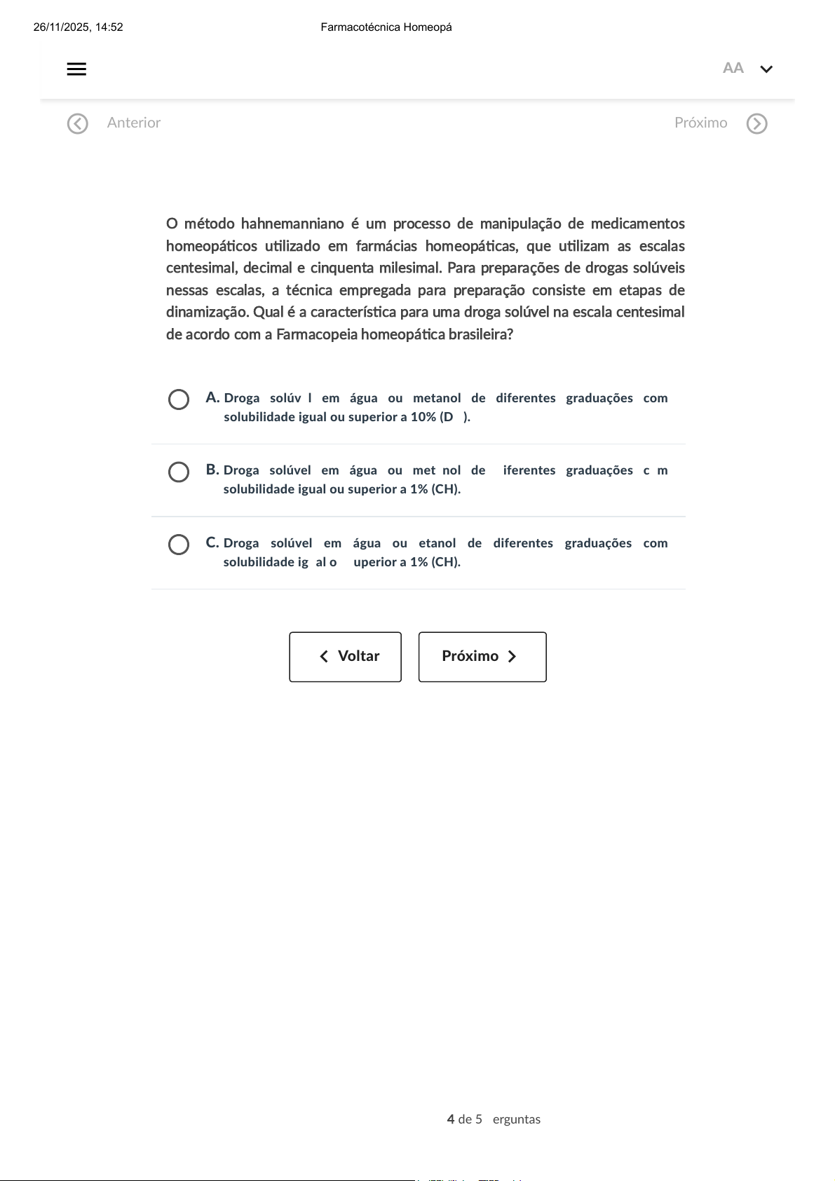 Pré Teste 4. O método hahnemanniano é um processo de manipulação de medicamentos homeopáticos utilizado em farmácias homeopáticas, que utilizam as escalas centesimal, decimal e cinquenta milesimal. Para preparações de drogas solúveis nessas escalas, a técnica empregada para preparação consiste em etapas de dinamização. Qual é a característica para uma droga solúvel na escala centesimal de acordo com a Farmacopeia homeopática brasileira? A. Droga solúvel em água ou metanol de diferentes graduações com solubilidade igual ou superior a 10% (DH). B. Droga solúvel em água ou metanol de diferentes graduações com solubilidade igual ou superior a 1% (CH). C. Droga solúvel em água ou etanol de diferentes graduações com solubilidade igual ou superior a 1% (CH). Voltar Próximo 4 de 5 perguntas Anterior Próximo AA 26/11/2025, 14:52 Farmacotécnica Homeopática: Escala Centesimal :: Plataforma A https://estacio.grupoa.education/sagah/object/default/120768121 1/2 4 de 5 perguntas Anterior Próximo AA 26/11/2025, 14:52 Farmacotécnica Homeopática: Escala Centesimal :: Plataforma A https://estacio.grupoa.education/sagah/object/default/120768121 2/2