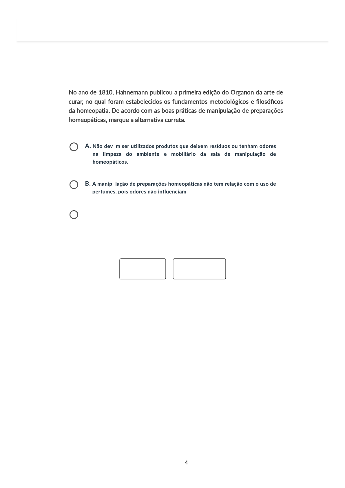 Pós Teste 4. No ano de 1810, Hahnemann publicou a primeira edição do Organon da arte de curar, no qual foram estabelecidos os fundamentos metodológicos e filosóficos da homeopatia. De acordo com as boas práticas de manipulação de preparações homeopáticas, marque a alternativa correta. A. Não devem ser utilizados produtos que deixem resíduos ou tenham odores na limpeza do ambiente e mobiliário da sala de manipulação de homeopáticos. B. A manipulação de preparações homeopáticas não tem relação com o uso de perfumes, pois odores não influenciam na manipulação homeopática. C. Não é necessária uma sala exclusiva para a manipulação de preparações homeopáticas, podendo conciliar com as preparações de semissólidos e líquidos. Voltar Próximo 4 de 5 perguntas Anterior AA 26/11/2025, 14:53 Farmacotécnica Homeopática: Escala Centesimal :: Plataforma A https://estacio.grupoa.education/sagah/object/default/120768121 1/2 4 de 5 perguntas Anterior AA 26/11/2025, 14:53 Farmacotécnica Homeopática: Escala Centesimal :: Plataforma A https://estacio.grupoa.education/sagah/object/default/120768121 2/2