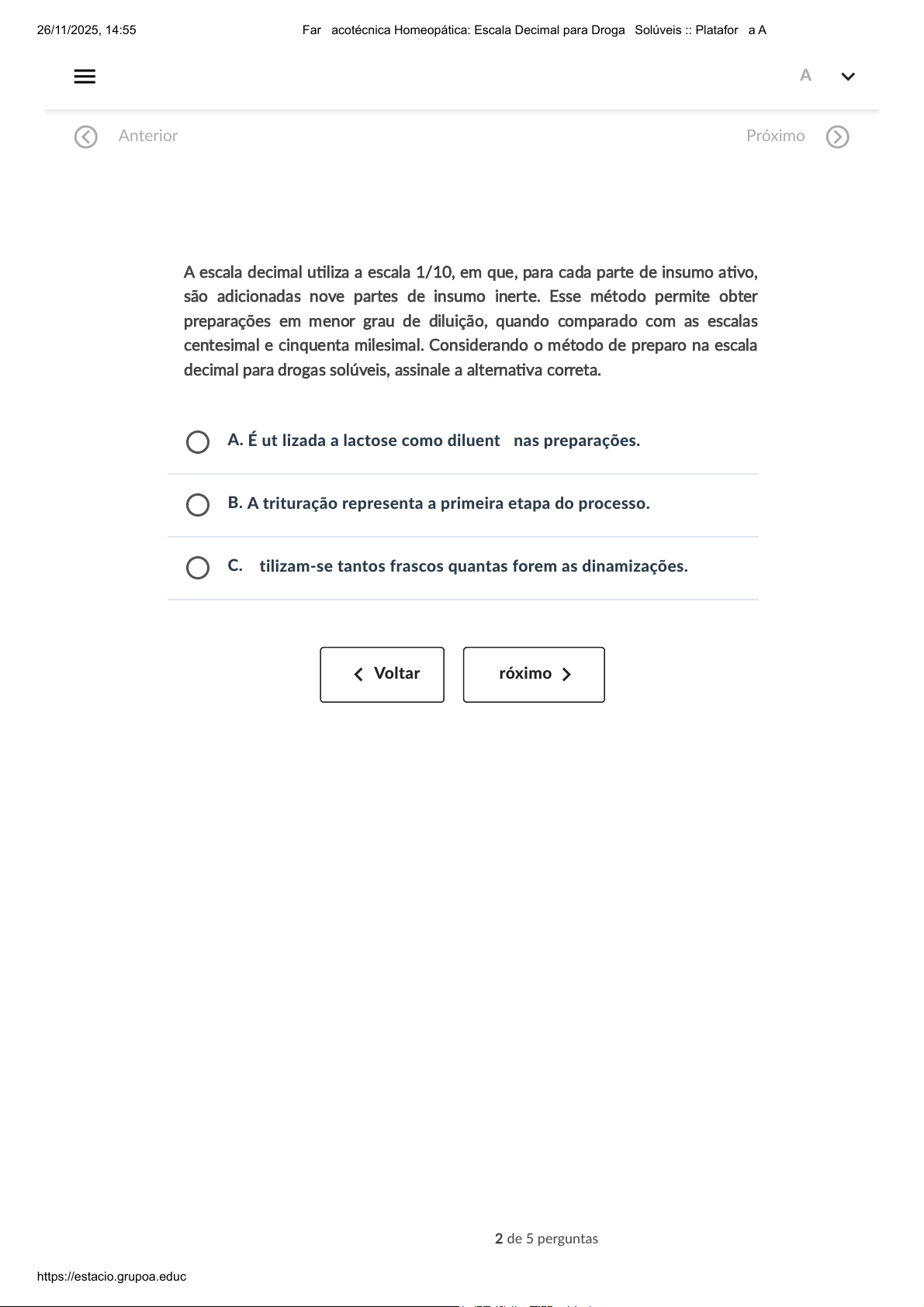 Pré Teste 2. A escala decimal utiliza a escala 1/10, em que, para cada parte de insumo ativo, são adicionadas nove partes de insumo inerte. Esse método permite obter preparações em menor grau de diluição, quando comparado com as escalas centesimal e cinquenta milesimal. Considerando o método de preparo na escala decimal para drogas solúveis, assinale a alternativa correta. A. É utilizada a lactose como diluente nas preparações. B. A trituração representa a primeira etapa do processo. C. Utilizam-se tantos frascos quantas forem as dinamizações. Voltar Próximo 2 de 5 perguntas Anterior Próximo AA 26/11/2025, 14:55 Farmacotécnica Homeopática: Escala Decimal para Drogas Solúveis :: Plataforma A https://estacio.grupoa.education/sagah/object/default/120768599 1/2 2 de 5 perguntas Anterior Próximo AA 26/11/2025, 14:55 Farmacotécnica Homeopática: Escala Decimal para Drogas Solúveis :: Plataforma A https://estacio.grupoa.education/sagah/object/default/120768599 2/2