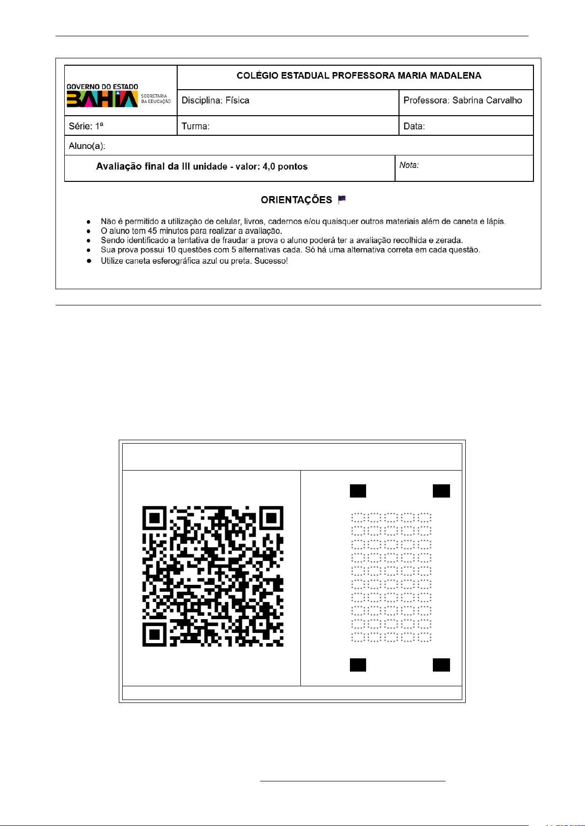 Página 1 de 4 Marque o gabarito preenchendo completamente a região de cada alternativa. a b c d e Q.1: Q.2: Q.3: Q.4: Q.5: Q.6: Q.7: Q.8: Q.9: Q.10: a b c d e Prova: 2671438.0 Verifique as respostas em: www.gradepen.com/?ansid=2671438.0 www.gradepen.com/?ansid=2671438.0 Página 2 de 4 Q.1 (0.40) - A tendência que um corpo apre- senta de manter seu estado de movimento reti- líneo ou repouso é conhecida como: a) ( ) aceleração b) ( ) impulso c) ( ) velocidade d) ( ) força e) ( ) inércia Q.2 (0.40) - Um nadador, conforme mostrado na figura, imprime uma força com as mãos na água (F1) trazendo-a na direção de seu tórax. A água, por sua vez, imprime uma força no na- dador (F2) para que ele se mova para frente du- rante o nado. Assinale a resposta correta: a) ( ) O nadador poderá mover-se, pois a força que ele aplica na água é maior do que a resultante das forças que a água aplica sobre ele. b) ( ) Esse princípio obedece à Lei da Inércia, uma vez que o nadador permanece em seu estado de movimento. c) ( ) Obedecendo à Lei da Ação e Reação, o nadador imprime uma força na água para trás e a água, por sua vez, empurra- o para frente. d) ( ) Nesse caso, é o nadador que puxa seu corpo, aplicando uma força nele próprio para se movimentar sobre a água. e) ( ) O nadador puxa a água e a água empurra o nadador, obedecendo à Lei das Forças (segunda Lei de Newton). Q.3 (0.40) - Uma patinadora empurra uma pa- rede com uma força de 50 N. Qual é a força que a parede exerce sobre a patinadora, de acordo com as Leis de Newton? a) ( ) Uma força de 50 N na direção oposta ao empurrão. b) ( ) Uma força menor que 50 N, devido à re- sistência da parede. c) ( ) Uma força maior que 50 N, devido à re- sistência da parede. d) ( ) Nenhuma força, pois a parede é um ob- jeto imóvel. e) ( ) Uma força de 50 N na mesma direção do empurrão. Q.4 (0.40) - A Primeira Lei de Newton, ou Lei da Inércia, afirma que um corpo tende a perma- necer em seu estado de movimento (repouso ou movimento retilíneo uniforme) a menos que uma força resultante não nula atue sobre ele. Qual situação abaixo é um exemplo da Lei da Inér- cia? a) ( ) Um carro acelerando em uma pista. b) ( ) A atração gravitacional entre a Terra e a Lua. c) ( ) Um livro caindo de uma mesa. d) ( ) Um passageiro sendo projetado para frente quando um ônibus freia brusca- mente. e) ( ) Um foguete sendo lançado para o espaço. Q.5 (0.40) - Com base nos estudos sobre as leis de Newton, determine como V (verdadeira) ou F (falsa) cada uma das proposições abaixo. Marque no gabarito todas as alternativas verda- deiras. a) ( ) ( )A segunda lei de Newton afirma que a força resultante de um corpo é igual a massa desse corpo multiplicada pela ace- leração. b) ( ) ( ) A primeira lei de Newton é conhe- cida como princípio fundamental da di- nâmica. c) ( ) ( ) A segunda lei de Newton, também conhecida como lei da inércia, se refere aos corpos em movimento sem a ação de uma força. Verifique as respostas em: www.gradepen.com/?ansid=2671438.0 www.gradepen.com/?ansid=2671438.0 Página 3 de 4 d) ( ) ( )A terceira lei de Newton, conhecida como lei de ação e reação, se refere ao vínculo entre as forças de interação en- tre dois corpos. Q.6 (0.40) - Um burro puxa uma carroça. Um observador comenta:“De acordo com a terceira lei de Newton, a carroça exerce sobre o burro uma força igual e oposta à força que o burro exerce sobre a carroça. Sendo assim, essas for- ças se cancelam, e a carroça nunca deveria se mover.”O comentário do observador está cor- reto? a) ( ) Não, está incorreto, porque as forças de ação e reação atuam em corpos diferen- tes, portanto não se cancelam. b) ( ) Não, está incorreto, porque na realidade não existe força da carroça sobre o burro. c) ( ) Não, está incorreto, porque a força que a carroça exerce sobre o burro é maior que a força que o burro exerce sobre a carroça. d) ( ) Sim, está correto, mas a carroça só se move porque o atrito reduz a força da reação. e) ( ) Sim, está correto, porque as forças de ação e reação sempre se anulam. Q.7 (0.40) - (PBD25) Um livro está parado so- bre uma mesa. De acordo com a Primeira Lei de Newton, o que acontece com o livro se nenhuma força externa atuar sobre ele? a) ( ) Ele começará a se mover. b) ( ) Ele se deslocará para o lado mais leve da mesa. c) ( ) Ele cairá no chão. d) ( ) Ele permanecerá em repouso. e) ( ) Ele vibrará levemente. Q.8 (0.40) - Com base nas informações a se- guir, marque com V as verdadeiras e com F as falsas. Marque no gabarito todas as alternativas verdadeiras. a) ( ) A primeira Lei de Newton afirma que há uma Conservação da Energia do sistema, tal que a energia total de um sistema isolado permanece constante ao longo do tempo. b) ( ) A segunda Lei de Newton estabelece que uma força é produzida quando ocorre uma interação entre dois corpos tendo como consequência uma mudança na inércia do corpo. c) ( ) De acordo com as Leis de Newton, uma força é a quantidade de energia transfe- rida para um objeto devido à inércia. d) ( ) A Terceira Lei de Newton afirma que a força de ação é sempre maior que a força de reação. e) ( ) A Segunda Lei de Newton afirma que a aceleração de um objeto é diretamente proporcional à força resultante e inver- samente proporcional à sua massa. Q.9 (0.40) - Qual das forças abaixo é res- ponsável por atrair os corpos para o centro da Terra? a) ( ) Força peso. b) ( ) Forças internas. c) ( ) Força elástica d) ( ) Forças externas. e) ( ) Força de atrito. Q.10 (0.40) - Durante um treino intenso, Goku acerta um soco em um saco de pancadas com 40 kg de massa, fazendo-o acelerar a 2 m/s². Qual o valor da força aplicada por ele? a) ( ) 80 N b) ( ) 25 N c) ( ) 5 N d) ( ) 10 N e) ( ) 50 N Verifique as respostas em: www.gradepen.com/?ansid=2671438.0 www.gradepen.com/?ansid=2671438.0 Página 1 de 4 Marque o gabarito pr