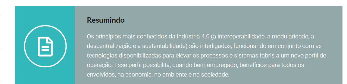 Resumindo Os princípios mais conhecidos da Indústria 4.0 (a interoperabilidade, a modularidade, a descentralização e a sustentabilidade) são interligados, funcionando em conjunto com as tecnologias disponibilizadas para elevar processos e sistemas fabris a um novo perfil de operação. Esse perfil possibilita, quando bem empregado, benefícios para todos envolvidos, na economia, no ambiente e na sociedade.