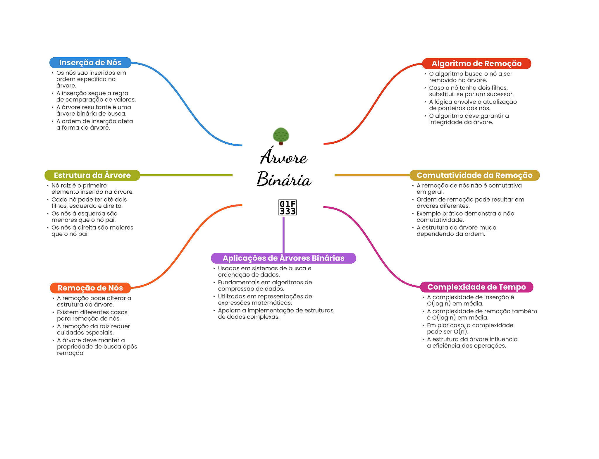 Inserção de Nós Algoritmo de Remoção Os nós são inseridos em algoritmo busca nó a ser ordem específica na removido na árvore. árvore. Caso nó tenha dois filhos, A inserção segue a regra substitui-se por um sucessor. de comparação de valores. A lógica envolve a atualização A árvore resultante é uma de ponteiros dos nós. árvore binária de busca. algoritmo deve garantir a A ordem de inserção afeta integridade da árvore. a forma da árvore. Árvore Estrutura da Árvore Binária Comutatividade da Remoção Nó raiz é primeiro A remoção de nós não é comutativa elemento inserido na árvore. em geral. Cada nó pode ter até dois Ordem de remoção pode resultar em filhos, esquerdo e direito. 01F árvores diferentes. Os nós à esquerda são 333 Exemplo prático demonstra a não menores que nó pai. comutatividade. Os nós à direita são maiores A estrutura da árvore muda que nó pai. dependendo da ordem. Aplicações de Binárias Usadas em sistemas de busca e ordenação de dados. Fundamentais em algoritmos de Remoção de Nós compressão de dados. Complexidade de Tempo A remoção pode alterar a Utilizadas em representações de A complexidade de inserção é estrutura da árvore. expressões matemáticas. O(log n) em média. Existem diferentes casos Apoiam a implementação de estruturas A complexidade de remoção também para remoção de nós. de dados complexas. é O(log n) em média. A remoção da raiz requer Em pior caso, a complexidade cuidados especiais. pode ser O(n). A árvore deve manter a A estrutura da árvore influencia propriedade de busca após a eficiência das operações. remoção.