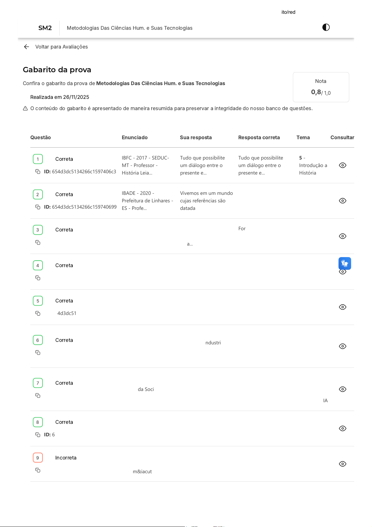 Voltar para Avaliações Gabarito da prova Confira o gabarito da prova de Metodologias Das Ciências Hum. e Suas Tecnologias Realizada em 26/11/2025 Nota 0,8/ 1,0 O conteúdo do gabarito é apresentado de maneira resumida para preservar a integridade do nosso banco de questões. Questão Enunciado Sua resposta Resposta correta Tema Consultar Correta ID: 654d3dc5134266c1597406c3 IBFC - 2017 - SEDUC- MT - Professor - História Leia... Tudo que possibilite um diálogo entre o presente e... Tudo que possibilite um diálogo entre o presente e... 5 - Introdução a História Correta ID: 654d3dc5134266c159740699 IBADE - 2020 - Prefeitura de Linhares - ES - Profe... Vivemos em um mundo cujas referências são datadas,... Vivemos em um mundo cujas referências são datadas,... 5 - Introdução a História Correta ID: 654d3dc5134266c15974066f FCC - 2018 - TRT - 2ª REGIÃO (SP) - Analista Judic... Formular perguntas aos documentos e forçá-los a da... Formular perguntas aos documentos e forçá-los a da... 5 - Introdução a História Correta ID: 654d3dc5134266c159740e97 A Base Nacional Comum Curricular preconiza que, no... 15 a 17 anos 15 a 17 anos 6 - Introdução a Geografia Correta ID: 654d3dc5134266c159740e8b O território é um organismo histórico e, por conse... II, III e IV II, III e IV 6 - Introdução a Geografia Correta ID: 654be5a9b5168ccb746651cc Quais episódios históricos têm relação estreita co... Revolução Industrial e Iluminismo. Revolução Industrial e Iluminismo. 7 - INTRODUÇÃO A SOCIOLOGIA Correta ID: 66215621dcb34ece12a30042 Durante os estudos iniciais da Sociologia, diverso... Auguste Comte é reconhecido por criar o ter... Auguste Comte é reconhecido por criar o ter... 7 - INTRODUÇÃO A SOCIOLOGIA Correta ID: 654be644b5168ccb74672e85 Na Internet, ela é uma rede social criada e... Facebook. Facebook. 8 - Sociedade em rede Incorreta ID: 654be644b5168ccb74672e73 UFSCAR 2007 Esse mundo novo de exterm&iacut... dos romenos no seu processo de independência... dos judeus durante a vigência do nazismo. 8 - Sociedade em rede 1 2 3 4 5 6 7 8 9 SM2 Metodologias Das Ciências Hum. e Suas Tecnologias 26/11/25, 21:50 estacio.saladeavaliacoes.com.br/prova/69279deb2ad2e38f37db6fe2/gabarito/reduzido/ https://estacio.saladeavaliacoes.com.br/prova/69279deb2ad2e38f37db6fe2/gabarito/reduzido/ 1/2 https://estacio.saladeavaliacoes.com.br/avaliacoes/ Incorreta ID: 682d259ba8989eee3bcc0a5a Uma das competências da Geografia no ensino ... Incentivar exclusivamente práticas individu... Desenvolver políticas públicas que a... 6 - Introdução a Geografia 10 Encontrou algum problema? Você pode copiar o ID da questão e abrir um requerimento. Na tela inicial do Campus Virtual (SIA), acesse "Atendimento > Requerimento > Novo > Currículo/Aula/horário > Analisar ambiente de avaliação/exercícios" 26/11/25, 21:50 estacio.saladeavaliacoes.com.br/prova/69279deb2ad2e38f37db6fe2/gabarito/reduzido/ https://estacio.saladeavaliacoes.com.br/prova/69279deb2ad2e38f37db6fe2/gabarito/reduzido/ 2/2