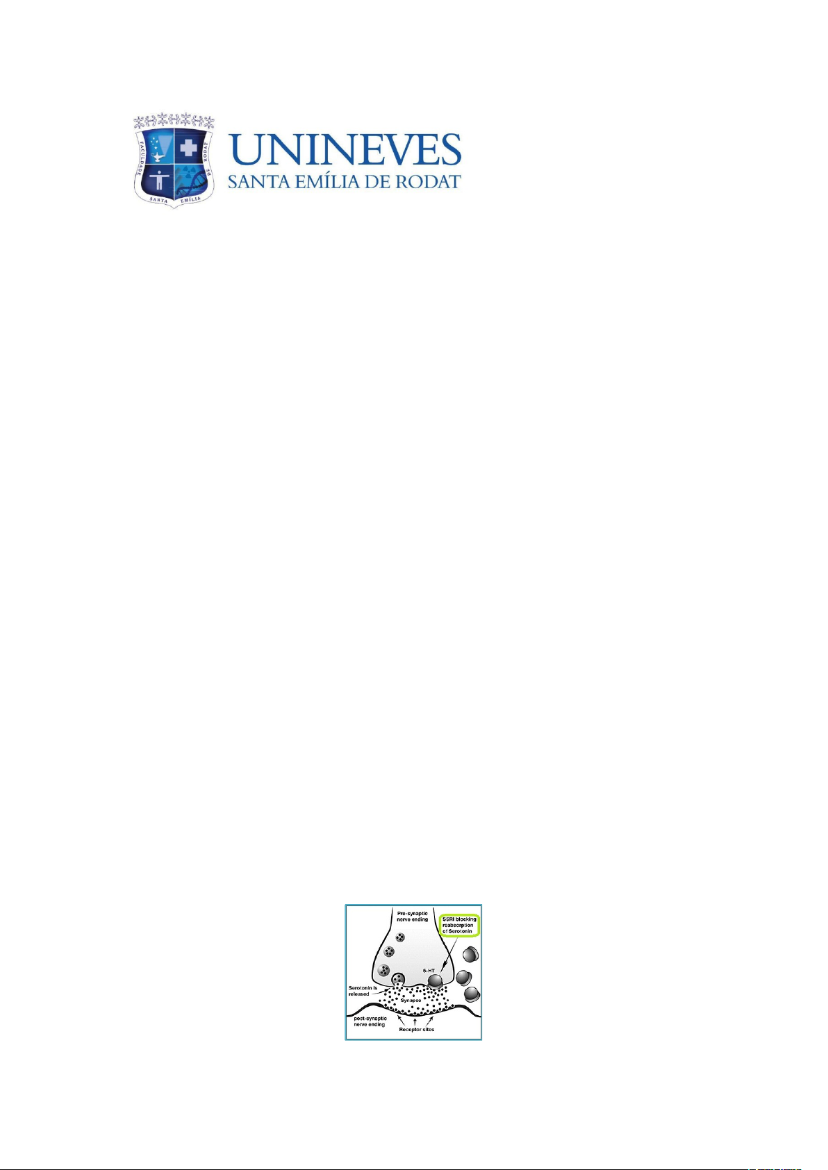 Curso: Biomedicina Disciplina: farmacologia Professor: Alexsandro F Marinho Aluno: Kallyne Caetano da silva LISTA DE EXERCÍCIOS 02 1) Fábio é motorista há mais de 10 anos e trabalha dirigindo um caminhão de carga. Procurou o médico por estar sofrendo de insônia que o receitou com Rivotril 0,25 mg, de uso sublingual, antes de dormir. Responda: a) A que classe pertence este medicamento? Ansiolíticos e hipnóticos (Benzodiazepínicos). b) Quais cuidados que Fábio deve tomar no uso deste medicamento? Os cuidados estão em ingerir a quantidade recomendada, não usar em consonância com medicamentos ou outras drogas como (álcool ) que diminuíam ou potencialize a ação do medicamento, além de não interromper abruptamente o uso para não desenvolver dependência física e psicológica. c) Qual seria a interação do uso do álcool com o Rivotril? Potencialização da capacidade de sedação do medicamento. 2) Uma pessoa viciada em bebida alcoólica procurou ajuda médica para sair do vício. O médico receitou o medicamento dissulfiram. Qual o mecanismo de ação deste fármaco? (2,0). O dissulfiram é um inibidor irreversível e inespecífico de enzimas, que decompõe o álcool no estágio de acetaldeído, ao inibir a enzima acetaldeído-desidrogenase (ALDH), ocorre um acúmulo de acetaldeído no organismo, levando à reação etanol-dissulfiram. 3) Os sintomas da depressão são sensações intensas de melancolia, desesperança e desespero, bem como incapacidade de sentir prazer em atividades usuais, alterações os padrões de sono e apetite, perda de vigor e pensamentos suicidas. Tomando como base a figura abaixo, descreva o mecanismo de ação dos antidepressivos (2,0). O neurônio pré-sináptico (neurônio transmissor) produz um neurotransmissor e faz seu empacotamento, formando vesículas sinápticas, quando um impulso nervoso chega à terminação do axônio, ocorre a liberação, por exocitose, dos neurotransmissores, os quais se difundem pela fenda sináptica (pequeno espaço que separa o neurônio pré-sináptico da célula-alvo) e chegam até a célula-alvo (célula pós-sináptica), desencadeando o potencial pós-sináptico. Para afetar a célula pós-sináptica, o neurotransmissor irá se ligar a um receptor específico, desencadeando uma resposta. 4) De acordo com as figuras A e B abaixo responda as perguntas (2,0): A) B) a) Como se classificam os receptores das figuras A e B? Canais iônicos ativados por ligantes (canais ionotrópicos ). b) Nas figuras A e B o neurotransmissor é excitatório ou inibitório? Cite-os. Na figura A é excitatório, e na figura B inibitório. c) Quais os íons que estão sofrendo influência dos neurotransmissores nas figuras? Sódio na figura A e cloro na figura B . d) O que ocorre com a membrana plasmática após a ligação dos neurotransmissores e a entrada dos íons? Após a entrada de íons, ocorre alteração de cargas dentro e na membrana externa da célula, podendo ocorrer despolarização (figura A) ou hiperpolarização (figura B), a entrada de íons pode permitir um maior ou menor estímulo da célula, resultando em uma resposta específica. 5) A ansiedade é um estado desagradável de tensão, apreensão e inquietação, um medo de origem às vezes desconhecida. Os sintomas físicos da ansiedade grave são: taquicardia, sudoração, tremores e palpitações. Os benzodiazepínicos são os fármacos ansiolíticos mais usados. De acordo com a figura abaixo, descreva o mecanismo de ação dos fármacos benzodiazepínicos (2,0). o gaba abre o canal de íons cloro. O fármaco potencializa a ação do gaba , permitindo uma maior entrada de cloro. O cloro hiperpolariza (maior resistência a despolarização ) a célula devido a ligação do gaba na célula. image5.png image1.png image2.png image3.png image4.png