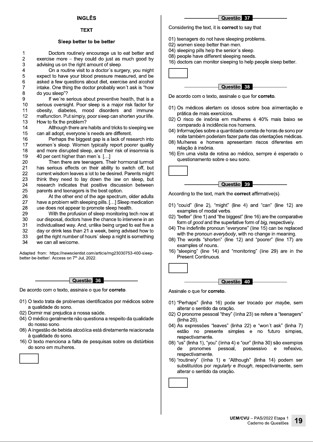 INGLÊS Questão 37 TEXT Considering the text, it is correct to say that Sleep better to be better 01) teenagers do not have sleeping problems. 02) women sleep better than men. 1 Doctors routinely encourage us to eat better and 04) sleeping pills help the senior's sleep. 2 exercise more they could do just as much good by 08) people have different sleeping needs. 3 advising us on the right amount of sleep. 16) doctors can monitor sleeping to help people sleep better. 4 On a routine visit to a doctor's surgery, you might 5 expect to have your blood pressure measured, and be 6 asked a few questions about diet, exercise and alcohol 7 intake. One thing the doctor probably won't ask is "how Questão 38 8 do you sleep"? 9 De acordo com o texto, assinale o que for correto. If we're serious about preventive health, that is a 10 serious oversight. Poor sleep is a major risk factor for 11 01) Os médicos alertam idosos sobre boa alimentação e obesity, diabetes, mood disorders and immune 12 malfunction. Put simply, poor sleep can shorten your life. prática de mais exercícios. 13 How to fix the problem? 02) O risco de insônia em mulheres é 40% mais baixo se 14 Although there are habits and tricks to sleeping we comparado à incidência nos homens. 15 04) Informações sobre a quantidade correta de horas de sono por can all adopt, everyone's needs are different. 16 Perhaps the biggest gap is a lack of research into noite também poderiam fazer parte das orientações médicas. 17 08) Mulheres e homens apresentam riscos diferentes em women's sleep. Women typically report poorer quality 18 and more disrupted sleep, and their risk of insomnia is relação à insônia. 19 40 per cent higher than men's. [...] 16) Em uma visita de rotina ao médico, sempre é esperado o 20 Then there are teenagers. Their hormonal turmoil questionamento sobre o seu sono. 21 has serious effects on their ability to switch off, but 22 current wisdom leaves a lot to be desired. Parents might 23 think they need to lay down the law on sleep, but 24 research indicates that positive discussion between Questão 39 25 parents and teenagers is the best option. 26 According to the text, mark the correct affirmative(s). At the other end of the age spectrum, older adults 27 have a problem with sleeping pills. [...] Sleep medication 28 use does not appear to promote sleep health. 01) "could" (line 2), "might" (line 4) and "can" (line 12) are 29 examples of modal verbs. With the profusion of sleep monitoring tech now at 30 our disposal, doctors have the chance to intervene in an 02) "better" (line 1) and "the biggest" (line 16) are the comparative 31 individualised way. And, unlike being urged to eat five a form of good and the superlative form of big, respectively. 32 day or drink less than 21 a week, being advised how to 04) The indefinite pronoun "everyone" (line 15) can be replaced 33 get the right number of hours' sleep a night is something with the pronoun everybody, with no change in meaning. 34 we can all welcome. 08) The words "shorten" (line 12) and "poorer" (line 17) are examples of nouns. Adapted from: https://newscientist.com/article/mg23030753-400-sleep- 16) "sleeping" (line 14) and "monitoring" (line 29) are in the better-be-better/. Access on 7th Jul, 2022. Present Continuous. Questão 36 Questão 40 De acordo com o texto, assinale o que for correto. Assinale o que for correto. 01) texto trata de problemas identificados por médicos sobre 01) "Perhaps" (linha 16) pode ser trocado por maybe, sem a qualidade do sono. alterar o sentido da oração. 02) Dormir mal prejudica a nossa saúde. 02) O pronome pessoal "they" (linha 23) se refere a "teenagers" 04) médico geralmente não questiona a respeito da qualidade (linha 20). do nosso sono. 04) As expressões "leaves" (linha 22) e "won't ask" (linha 7) 08) A ingestão de bebida alcoólica está diretamente relacionada estão no presente simples e no futuro simples, à qualidade do sono. respectivamente. 16) texto menciona a falta de pesquisas sobre os distúrbios 08) "us" (linha 1), "you" (linha 4) e "our" (linha 30) são exemplos do sono em mulheres. de pronomes pessoal, possessivo e reflexivo, respectivamente. 16) "routinely" (linha 1) e "Although" (linha 14) podem ser substituídos por regularly e though, respectivamente, sem alterar o sentido da oração. UEM/CVU PAS/2022 Etapa 1 Caderno de Questões 19