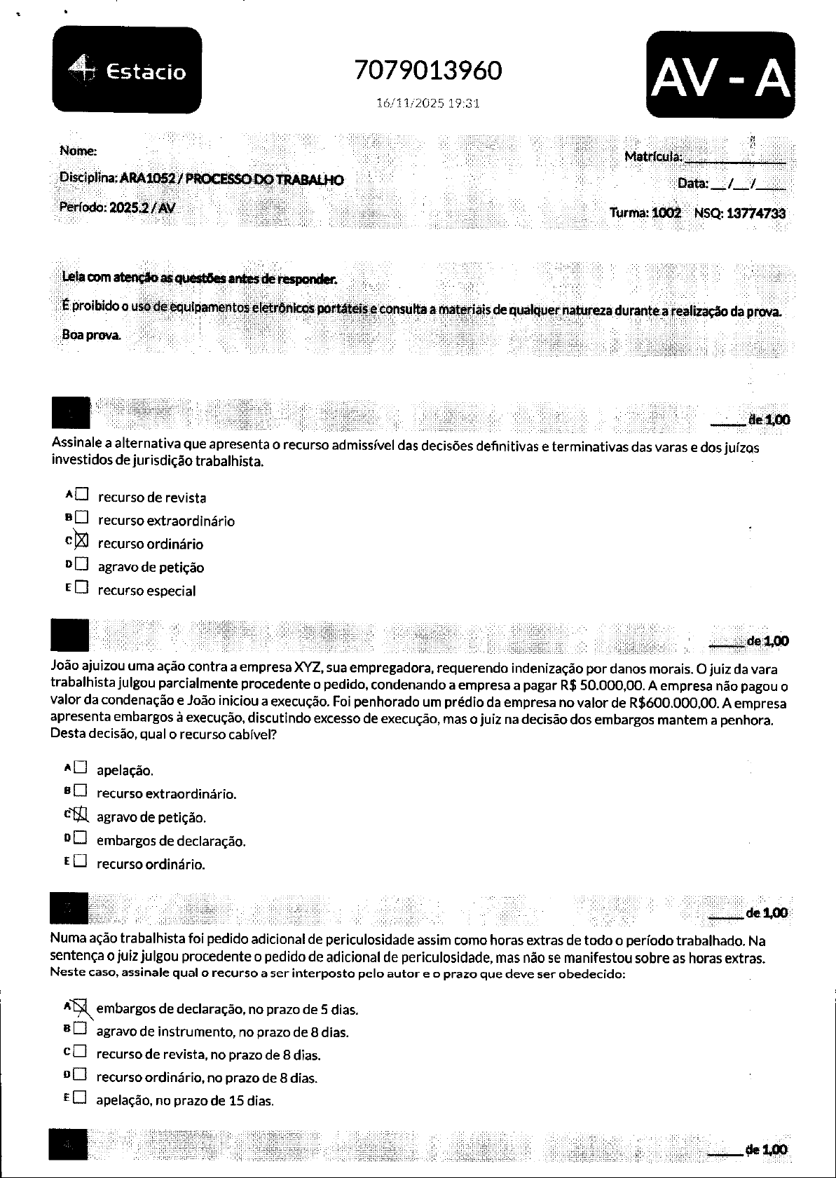 Estácio 7079013960 AV - A 16/11/2025 19:31 Nome: Matrícula: Disciplina: ARA1052 / PROCESSO DO TRABALHO Data: / / Período: 2025.2 / AV Turma: 1002 NSQ: 13774733 Lela com atenção as questões antes de responder. É proibido uso de equipamentos eletrônicos portáteis e consulta a materiais de qualquer natureza durante a realização da prova. Boa prova. de 1,00 Assinale a alternativa que apresenta recurso admissível das decisões definitivas e terminativas das varas e dos juízas investidos de jurisdição trabalhista. A recurso de revista B recurso extraordinário C recurso ordinário D agravo de petição E recurso especial de 1,00 João ajuizou uma ação contra a empresa XYZ, sua empregadora, requerendo indenização por danos morais. O juiz da vara trabalhista julgou parcialmente procedente pedido, condenando a empresa a pagar R$ 50.000,00. A empresa não pagou o valor da condenação e João iniciou a execução. Foi penhorado um prédio da empresa no valor de R$600.000,00. A empresa apresenta embargos à execução, discutindo excesso de execução, mas o juiz na decisão dos embargos mantem a penhora. Desta decisão, qual recurso cabível? A apelação. recurso extraordinário. agravo de petição. D embargos de declaração. E recurso ordinário. de 1,00 Numa ação trabalhista foi pedido adicional de periculosidade assim como horas extras de todo período trabalhado. Na sentença juiz julgou procedente pedido de adicional de periculosidade, mas não se manifestou sobre as horas extras. Neste caso, assinale qual o recurso a ser interposto pelo autor e prazo que deve ser obedecido: A embargos de declaração, no prazo de 5 dias. agravo de instrumento, no prazo de 8 dias. C recurso de revista, no prazo de 8 dias. D recurso ordinário, no prazo de 8 dias. E apelação, no prazo de 15 dias. dePedro ajuizou reclamação trabalhista em face de seu ex empregador, pleiteando horas extras não pagas. O juiz apenas decidiu ouvir o depoimento de uma testemunha, apesar de Pedro ter levado duas. Quanto à esta decisão, assinale a alternativa correta: A esta é uma decisão definitiva não recorrível de imediato, podendo ser discutida em preliminar de recurso ordinário. esta é uma decisão definitiva, irrecorrível, e o advogado nada pode fazer. esta é uma decisão interlocutória não recorrível de imediato, podendo ser discutida em preliminar de recurso ordinário. D esta é uma decisão interlocutória, recorrível de imediato por agravo de instrumento. E esta é uma decisão definitiva não recorrível de imediato, podendo ser discutida em preliminar de recurso de apelação. 5. de 1,00 José ajuizou reclamação trabalhista em face da empresa M&M S/A postulando horas extras e reflexos. Na audiência, empregador se fez substituir pelo preposto que era conhecedor dos fatos, mas não possuía vínculo trabalhista ou societário. advogado do reclamante requereu a revelia e confissão ficta, o que foi pelo juiz pelo fato de o preposto não ser empregado da reclamada. Quanto a esta situação, assinale a alternativa correta: A juiz está errado porque o preposto não precisa ser empregado da reclamada, mas apenas conhecedor dos fatos. juiz está correto porque o preposto precisa ser empregado da reclamada, mas não conhecedor dos fatos. c juiz está correto porque o preposto não precisa ser empregado da reclamada nem conhecedor dos fatos. D juiz está correto porque o preposto precisa ser empregado da reclamada e conhecedor dos fatos. E juiz está errado porque o preposto não precisa ser empregado da reclamada, nem conhecedor dos fatos. 6. de 1,00 Numa ação trabalhista proposta por Marcos, há um pedido de insalubridade em grau máximo. O juiz determinou a realização de prova pericial e indicou o perito. Quanto à prova pericial, assinale a alternativa correta: As partes podem indicar assistentes técnicos, cujos honorários serão pagos pela parte que indicar. Apenas o juiz pode a pedido das partes indicar assistentes técnicos para acompanhar o trabalho do perito. As partes podem indicar assistentes técnicos, cujos honorários serão pagos pelo Poder Público, no caso de beneficiário da gratuidade de justiça. D As partes podem indicar assistentes técnicos, cujos honorários serão pagos pela parte que sucumbir no objeto da perícia. E As partes não podem indicar assistentes técnicos para acompanhar o trabalho do perito. 7. de 1,00 (XXVII Exame Unificado OAB/FGV) Juca ajuizou ação trabalhista em face da sua ex-empregadora, empresa privada do ramo de mineração. Paulo também ajuizou ação, mas em face de seu ex-empregador, uma empresa de prestação de serviços, e do Município de Nova Iguaçu, no Rio de Janeiro, para quem prestou serviços, requerendo a responsabilização subsidiária. Os respectivos advogados atribuíram valor correspondente a 20 salários mínimos à causa de Juca e de 15 salários mínimos à causa de Paulo. Diante disso, assinale a afirmativa correta. A Ambas as causas correrão sob o procedimento ordinário. B Ambas as causas correrão sob o procedimento sumaríssimo. Nehuma das causas correrão sob o procedimento sumaríssimo. D A causa de Juca correrá sob procedimento sumaríssimo e a de Paulo, sob o ordinário. E A causa de Juca correrá sob o procedimento ordinário e a de Paulo, sob o sumaríssimo. 8. de 1,00 Ano: 2015 Banca: VUNESP Órgão: HCFMUSP Prova: VUNESP 2015 HCFMUSP Direito na Área da Saúde Pública O pedido, nas reclamações trabalhistas enquadradas no procedimento sumaríssimo,A deverá ser nos termos do apurado na fase probatória. deverá ser incerto ou determinado e indicará valor correspondente. deverá ser certo ou determinado, não havendo necessidade de indicação do valor da causa. D deverá ser certo ou determinado e indicará o valor correspondente. E deverá ser certo ou indeterminado e indicará o valor correspondente. 9. de 1,00 São órgãos que compõem a Justiça do Trabalho: VT TRT TST A Juízes do Trab