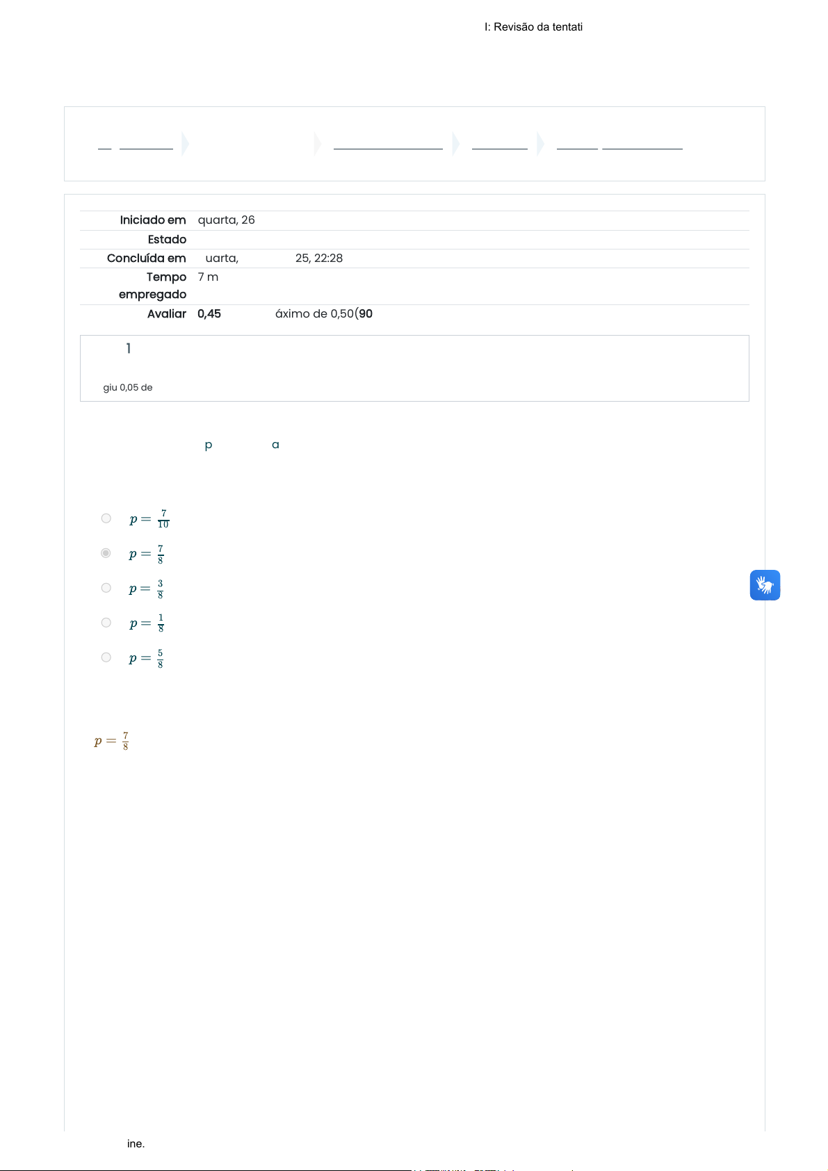Página inicial Minhas disciplinas 2025/4 - Estatística UNIDADE II AVALIAÇÃO-UNIDADE II Iniciado em quarta, 26 nov 2025, 22:20 Estado Finalizada Concluída em quarta, 26 nov 2025, 22:28 Tempo empregado 7 minutos 39 segundos Avaliar 0,45 de um máximo de 0,50(90%) Questão 1 Correto Atingiu 0,05 de 0,05 Um lote é formado por dez peças boas, quatro com defeitos e duas com defeitos graves. Uma peça é escolhida ao acaso. Qual é a probabilidade de que ela não tenha defeitos graves? a. b. c. d. e. p = 7 10 p = 7 8 p = 3 8 p = 1 8 p = 5 8 A resposta correta é: p = 7 8 26/11/2025, 21:30 AVALIAÇÃO-UNIDADE II: Revisão da tentativa https://ambienteonline.uninga.br/mod/quiz/review.php?attempt=4269883&cmid=1036012 1/7 https://ambienteonline.uninga.br/ https://ambienteonline.uninga.br/course/view.php?id=37214 https://ambienteonline.uninga.br/course/view.php?id=37214§ion=3 https://ambienteonline.uninga.br/mod/quiz/view.php?id=1036012 Questão 2 Correto Atingiu 0,05 de 0,05 Questão 3 Correto Atingiu 0,05 de 0,05 A duração de um certo componente eletrônico tem média de 850 dias e desvio padrão de 40 dias. Sabendo que a duração é normalmente distribuída, a probabilidade de esse componente durar entre 700 e 1.000 dias é de: a. 0,8000 b. 0,9000 c. 0,9998 d. 0,8998 e. 0,7898 A resposta correta é: 0,9998 Um casal planeja ter três filhos. Determine a probabilidade de nascer dois homens e uma mulher. a. b. c. d. e. p = 1 8 p = 7 8 p = 5 8 p = 3 5 p = 3 8 A resposta correta é: p = 3 8 26/11/2025, 21:30 AVALIAÇÃO-UNIDADE II: Revisão da tentativa https://ambienteonline.uninga.br/mod/quiz/review.php?attempt=4269883&cmid=1036012 2/7 Questão 4 Correto Atingiu 0,05 de 0,05 Questão 5 Correto Atingiu 0,05 de 0,05 Para um período recente de 100 anos, houve 530 furacões oriundos do Atlântico (com base em dados do Department of Geography and Environmental Systems da University of Maryland). Suponha que a distribuição de Poisson seja um modelo adequado. Assinale a alternativa correta que corresponde a , o número médio de furacões por ano. a. b. c. d. e. μ μ = 5, 3 μ = 100, 3 μ = 53, 3 μ = 53 μ = 10, 3 A resposta correta é: μ = 5, 3 Uma loja dispõe de 12 geladeiras do mesmo tipo, das quais quatro apresentam defeitos. Se um freguês vai comprar duas geladeiras, qual a probabilidade de levar duas defeituosas? a. b. c. d. e. p = 1 3 p = 2 11 p = 2 3 p = 1 11 p = 3 11 A resposta correta é: p = 1 11 26/11/2025, 21:30 AVALIAÇÃO-UNIDADE II: Revisão da tentativa https://ambienteonline.uninga.br/mod/quiz/review.php?attempt=4269883&cmid=1036012 3/7 Questão 6 Correto Atingiu 0,05 de 0,05 Dois times de futebol, A e B, jogam entre si seis vezes. Assinale a alternativa correta da probabilidade de o time A ganhar quatro jogos. a. b. c. d. e. P(x = 4) = 20 243 P(x = 4) = 2 243 P(x = 4) = 4 243 P(x = 4) = 5 243 P(x = 4) = 10 243 A resposta correta é: P(x = 4) = 20 243 26/11/2025, 21:30 AVALIAÇÃO-UNIDADE II: Revisão da tentativa https://ambienteonline.uninga.br/mod/quiz/review.php?attempt=4269883&cmid=1036012 4/7 Questão 7 Correto Atingiu 0,05 de 0,05 As preferências de homens e mulheres por cada gênero de filme alugado em uma locadora de vídeos estão apresentadas na tabela abaixo: Tabela 01: Preferências de homens e mulheres por cada gênero de filme alugado em uma locadora de vídeos, Maringá, 2022. Sexo\Filme Comédia Romance Policial Total Homens 136 92 248 476 Mulheres 102 195 62 359 Total 238 287 310 835 Dados fictícios. Sorteando-se, ao acaso, uma dessas locações de vídeo, pergunta-se a probabilidade de um homem ter alugado ou o filme ser um romance? a. 0,4813 = 48,13% b. 0,6164 = 61,64% c. 0,5692 = 56,92% d. 0,8036 = 80,36% e. 0,5527 = 55,27% A resposta correta é: 0,8036 = 80,36% 26/11/2025, 21:30 AVALIAÇÃO-UNIDADE II: Revisão da tentativa https://ambienteonline.uninga.br/mod/quiz/review.php?attempt=4269883&cmid=1036012 5/7 Questão 8 Correto Atingiu 0,05 de 0,05 Questão 9 Incorreto Atingiu 0,00 de 0,05 Considerando o lançamento de um dado, assinale a alternativa correta que corresponde a probabilidade do evento A “obter um número par na face superior”. a. b. c. d. e. P(A) = 1 2 P(A) = 5 2 P(A) = 1 3 P(A) = 3 2 P(A) = 1 6 A resposta correta é: P(A) = 1 2 Em um lote de 12 peças, quatro são defeituosas. Sendo retirada uma peça, qual é a probabilidade de essa peça não ser defeituosa? a. b. c. d. e. p = 5 3 p = 7 3 p = 1 3 p = 2 3 p = 4 3 A resposta correta é: p = 2 3 26/11/2025, 21:30 AVALIAÇÃO-UNIDADE II: Revisão da tentativa https://ambienteonline.uninga.br/mod/quiz/review.php?attempt=4269883&cmid=1036012 6/7 Questão 10 Correto Atingiu 0,05 de 0,05 Uma moeda é lançada cinco vezes seguidas e independentes. Qual é a probabilidade de serem obtidas três caras nessas cinco provas? a. b. c. d. e. P(x = 3) = 7 16 P(x = 3) = 5 16 P(x = 3) = 3 16 P(x = 3) = 1 16 P(x = 3) = 11 16 A resposta correta é: P(x = 3) = 5 16 Atividade anterior ◄ SLIDES VIDEOAULA-III Seguir para... Próxima atividade VIDEOAULA-I ► Manter contato UNINGÁ https://www.uninga.br Mobile : 0800 800 5009 Baixar o aplicativo móvel. 26/11/2025, 21:30 AVALIAÇÃO-UNIDADE II: Revisão da tentativa https://ambienteonline.uninga.br/mod/quiz/review.php?attempt=4269883&cmid=1036012 7/7 https://ambienteonline.uninga.br/mod/resource/view.php?id=1036011&forceview=1 https://ambienteonline.uninga.br/mod/page/view.php?id=1036013&forceview=1 https://www.uninga.br/ tel:Mobile : 0800 800 5009 https://www.facebook.com/uninga.edu.br/ https://www.youtube.com/channel/UCFfrZpSpL4DflIFl78P2TSQ https://www.instagram.com/uningaoficial/?hl=pt https://api.whatsapp.com/send?phone=44%2099710-2250 https://download.moodle.org/mobile?version=2020061502.11&lang=pt_br&iosappid=633359593&androidappid=com.moodle.moodlemobile