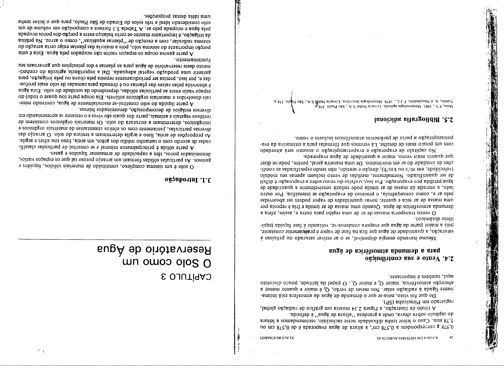 A AGUA EM SISTEMAS AGRÍCOLAS KLAUS REICHARDT 0,578 g correspondem a 0,578 cm3, a altura de água evaporada é de 0,578 cm ou 5.78 mm. Caso o leitor tenha dificuldade neste raciocínio, recomendamos a leitura do capítulo sobre chuva, onde a grandeza "altura de água" é definida. A título de ilustração, a Figura 2.14 mostra um gráfico de radiação global, registrado em Piracicaba (SP). Do que foi visto, nota-se que a demanda de água da atmosfera está intima- mente ligada à radiação solar. Nos meses de verão, Q0 é maior e quanto menor a absorção atmosférica, maior Q, e maior QL. O papel da latitude, pouco discutido aqui, também é importante. 2.4. Vento e sua contribuição para a demanda atmosférica de água Mesmo havendo energia disponível, se o ar estiver saturado ou próximo à saturação, a quantidade de água que fica na fase de vapor é praticamente constante, pois a maior parte da água que evapora condensa-se, voltando à fase líquida (equi- líbrio dinâmico). O vento transporta massas de ar de uma região para outra e, assim, afeta a demanda atmosférica de água. Quando uma massa de ar úmida e fria é reposta por uma massa de ar seca e quente, novas quantidades de vapor podem ser absorvidas pelo ar e, como consequência, o processo de evaporação se intensifica. Por outro lado, a entrada de massa de ar úmida pode reduzir sensivelmente a quantidade de água perdida por evaporação. Por isso, o efeito do vento sobre a evaporação é difícil de ser quantificado. Normalmente, medidas de vento incluem apenas seu módulo (velocidade, em m/s ou km/h), direção e sentido, não sendo especificadas as condi- ções de umidade do ar em movimento. De uma maneira geral, porém, pode-se dizer que quanto mais vento, maior a quantidade de água evaporada. No capítulo de evaporação e evapotranspiração o assunto será abordado com um pouco mais de detalhe. Lá veremos que fórmulas para a estimativa da eva- potranspiração a partir de parâmetros atmosféricos incluem o vento. 2.5. Bibliografia adicional Mota, F.S., 1981. Meteorologia agrícola. Livraria Nobel S.A., São Paulo. 376p. Tubelis, A. e Nascimento, F.J.L., 1979. Meteorologia descritiva. Livraria Nobíl S.A., São Pa] Io. 374 p. CAPÍTULO 3 O Solo como um Reservatório de Água 3.1. Introdução O solo é um sistema complexo, constituído de materiais sólidos, líquidos e gasosos. As partículas sólidas formam um arranjo poroso tal que os espaços vazios, denominados poros, têm a capacidade de armazenar líquidos e gases. A parte sólida é principalmente mineral e se constitui de partículas classifi- cadas de acordo com o tamanho médio dos grãos, em areia, limo (ou silte) e argila. As proporções de areia, limo e argila determinam a textura do solo. O arranjo das diversas partículas, juntamente com os efeitos cimentantes de materiais orgânicos e inorgânicos, determinam a estrutura do solo. Os materiais orgânicos consistem de resíduos vegetais e animais, parte dos quais são vivos e o restante se apresentando em diversos estágios de decomposição, denominados húmus. A parte líquida do solo constitui-se essencialmente de água, contendo mine- rais dissolvidos e materiais orgânicos solúveis. Ela ocupa parte (ou quase o todo) do espaço vazio entre as partículas sólidas, dependendo da umidade do solo. Esta água é absorvida pelas raízes das plantas ou é drenada para camadas de solo mais profun- das e, por isso, precisa ser periodicamente reposta pela chuva ou pela irrigação, para garantir uma produção vegetal adequada. Daí a importância agrícola do conheci- mento deste reservatório de água para as plantas e dos princípios que governam seu funcionamento. A parte gasosa ocupa os espaços vazios não ocupados pela água. Esta é uma porção importante do sistema solo, pois a maioria das plantas exige certa aeração do sistema radicular, com a exceção de "plantas aquáticas", como o arroz. Na prática da irrigação, é importante manter-se certo balanço entre a porção dos poros ocupada pela água e ocupada pelo ar. A Tabela 3.1 fornece a composição em volume de um solo considerado ideal e três solos do Estado de São Paulo, para que o leitor tenha uma ideia destas proporções. A ÁGUA EM SISTEMAS AGRÍCOLAS KLAUS REICHARDT TABELA 3.1 Composição volumétrica (%) de alguns solos fraçõo sólida solo mineral orgânica água "ideal" Regossol Latossol Roxo Podzólico V. A. orto 45 61 35 50 5 1 7 2 30 4 32 24 20 34 26 24 3.2. Textura do solo A textura do solo refere-se tão somente à distribuição das partículas em termos de tamanho. A escala de tamanho varia enormemente, desde cascalhes de diâmetro da ordem de centímetros, até partículas diminutas, como os colóides, que não podem ser vistos a olho nu. O tamanho das partículas é de grande importância, pois ele determina o número de partículas por unidade de volume ou de peso e a superfície que estas partículas expõem, como mostra a Tabela 3.2. TABELA 3.2 Relação entre diâmetro de partículas esféricas, seu número por cm3 e sua superfície Diâmetro das partículas (cm) 1 0,5 0,06 0,001 Número das partículas em 1 cm1 de solo 1 8 4.096 1.000.000.000 Superfície das partículas (cm2) 3,14 6,28 50,23 3.141,60 Este aumento pronunciado da superfície exposta com a diminuição do diâ- metro da partícula é ponto-chave para as propriedades do solo. A superfície exposta vai determinar as propriedades de retenção de água e de retenção de nutrientes. As proporções de partículas grosseiras, médias e finas que são denominadas de areia, limo e argila, determinam combinações que são utilizadas para classificar o solo segundo sua textura. A determinação do tamanho das partículas é feita em labo- ratório e é denominada de análise mecânica do solo. Denominaram-se de areia as partículas de diâmetro entre 2 e 0,02 mm; de silte ou limo as partículas de diâmetro entre 0,02 e 0,002 mm de