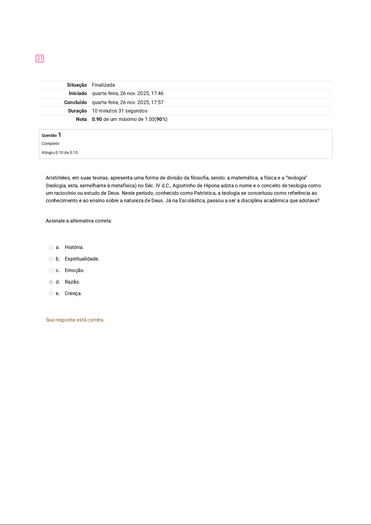 Situação Finalizada Iniciado quarta-feira, 26 nov. 2025, 17:46 Concluído quarta-feira, 26 nov. 2025, 17:57 Duração 10 minutos 31 segundos Nota 0.90 de um máximo de 1.00(90%) Questão 1 Completo Atingiu 0.10 de 0.10 Aristóteles, em suas teorias, apresenta uma forma de divisão da filosofia, sendo: a matemática, a física e a “teologia” (teologia, esta, semelhante à metafísica) no Séc. IV d.C., Agostinho de Hipona adota o nome e o conceito de teologia como um raciocínio ou estudo de Deus. Neste período, conhecido como Patrística, a teologia se conceituou como referência ao conhecimento e ao ensino sobre a natureza de Deus. Já na Escolástica, passou a ser a disciplina acadêmica que adotava? Assinale a alternativa correta: a. História. b. Espiritualidade. c. Emoção. d. Razão. e. Crença. Sua resposta está correta. Questão 2 Completo Atingiu 0.10 de 0.10 Questão 3 Completo Atingiu 0.10 de 0.10 Foi no século IV que o conceito da Teologia adquiriu um significado cristão, foi definido o termo como “raciocínio ou discussão sobre a Deidade”. O “start” para o pensamento teológico é que o divino existe sendo manifesto através do físico ou sobrenatural. Nesta época, a teologia está sendo desenvolvida dentro do ambiente religioso apenas. Alguns filósofos e religiosos buscam trazer a razão da fé, de uma forma mais real, aos períodos anteriores. Quem foi que definiu a teologia desta forma no século IV? Assinale a alternativa correta: a. Francisco V. b. Tomás de Aquino. c. Agostinho de Hipona. d. Papa Leão III. e. Lutero. Sua resposta está correta. O termo teologia compõe-se etimologicamente de dois termos, que lhe definem já grandemente a natureza: THEÓS + logía = Deus + ciência. No centro está Deus, seu objeto principal. Qualquer reflexão teológica refere-se de alguma maneira a Deus. Ao determinar-se mais exatamente o estatuto teórico, ver-se-á como tal referência se produz. A palavra “teologia” teve sua origem no mundo grego, com Platão, se referindo aos que discursavam sobre os deuses. O conceito de teologia tem uma função tripla e é facilmente observado. Suas funções são: Assinale a alternativa correta: a. Crítica, Religiosa e Política. b. Crítica, Pedagógica e Política. c. Religiosa, Crítica e Pedagógica. d. Religiosa, Eclesiástica, Pedagógica. e. Religiosa, Pedagógica e Política. Sua resposta está correta. Questão 4 Completo Atingiu 0.10 de 0.10 Questão 5 Completo Atingiu 0.10 de 0.10 A teologia tem seu papel importante na estruturação da fé cristã e nas crenças católicas. “Os teólogos chegam a constituir um poder de fato na instituição da Igreja católica. Graças a eles é que o catolicismo moderno fica marcado pela preocupação com a homogeneidade, a ortodoxia, a clareza.” (Libânio; Murad, 2003, p.136) É neste momento que há um crescimento excessivo da dependência teológica no clérigo. Os primeiros beneficiários são exatamente os clérigos, os religiosos e os diocesanos, os quais têm qual obrigatoriedade? Assinale a alternativa correta: a. Ser de família católica e não ser filho único. b. Possuir indicação superior do Papa. c. Estar na direção de uma Diocese. d. Possuir um curso teológico. e. Adotar o Celibato. Sua resposta está correta. Nos séculos XVI e XVII, houve um período de reestruturação na teologia católica, onde vários pensadores se levantarão para organizar e defender os assuntos pertinentes ao catolicismo romano. Esse evento incluiu a abolição de prática de cobranças de indulgências, exigiu uma articulação forte do Magistério, levantou frentes de evangelismo, tais como a Companhia de Jesus, dos jesuítas, que, inclusive, exerceram grande influência na colonização do Brasil. Estamos falando de qual evento promovido pela Igreja Católica? Assinale a alternativa correta: a. Inquisição. b. Concílio Vaticano III. c. Conquista do mundo Árabe. d. Contrarreforma. e. Reforma Protestante. Sua resposta está correta. Questão 6 Completo Atingiu 0.10 de 0.10 Questão 7 Completo Atingiu 0.10 de 0.10 Também conhecida como “Dogmática”, é o conjunto de disciplinas elaboradas ao longo da história da Igreja. Este conjunto de ensinos não se vale de doutrinas ou ensino denominacional restrito, vale-se da pura reflexão cristã, sob um olhar humanista. A teologia sistemática reelabora conceitos fundamentais, como a revelação, graça, sacramentos, entre outros, isto, de acordo com um estudo sistematizado e cronológico, entendendo que cada afirmação pode ser provisória dentro do campo teológico (Libânio e Murad, 2003, p. 224 - 225). Estamos falando da Teologia? Assinale a alternativa correta: a. Moral. b. Ética. c. Fundamental. d. Bíblica. e. Sistemática. Sua resposta está correta. No Séc. XII d.C., um homem chamado por Pedro Valdo (Pedro, por ser comparado ao apóstolo Pedro e Valdo, por ser um Valdez), comerciante de Lyon, na França, se converteu ao cristianismo e ao ter contato com a Bíblia, decidiu adquirir um exemplar em linguagem popular e passou a pregar a Palavra sem ser sacerdote. Ao mesmo tempo, renunciou seu ofício e dividiu seus bens aos pobres. Como se chamam os seguidores de Valdo e quais são as características deste grupo de fiéis e de qual período estamos falando? Assinale a alternativa correta: a. Reformadores - Não reconheciam a Igreja Católica e foi o período da Reforma Protestante. b. Valadenses - Não reconheciam a Igreja Católica e foi o período da Reforma Protestante. c. Valadenses - Não reconheciam a soberania eclesiástica de Roma e este período foi na Pré-Reforma. d. Valdenses – Não reconheciam a Igreja Católica e foi o período da Reforma Protestante. e. Valdenses – Não reconheciam a soberania eclesiástica de Roma e este período foi na Pré-Reforma. Sua resposta está correta. Questão 8 Completo Atingiu 0.10 de 0.10 Questão 9 Completo Atingiu 0.10 de 0.10 São duas instituições que eme
