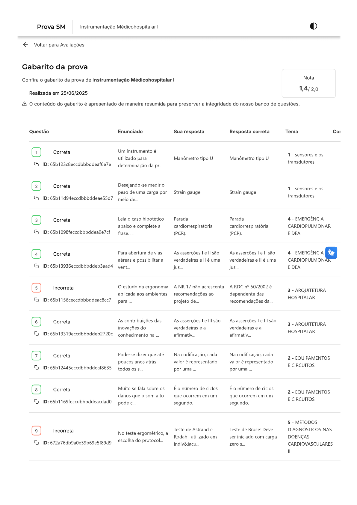 Prova SM Instrumentação Médicohospitalar Voltar para Avaliações Gabarito da prova Confira o gabarito da prova de Instrumentação Médicohospitalar I Nota 1,4/2,0 Realizada em 25/06/2025 conteúdo do gabarito é apresentado de maneira resumida para preservar a integridade do nosso banco de questões. Questão Enunciado Sua resposta Resposta correta Tema 1 Correta Um instrumento é 1 sensores e os utilizado para Manômetro tipo U Manômetro tipo U transdutores ID: 65b123c8eccdbbbddeaf6e7e determinação da pr... 2 Correta Desejando-se medir o 1 sensores e os peso de uma carga por Strain gauge Strain gauge transdutores ID: 65b11d94eccdbbbddeae55d7 meio de... 3 Correta Leia o caso hipotético Parada Parada 4 EMERGÊNCIA abaixo e complete a cardiorrespiratória cardiorrespiratória CARDIOPULMONAR ID: 65b1098feccdbbbddea9e7cf frase. (PCR). (PCR). E DEA 4 Correta Para abertura de vias As asserções e são As asserções e são 4 EMERGÊNCIA aéreas e possibilitar a verdadeiras e é uma verdadeiras e é uma CARDIOPULMONAR ID: 65b13936eccdbbbddeb3aad4 vent... jus... jus... E DEA 5 Incorreta estudo da ergonomia A NR 17 não acrescenta A RDC n° 50/2002 é 3 ARQUITETURA aplicada aos ambientes recomendações ao dependente das HOSPITALAR ID: 65b1156ceccdbbbddeac8cc7 para projeto de... recomendações da... 6 Correta As contribuições das As asserções I e III são As asserções e III são 3 ARQUITETURA inovações do verdadeiras e a verdadeiras e a HOSPITALAR ID: conhecimento na afirmativ... afirmativ... 7 Correta Pode-se dizer que até Na codificação, cada Na codificação, cada 2 EQUIPAMENTOS poucos anos atrás valor é representado valor é representado E CIRCUITOS ID: 65b12445eccdbbbddeaf8635 todos os S... por uma por uma 8 Correta Muito se fala sobre os É número de ciclos É o número de ciclos 2 EQUIPAMENTOS danos que o som alto que ocorrem em um que ocorrem em um E CIRCUITOS ID: 65b1169feccdbbbddeacdad0 pode segundo. segundo. 5 MÉTODOS 9 Incorreta Teste de Astrand e Teste de Bruce: Deve DIAGNÓSTICOS NAS No teste ergométrico, a Rodahl: utilizado em ser iniciado com carga DOENÇAS ID: 672a76db9a0e59b69e5f89d9 escolha do protocol... indiv&iacu... zero S... CARDIOVASCULARES6 Equipamentos 10 Incorreta Os ventiladores Apenas as afirmativas Biomédicos mecânicos modernos I, e III estão corretas. e III estão corretas. Cardiovasculares e ID: 6696b08a5a7dccce854c498a são controlados... Respiratórios i Encontrou algum problema? Você pode copiar o ID da questão e abrir um requerimento. Na tela inicial do Campus Virtual (SIA), acesse "Atendimento > Requerimento > Novo > Currículo/Aula/horário > Analisar ambiente de avaliação/exercícios"