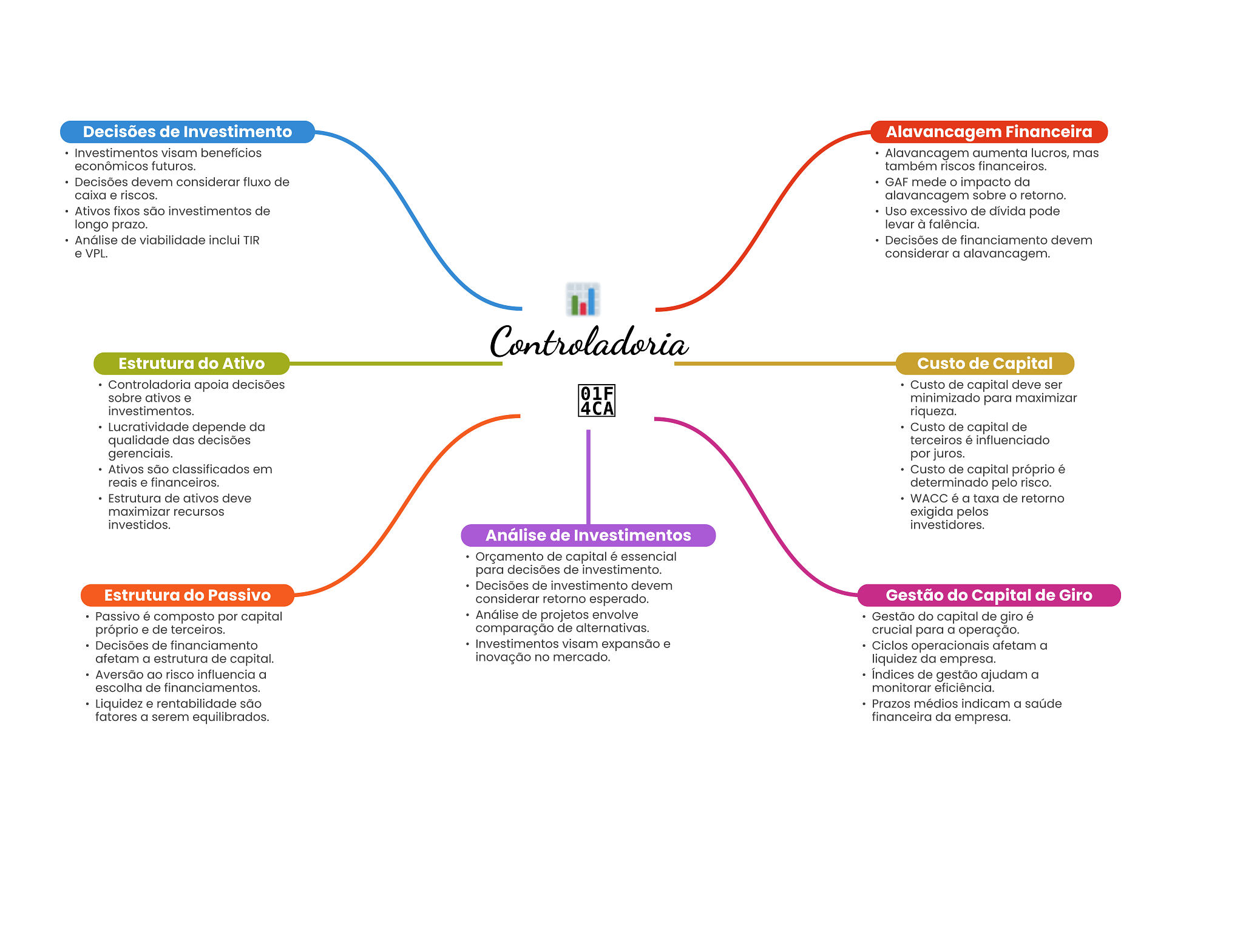 Decisões de Investimento Alavancagem Financeira Investimentos visam benefícios Alavancagem aumenta lucros, mas econômicos futuros. também riscos financeiros. Decisões devem considerar fluxo de GAF mede impacto da caixa e riscos. alavancagem sobre retorno. Ativos fixos são investimentos de Uso excessivo de dívida pode longo prazo. levar à falência. Análise de viabilidade inclui TIR Decisões de financiamento devem e VPL. considerar a alavancagem. Controladoria Estrutura do Ativo Custo de Capital Controladoria apoia decisões Custo de capital deve ser sobre ativos e 01F minimizado para maximizar investimentos. 4CA riqueza. Lucratividade depende da Custo de capital de qualidade das decisões terceiros é influenciado gerenciais. por juros. Ativos são classificados em Custo de capital próprio é reais e financeiros. determinado pelo risco. Estrutura de ativos deve WACC é a taxa de retorno maximizar recursos exigida pelos investidos. investidores. Análise de Investimentos Orçamento de capital é essencial para decisões de investimento. Decisões de investimento devem Estrutura do Passivo considerar retorno esperado. Gestão do Capital de Giro Passivo é composto por capital Análise de projetos envolve Gestão do capital de giro é próprio e de terceiros. comparação de alternativas. crucial para a operação. Decisões de financiamento Investimentos visam expansão e Ciclos operacionais afetam a afetam a estrutura de capital. inovação no mercado. liquidez da empresa. Aversão ao risco influencia a Indices de gestão ajudam a escolha de financiamentos. monitorar eficiência. Liquidez e rentabilidade são Prazos médios indicam a saúde fatores a serem equilibrados. financeira da empresa.