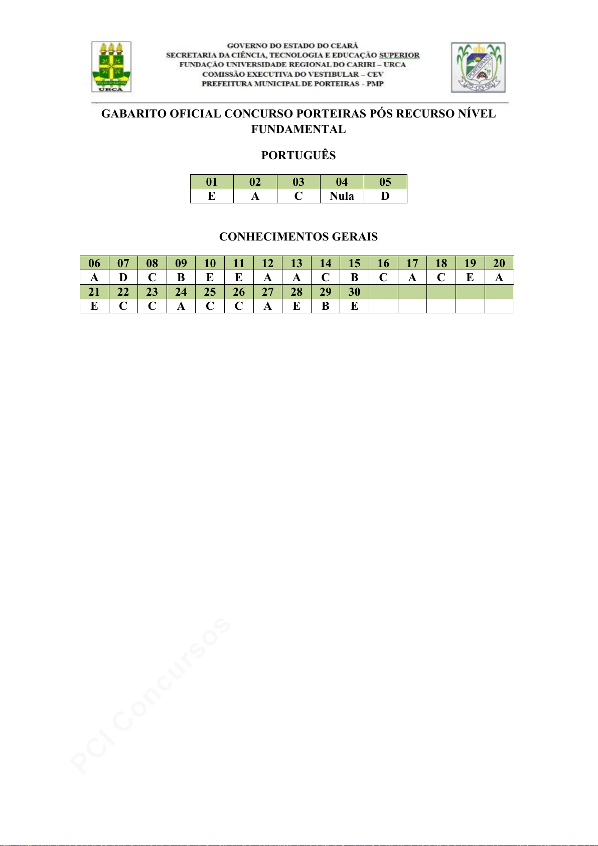 pcimarkpci MjgwNDowMjQ4OmYxNWE6YzkwMDo5Y2U1OjZjZjg6NTQzODo5NThi:TW9uLCAxNyBOb3YgMjAyNSAxMDo1NDozNSAtMDMwMA== www.pciconcursos.com.br GABARITO OFICIAL CONCURSO PORTEIRAS PÓS RECURSO NÍVEL FUNDAMENTAL PORTUGUÊS 01 02 03 04 05 E A C Nula D CONHECIMENTOS GERAIS 06 07 08 09 10 11 12 13 14 15 16 17 18 19 20 A D C B E E A A C B C A C E A 21 22 23 24 25 26 27 28 29 30 E C C A C C A E B E pcimarkpci MjgwNDowMjQ4OmYxNWE6YzkwMDo5Y2U1OjZjZjg6NTQzODo5NThi:TW9uLCAxNyBOb3YgMjAyNSAxMDo1NDozNSAtMDMwMA== www.pciconcursos.com.br GABARITO OFICIAL CONCURSO PORTEIRAS PÓS RECURSO NÍVEL MÉDIO PORTUGUÊS 01 02 03 04 05 06 07 08 09 10 C D C B D A B E D B CONHECIMENTOS GERAIS 11 12 13 14 15 16 17 18 19 20 21 22 23 24 25 D C C A D E C C A C E D C A C 26 27 28 29 30 31 32 33 34 35 36 37 38 39 40 E A C A D B D A B C B D A A D pcimarkpci MjgwNDowMjQ4OmYxNWE6YzkwMDo5Y2U1OjZjZjg6NTQzODo5NThi:TW9uLCAxNyBOb3YgMjAyNSAxMDo1NDozNSAtMDMwMA== www.pciconcursos.com.br GABARITO OFICIAL CONCURSO PORTEIRAS – NÍVEL MÉDIO TÉCNICO PORTUGUÊS CONHECIMENTOS GERAIS 01 02 03 04 05 06 07 08 09 10 11 12 13 14 15 16 17 18 19 20 C E B A D D C C D E C C E D E B D A C B TÉCNICO EM ENFERMAGEM 21 22 23 24 25 26 27 28 29 30 31 32 33 34 35 36 37 38 39 40 E A A A E D E E D A D E A A E C B B B C TÉCNICO EM SAÚDE BUCAL 21 22 23 24 25 26 27 28 29 30 31 32 33 34 35 36 37 38 39 40 E A C E B D D A C D B A B E C C D A E B pcimarkpci MjgwNDowMjQ4OmYxNWE6YzkwMDo5Y2U1OjZjZjg6NTQzODo5NThi:TW9uLCAxNyBOb3YgMjAyNSAxMDo1NDozNSAtMDMwMA== www.pciconcursos.com.br GABARITO OFICIAL CONCURSO PORTEIRAS PÓS RECURSO NÍVEL SUPERIOR MAGISTÉRIO PORTUGUÊS CONHECIMENTOS GERAIS DIDÁTICA 01 02 03 04 05 06 07 08 09 10 11 12 13 14 15 16 17 18 19 20 A B E C A A C D C D C A C A C B A C D D PROFESSOR DE BIOLOGIA 21 22 23 24 25 26 27 28 29 30 31 32 33 34 35 36 37 38 39 40 E A B C D A A C D E Nula B B E C D B E C A 41 42 43 44 45 B A E D C PROFESSOR DE GEOGRAFIA 21 22 23 24 25 26 27 28 29 30 31 32 33 34 35 36 37 38 39 40 A E C A D A D C D A E B B A B C E D B A 41 42 43 44 45 E E C D B PROFESSOR DE HISTÓRIA 21 22 23 24 25 26 27 28 29 30 31 32 33 34 35 36 37 38 39 40 C C E A D B D D A C D B D A E B A C A C 41 42 43 44 45 D B C A C PROFESSOR DE MATEMÁTICA 21 22 23 24 25 26 27 28 29 30 31 32 33 34 35 36 37 38 39 40 B C A E D Nula Nula E E D D E A C B D A E B D 41 42 43 44 45 C A E B A PROFESSOR DE POLIVALENTE 21 22 23 24 25 26 27 28 29 30 31 32 33 34 35 36 37 38 39 40 C A A B E A C D E C B A C E B E A B C C 41 42 43 44 45 A E C A C pcimarkpci MjgwNDowMjQ4OmYxNWE6YzkwMDo5Y2U1OjZjZjg6NTQzODo5NThi:TW9uLCAxNyBOb3YgMjAyNSAxMDo1NDozNSAtMDMwMA== www.pciconcursos.com.br PROFESSOR DE PORTUGUÊS 21 22 23 24 25 26 27 28 29 30 31 32 33 34 35 36 37 38 39 40 C E D E A B E A A D C D C A E B B C B B 41 42 43 44 45 C D E C E