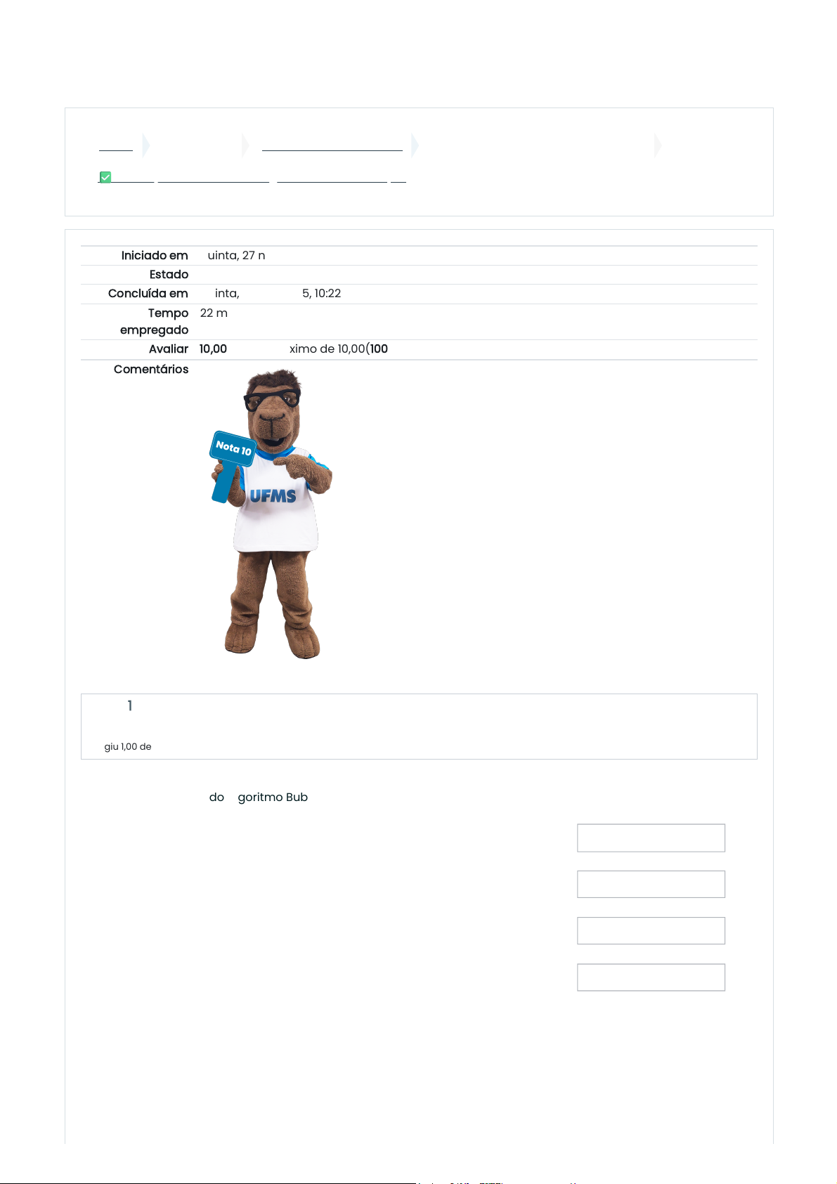 Painel Meus cursos 32010001906-T01-2025-2 Módulo 5 – Algoritmos de Ordenação ✅ Avaliação do Módulo 5 - Algoritmos de Ordenação Iniciado em quinta, 27 nov 2025, 10:00 Estado Finalizada Concluída em quinta, 27 nov 2025, 10:22 Tempo empregado 22 minutos 7 segundos Avaliar 10,00 de um máximo de 10,00(100%) Comentários Questão 1 Correto Atingiu 1,00 de 1,00 Associe cada parte do algoritmo Bubble sort à sua descrição correta. Controla o número de passagens pela lista para garantir que todos os elementos sejam ordenados. Percorre pares de elementos vizinhos na parte não ordenada da lista em cada passagem. Verifica se o elemento atual é maior que o próximo para decidir se a troca é necessária. Se necessário, realiza a troca entre o elemento atual e o vizinho, movendo o elemento maior para a direita. Loop externo. Loop interno. Comparação. Troca de elementos. https://ava.ufms.br/my/ https://ava.ufms.br/course/view.php?id=76648 https://ava.ufms.br/mod/quiz/view.php?id=1109945 Questão 2 Correto Atingiu 1,00 de 1,00 Questão 3 Correto Atingiu 1,00 de 1,00 Questão 4 Correto Atingiu 1,00 de 1,00 O algoritmo Quick sort tem como pior caso: a. O(n!). b. O( n ). c. O(log n). d. O(n²). e. O(n log n). O algoritmo Selection sort tem como pior caso: a. O(n²). b. O(n log n). c. O(n!). d. O( n ). e. O(log n). O algoritmo de ordenação Bubble sort aplica a técnica de divisão e conquista. Escolha uma opção: Verdadeiro Falso Questão 5 Correto Atingiu 1,00 de 1,00 Questão 6 Correto Atingiu 1,00 de 1,00 Questão 7 Correto Atingiu 1,00 de 1,00 Associe a descrição do algoritmo de ordenação com o nome correspondente. Percorre repetidamente a lista comparando e trocando pares adjacentes fora de ordem até que nenhuma troca seja necessária. Divide recursivamente a lista ao meio até sublistas unitárias e depois intercala essas sublistas de volta em ordem crescente. Escolhe um pivô, particiona a lista em elementos menores e maiores que o pivô e ordena recursivamente essas partições. A cada iteração, seleciona o menor elemento do conjunto não ordenado e o coloca na próxima posição da parte ordenada. Constrói gradualmente uma sublista ordenada inserindo cada novo elemento na posição correta dentro dessa sublista. Bubble sort. Merge sort. Quick sort. Selection sort. Insertion sort. Associe cada etapa do algoritmo Merge sort à sua descrição correta. Combina as duas sublistas ordenadas em um único array. Interrompe a recursão quando o subarray tem tamanho zero ou um. Aplica o Merge sort recursivamente às partes esquerda e direita do array. Determina o ponto médio para dividir o array em duas partes. Mesclagem. Caso base. Chamadas recursivas. Divisão. Associe a quantidade média de trocas com cada algoritmo de ordenação básico. Alto (troca constante). Baixo (troca pontual). Moderado (deslocamento). Bubble sort. Selection sort. Insertion sort. Questão 8 Correto Atingiu 1,00 de 1,00 Questão 9 Correto Atingiu 1,00 de 1,00 Questão 10 Correto Atingiu 1,00 de 1,00 Merge sort é sempre a melhor escolha para ordenação de dados em aplicações reais. Escolha uma opção: Verdadeiro Falso Qual dos seguintes algoritmos de ordenação não é estável? a. Bubble sort. b. Insertion sort. c. Nenhuma das afirmativas. d. Merge sort. e. Quick sort. O algoritmo de ordenação Insertion sort é útil para trabalhar em conjuntos que recebem inserção frequente de novos elementos. Escolha uma opção: Verdadeiro Falso Atividade anterior ◄ 📍 Checkout de Presença do Módulo 5 - Algoritmos de Ordenação Seguir para... Próxima atividade ✅ Prova Optativa ► Precisa de ajuda com o AVA UFMS? https://agead.ufms.br suporte.agead@ufms.br https://ava.ufms.br/mod/assign/view.php?id=1109943&forceview=1 https://ava.ufms.br/mod/quiz/view.php?id=1109946&forceview=1 https://agead.ufms.br/ mailto:suporte.agead@ufms.br https://api.whatsapp.com/send?phone=556733457614