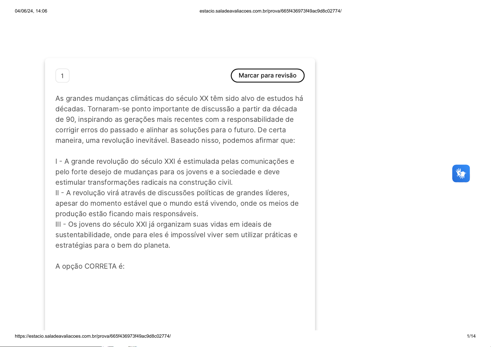 1 Marcar para revisão As grandes mudanças climáticas do século XX têm sido alvo de estudos há décadas. Tornaram-se ponto importante de discussão a partir da década de 90, inspirando as gerações mais recentes com a responsabilidade de corrigir erros do passado e alinhar as soluções para o futuro. De certa maneira, uma revolução inevitável. Baseado nisso, podemos afirmar que: I � A grande revolução do século XXI é estimulada pelas comunicações e pelo forte desejo de mudanças para os jovens e a sociedade e deve estimular transformações radicais na construção civil. II � A revolução virá através de discussões políticas de grandes líderes, apesar do momento estável que o mundo está vivendo, onde os meios de produção estão ficando mais responsáveis. III � Os jovens do século XXI já organizam suas vidas em ideais de sustentabilidade, onde para eles é impossível viver sem utilizar práticas e estratégias para o bem do planeta. A opção CORRETA é: 04/06/24, 14:06 estacio.saladeavaliacoes.com.br/prova/665f436973f49ac9d8c02774/ https://estacio.saladeavaliacoes.com.br/prova/665f436973f49ac9d8c02774/ 1/14 A B C D E Todas as sentenças são verdadeiras Somente a sentença III é verdadeira As sentenças I e III são verdadeiras As sentenças II e III são verdadeiras Somente a sentença I é verdadeira 2 Marcar para revisão A globalização a partir dos anos 90 mudou o planeta. Transformou a forma de como ver os povos do mundo, antes separados, desagregados entre si, e trouxe um profundo sentimento de conexão e lealdade. Mas em meio a um turbilhão de culturas falando em uníssono, alguns setores passaram a sofrer com a forte expressão construtiva de outra cultura. Entre os vários problemas do setor de construção civil, a opção que retrata uma situação de apropriação construtiva de outros países fora da realidade brasileira é: 04/06/24, 14:06 estacio.saladeavaliacoes.com.br/prova/665f436973f49ac9d8c02774/ https://estacio.saladeavaliacoes.com.br/prova/665f436973f49ac9d8c02774/ 2/14 A B C D E O aproveitamento de fôrmas construtivas de edifícios alemães para construções de casas em todo o Brasil. As construções utilizando mão de obra estrangeira ao invés da nacional, já que o conhecimento deles era maior. O uso de estruturas de aço, típicas de construções americanas, somente para tentar ter um status semelhante ao deles. O uso de madeiras no processo construtivo, típico de países com menos pragas e umidade que atingissem o material usado. A elaboração de planejamentos especiais dentro do cronograma europeu, mais eficiente, e que permitiu construir mais e mais rápido nas cidades brasileiras. 3 Marcar para revisão Sobre a paisagem urbana, forte pensamento do arquiteto urbanista sustentável na concepção de cidade, podemos afirmar que: I � A paisagem urbana é responsável por alinhar o pensamento do cidadão e incorporar sentimento de pertencimento. 04/06/24, 14:06 estacio.saladeavaliacoes.com.br/prova/665f436973f49ac9d8c02774/ https://estacio.saladeavaliacoes.com.br/prova/665f436973f49ac9d8c02774/ 3/14 A B C D E II � A cidade precisa ter um desenho tradicional que tradicionalmente possui edifícios altos e envidraçados. III � Dentro da concepção sustentável, a paisagem urbana não é mais vista de cima, mas sim do ponto de vista do pedestre. São VERDAIS as sentenças: As sentenças I e III. Somente a I. Somente a III. As sentenças I, II e III. As sentenças I e II. 4 Marcar para revisão Todas as metrópoles possuem possibilidade de ação. Porém, devido à natureza do perfil do habitante da cidade, mais acomodado em suas convicções urbanas, qualquer mudança é uma alteração de sua rotina. 04/06/24, 14:06 estacio.saladeavaliacoes.com.br/prova/665f436973f49ac9d8c02774/ https://estacio.saladeavaliacoes.com.br/prova/665f436973f49ac9d8c02774/ 4/14 A B C Sendo assim, é preciso avaliar com cuidado os planos de ação do planejamento urbano, a partir de certa ordem de critérios que pode favorecer o habitante da cidade. Algumas dessas ações são apresentadas abaixo: 1� Estimular junto ao poder público municipal e estadual a criação de equipamentos urbanos para incentivar o uso da cidade pelo cidadão, em várias situações do dia, e não apenas no trajeto casa-trabalho-casa. 2� Justificar a conscientização do uso do transporte coletivo, reduzindo a necessidade de usar o carro em situações corriqueiras. 3� Promover ações pontuais em ruas, praças e acessos, para aumentar a percepção da paisagem urbana. 4� Determinar áreas para ocupações especiais, onde serão incentivados, através de concursos arquitetônicos, a construção de quadras especiais heterogêneas. A ordem correta, de acordo com as necessidades sustentáveis, para aplicação as mudanças no cenário urbano é: 4, 2, 1, 3. 3, 2, 1, 4. 2, 4, 1, 3. 00 hora : 24 min : 30 seg Ocultar SM2 Sustentabilidade Em Arquitetura e Urbanismo 04/06/24, 14:06 estacio.saladeavaliacoes.com.br/prova/665f436973f49ac9d8c02774/ https://estacio.saladeavaliacoes.com.br/prova/665f436973f49ac9d8c02774/ 5/14 D E 1, 2 ,3, 4. 3, 2, 4, 1. 5 Marcar para revisão O ser humano pode aprender muito com o edifício sustentável. Para tal, é necessário que certas práticas do dia a dia se tornem usuais, um hábito a ser seguido. Um exemplo é a forma que utilizamos algumas áreas da edificação ou até mesmo a aceitação de estruturas que são pouco convencionais, como uma fachada verde. Contudo, algumas áreas ainda são um desafio para os arquitetos, como por exemplo a manutenção de certas estruturas. Essas áreas são mais complicadas, por quê? Assinale a alternativa correta. Questão 5 de 10 Respondidas �10� Em branco �0� Finalizar prova 1 2 3 4 5 6 7 8 9 10 04/06/24, 14:06 estacio.saladeavaliacoes.com.br/prova/665f436973f49ac9d8c02774/ https://estacio.saladeavaliacoes.com.br/prova/665f436973f49ac9d8c02774/ 6/14 A B C A manutenção predi