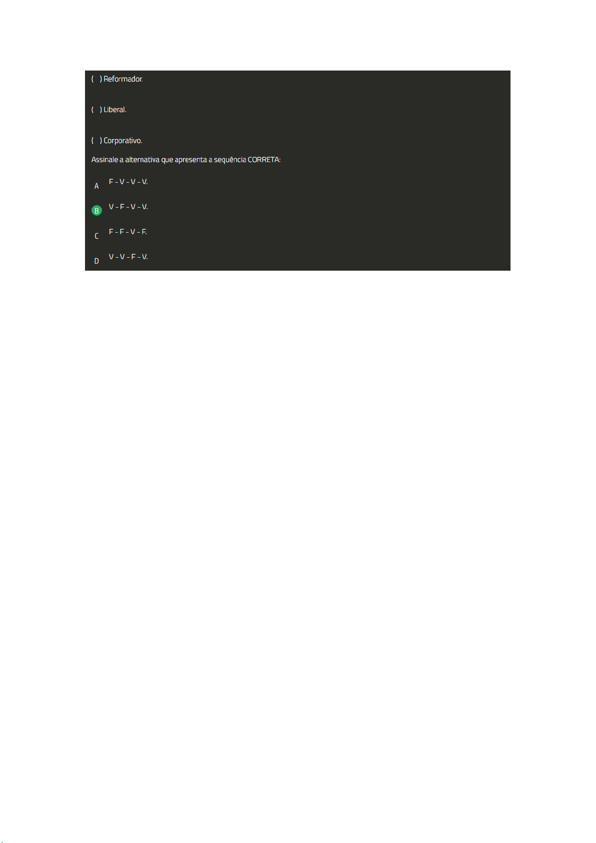 ) Reformador. Liberal. Corporativo. Assinale a alternativa que apresenta a sequência CORRETA: A F-V-V-V. V-F-V-V. F-F-V-F. D V-V-F-V.