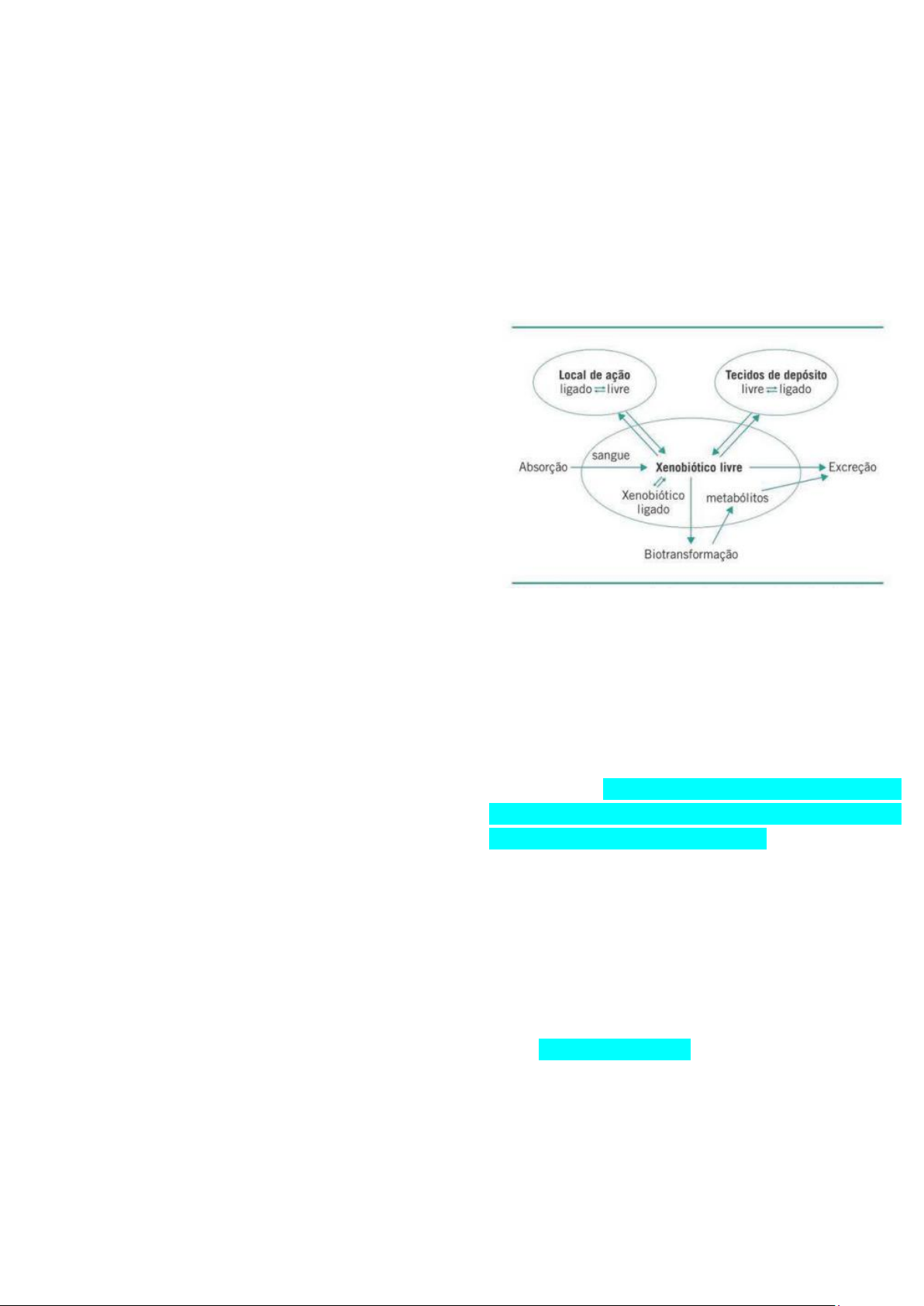 DRAMA – PROVA A toxicologia é a ciência que estuda os efeitos nocivos decorrentes das interações das substâncias químicas com o organismo, sob condições específicas de exposição. Um efeito é considerado nocivo se: ➢ Ao ser produzido numa exposição prolongada resulte em transtornos da capacidade funcional e/ou da capacidade do organismo em compensar nova sobrecarga; ➢ Diminui perceptivelmente a capacidade do organismo de manter sua homeostasia, quer sejam efeitos reversíveis ou irreversíveis; ➢ Aumenta a suscetibilidade aos efeitos indesejáveis de outros fatores ambientais, tais como os químicos, os físicos, os biológicos ou os sociais. Entende-se por agente tóxico ou toxicante a entidade química capaz de causar dano a um sistema biológico, alterando seriamente uma função ou levando-o à morte, sob certas condições de exposição. Os complexos eventos envolvidos na intoxicação, desde a exposição do organismo ao toxicante até o aparecimento de sinais e sintomas, podem ser desdobrados, para fins didáticos, em quatro fases, ditas fases de intoxicação. a) Fase de exposição: a superfície externa ou interna do organismo entra em contato com o toxicante. É importante considerar a dose ou a concentração do xenobiótico, a via de introdução, a frequência e a duração da exposição, as propriedades físico-químicas das substâncias, assim como a suscetibilidade química do xenobiótico. b) Fase toxicocinética: Inclui todos os processos envolvidos na relação entre a absorção e a concentração do agente tóxico nos diferentes tecidos do organismo, através dos deslocamentos da substância no organismo. Intervêm nessa fase absorção, distribuição, armazenamento, biotransformação e os processos de excreção de substâncias químicas. As propriedades físico-químicas dos toxicantes determinam o grau de acesso aos órgãos-alvo, assim como a velocidade de sua eliminação do organismo. O balanço desses movimentos é que condiciona a biodisponibilidade da substância. c) Fase toxicodinâmica: compreende a interação entre as moléculas do toxicante e os sítios de ação, específicos ou não dos órgãos e o aparecimento de desequilíbrio homeostásico. d) Fase clínica: É a fase em que há evidências de sinais e sintomas, ou ainda alterações patológicas detectáveis mediante provas diagnósticas, caracterizando os efeitos nocivos provocados pela interação do toxicante com o organismo. Toxicocinética É o estudo do comportamento de um agente nos diferentes compartimentos do organismo, que são dependentes dos processos de absorção, distribuição e eliminação. O efeito tóxico é geralmente proporcional à concentração do agente no sítio molecular de ação (tecido-alvo). Entretanto, em face da dificuldade da determinação de sua concentração no sítio de ação, quantifica-se a concentração do agente tóxico no sangue, predominantemente no plasma, que constitui o tecido acessível e em constante comunicação com os tecidos-alvo. Os parâmetros da toxicocinética permitem avaliar matematicamente os movimentos dos agentes tóxicos no organismo. Um dos fatores importantes para essa determinação matemática é a capacidade das substâncias de atravessar as membranas plasmáticas. ➔ Mecanismos de transporte através de membranas: os xenobióticos atravessam as membranas por diferentes mecanismos, dependendo de suas propriedades físico-químicas. 1. Transporte passivo: mecanismo dependente do gradiente de concentração e das características físico-químicas dos agentes químicos. Esse processo compreende a filtração, que é a passagem de moléculas polares – hidrossolúveis – pelos poros aquosos da membrana. E a difusão lipídica, que é a passagem das moléculas hidrofóbicas, por difusão através das membranas. Agentes químicos podem ser transportados por carregadores nas membranas células sem haver consumo de energia. Por esta última razão, esse transporte é denominado difusão passiva. A passagem através da membrana se faz a favor do gradiente de concentração – sem gasto energético. 2. Transporte ativo: caracterizado por consumo de energia, movimento de substâncias contra o gradiente de concentração e a existência de proteínas carregadoras de moléculas, as quais apresentam seletividade perante as substâncias, podendo ser saturáveis. Recentemente, foi identificada uma série de proteínas transportadoras de efluxo expressas nas membranas celulares que foram agrupadas em famílias de acordo com suas semelhanças nas estruturas químicas. A expressão dessas proteínas tem conferido proteção ou toxicidade dependendo de sua localização e do agente envolvido. A primeira família identificada foi a mdr “multidrug resistant proteins", assim denominada por determinar resistência a quimioterápicos. Foi verificado prejuízo na absorção intestinal e nas células tu morais, uma vez que essas proteínas transportam o agente químico absorvido novamente para o meio extracelular. 3. Pinocitose: processo especial de passagem de partículas líquidas através de células, por mecanismo semelhante à fagocitose, que é a ingestão de partículas sólidas por células especiais. A fagocitose por macrófagos é o mecanismo de remoção de material particulado dos alvéolos e tem sido um mecanismo relevante para a entrada de nanocompostos para o meio intracelular. ➔ Absorção: é a passagem de substâncias do local de contato para a circulação sanguínea. As principais vias de exposição aos agentes tóxicos no organismo são a dérmica, a oral e a respiratória. Outras vias, tais como a intramuscular, intravenosa e a subcutânea, constituem meios normais de introdução de agentes medicamentosos que, dependendo da dose e das condições fisiológicas ou de doença do paciente, podem produzir efeitos adversos acentuados, com lesões graves em diversos órgãos. É importante ressaltar 