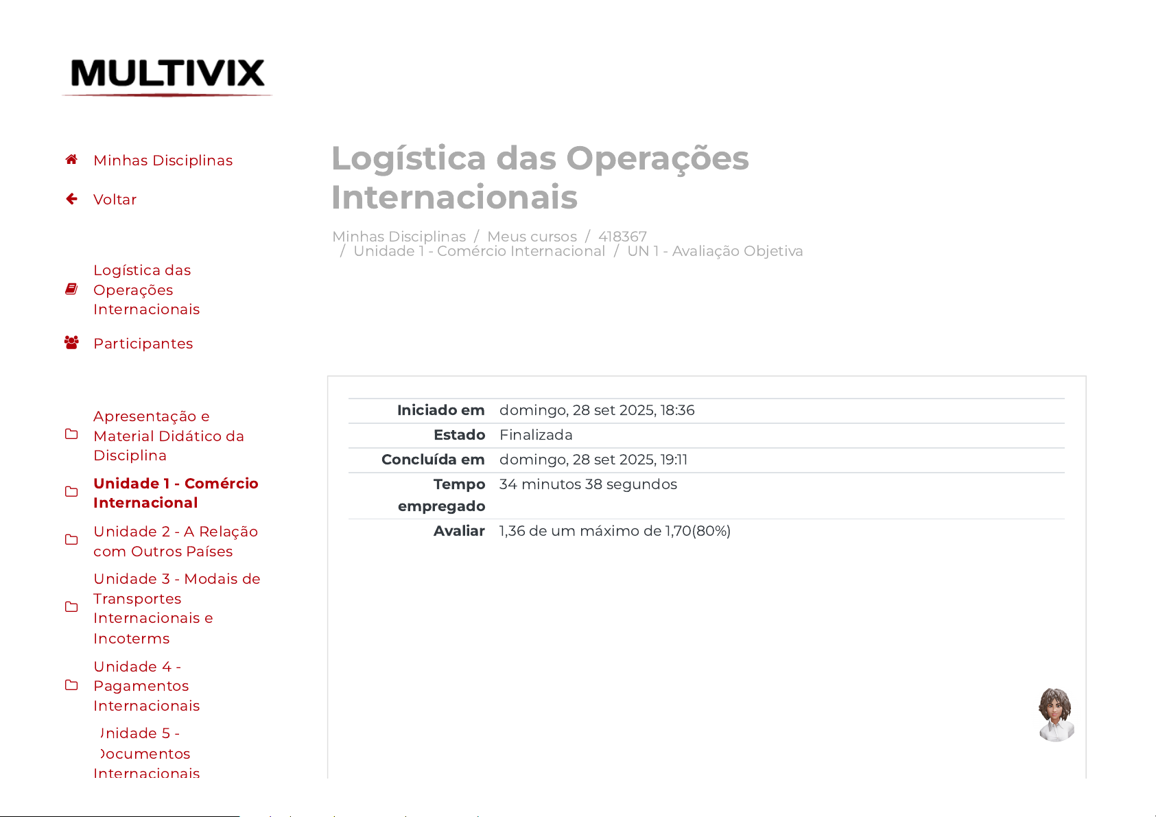 Minhas Disciplinas / Meus cursos / 418367 / Unidade 1 - Comércio Internacional / UN 1 - Avaliação Objetiva Logística das Operações Internacionais Iniciado em domingo, 28 set 2025, 18:36 Estado Finalizada Concluída em domingo, 28 set 2025, 19:11 Tempo empregado 34 minutos 38 segundos Avaliar 1,36 de um máximo de 1,70(80%) Minhas Disciplinas Voltar Logística das Operações Internacionais Participantes Apresentação e Material Didático da Disciplina Unidade 1 - Comércio Internacional Unidade 2 - A Relação com Outros Países Unidade 3 - Modais de Transportes Internacionais e Incoterms Unidade 4 - Pagamentos Internacionais Unidade 5 - Documentos Internacionais https://avap.multivix.edu.br/my/ https://avap.multivix.edu.br/course/view.php?id=36058 https://avap.multivix.edu.br/course/view.php?id=36058§ion=2 https://avap.multivix.edu.br/mod/quiz/view.php?id=1956380 https://avap.multivix.edu.br/my/ https://avap.multivix.edu.br/course/view.php?id=36058 https://avap.multivix.edu.br/user/index.php?id=36058 https://avap.multivix.edu.br/course/view.php?id=36058§ion=1 https://avap.multivix.edu.br/course/view.php?id=36058§ion=2 https://avap.multivix.edu.br/course/view.php?id=36058§ion=3 https://avap.multivix.edu.br/course/view.php?id=36058§ion=4 https://avap.multivix.edu.br/course/view.php?id=36058§ion=5 https://avap.multivix.edu.br/course/view.php?id=36058§ion=6 https://avap.multivix.edu.br/ https://avap.multivix.edu.br/ https://avap.multivix.edu.br/ https://avap.multivix.edu.br/ https://avap.multivix.edu.br/ https://avap.multivix.edu.br/ https://avap.multivix.edu.br/ Questão 1 Correto Atingiu 0,34 de 0,34 Apesar de trazer desenvolvimento econômico e bem-estar social, a participação brasileira no comércio exterior ainda está aquém do seu potencial considerando suas dimensões e riquezas naturais. O país deve passar por reformas importantes para alcançar uma posição melhor globalmente no ranking do comércio internacional. São fatores que devem ser revistos ou reformados Escolha uma opção: a. O excesso de acordos bilaterais que não aumentam o comércio internacional b. A guerra comercial com países do Oriente Médio c. O insuficiente número de embaixadas e câmaras do comércio no exterior d. O modelo tributário e protecionismo e. A falta de comércio internacional com China e Estados Unidos Minhas Disciplinas Voltar Logística das Operações Internacionais Participantes Apresentação e Material Didático da Disciplina Unidade 1 - Comércio Internacional Unidade 2 - A Relação com Outros Países Unidade 3 - Modais de Transportes Internacionais e Incoterms Unidade 4 - Pagamentos Internacionais Unidade 5 - Documentos Internacionais https://avap.multivix.edu.br/my/ https://avap.multivix.edu.br/course/view.php?id=36058 https://avap.multivix.edu.br/user/index.php?id=36058 https://avap.multivix.edu.br/course/view.php?id=36058§ion=1 https://avap.multivix.edu.br/course/view.php?id=36058§ion=2 https://avap.multivix.edu.br/course/view.php?id=36058§ion=3 https://avap.multivix.edu.br/course/view.php?id=36058§ion=4 https://avap.multivix.edu.br/course/view.php?id=36058§ion=5 https://avap.multivix.edu.br/course/view.php?id=36058§ion=6 https://avap.multivix.edu.br/ https://avap.multivix.edu.br/ https://avap.multivix.edu.br/ https://avap.multivix.edu.br/ https://avap.multivix.edu.br/ https://avap.multivix.edu.br/ https://avap.multivix.edu.br/ Questão 2 Correto Atingiu 0,34 de 0,34 Os serviços postais são fundamentais para um bom resultado das operações logísticas, pois permitem o envio de amostras, pequenas encomendas e documentos favorecendo o desenvolvimento comercial. O que um bom serviço postal, poderia oferecer neste caso? Escolha uma opção: a. Segurança e pontualidade. b. Variedade de transporte. c. Atuação de empresas privadas. d. Serviços de coleta. e. Gestão pública eficiente. Minhas Disciplinas Voltar Logística das Operações Internacionais Participantes Apresentação e Material Didático da Disciplina Unidade 1 - Comércio Internacional Unidade 2 - A Relação com Outros Países Unidade 3 - Modais de Transportes Internacionais e Incoterms Unidade 4 - Pagamentos Internacionais Unidade 5 - Documentos Internacionais https://avap.multivix.edu.br/my/ https://avap.multivix.edu.br/course/view.php?id=36058 https://avap.multivix.edu.br/user/index.php?id=36058 https://avap.multivix.edu.br/course/view.php?id=36058§ion=1 https://avap.multivix.edu.br/course/view.php?id=36058§ion=2 https://avap.multivix.edu.br/course/view.php?id=36058§ion=3 https://avap.multivix.edu.br/course/view.php?id=36058§ion=4 https://avap.multivix.edu.br/course/view.php?id=36058§ion=5 https://avap.multivix.edu.br/course/view.php?id=36058§ion=6 https://avap.multivix.edu.br/ https://avap.multivix.edu.br/ https://avap.multivix.edu.br/ https://avap.multivix.edu.br/ https://avap.multivix.edu.br/ https://avap.multivix.edu.br/ https://avap.multivix.edu.br/ Questão 3 Correto Atingiu 0,34 de 0,34 A teoria sobre comércio internacional, desenvolvida por Michael Porter, em 1990, diz que há vantagem competitiva em certos países que possuem um aglomerado de empresas de um mesmo setor. Neste contexto, a vantagem é explicada pela Escolha uma opção: a. concorrência entre as empresas as obriga a buscarem inovação. b. oferta de serviços logísticos de acordo com o setor específico c. atuação de operadores logísticos mais especializados. d. abundância de recursos naturais naquela região. e. baixa tributação sobre as operações. Minhas Disciplinas Voltar Logística das Operações Internacionais Participantes Apresentação e Material Didático da Disciplina Unidade 1 - Comércio Internacional Unidade 2 - A Relação com Outros Países Unidade 3 - Modais de Transportes Internacionais e Incoterms Unidade 4 - Pagamentos Internacionais Unidade 5 - Documentos Internacionais https://avap.multivix.edu.br/my/ https://avap.multivix.edu.br/course/view.php?id=36058 https://avap.multivix.ed