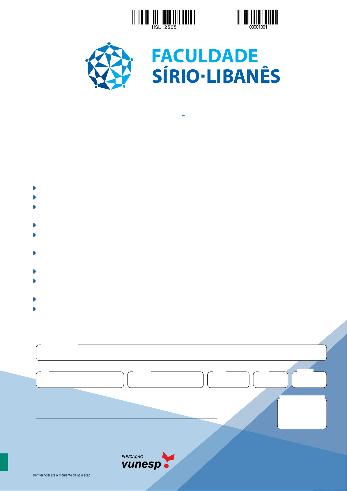Confidencial até o momento da aplicação. Confira seus dados impressos neste caderno. Nesta prova, utilize caneta de tinta preta. Assine apenas no local indicado. Será atribuída nota zero à questão que apresentar nome, rubrica, assinatura, sinal, iniciais ou marcas que permitam a identificação do candidato. Esta prova contém 8 questões discursivas. Quando for permitido abrir o caderno, verifique se está completo ou se apresenta imperfeições. Caso haja algum problema, informe ao fiscal da sala para a devida substituição. A resolução e a resposta de cada questão devem ser apresentadas no espaço correspondente. Não serão consideradas respostas sem as suas resoluções, nem as apresentadas fora do local indicado. Encontra-se neste caderno a Classificação Periódica, que poderá ser útil para a resolução de questões. As provas terão duração total de 5h e o candidato somente poderá sair do prédio depois de transcorridas 3h, contadas a partir do início da prova. Os últimos três candidatos deverão se retirar juntos da sala. Ao final da prova, antes de sair da sala, entregue ao fiscal a Folha de Respostas, a Folha de Redação e os Cadernos de Questões. USO EXCLUSIVO DO FISCAL AUSEntE Assinatura do candidato Nome do candidato Prédio Sala CarteiraInscriçãoRG vestibular – 1o Semestre de 2026 001. prova i Confidencial até o momento da aplicação. 2HSLI2505 | 001-Prova-I Confidencial até o momento da aplicação. CL AS SI FI CA çã O P Er Ió D IC A 3 HSLI2505 | 001-Prova-IConfidencial até o momento da aplicação. rESOLUçãO E rESPOStA RASCUNHO QUEStãO 01 O esquema representa uma célula a combustível, que é uma pilha com alimentação contínua de combustível. Para o fun- cionamento dessa célula, emprega-se como reagentes o metanol (H3COH), o oxigênio (O2) e a água (H2O). (Stefan Kazula et al. “Review of fuel cell technologies and evaluation of their potential and challenges for electrified propulsion systems in commercial aviation”. Proceedings of Global Power and Propulsion Society, 2022. Adaptado.) As semirreações no sentido da redução e os potenciais padrão de redução (E0) relacionados às substâncias químicas que participam das reações dessa célula a combustível são: CO2 (g) + 6H+ (aq) + 6e– H3COH (l) + H2O (l) E0 = +0,03 V O2 (g) + 4H+ (aq) + 4e– 2H2O (l) E0 = +1,23 V a) Determine o estado de oxidação do carbono no CO2. Represente a fórmula estrutural do metanol. b) Escreva a reação global que ocorre durante o funcionamento dessa célula a combustível. Calcule o potencial padrão (ddp) dessa célula. 4HSLI2505 | 001-Prova-I Confidencial até o momento da aplicação. Leia o texto e analise as fórmulas para responder às questões de 02 a 04. Edulcorantes são substâncias naturais ou sintéticas utilizadas para conferir sabor doce a alimentos e bebidas, em subs- tituição ao açúcar. São comercializados como componentes de formulações, que são denominadas adoçantes artificiais, disponíveis na forma de pós contidos em sachês, ou em soluções aquosas. (Imagem gerada por IA. https://chatgpt.com) Três diferentes edulcorantes, 1, 2 e 3, são representados pelas seguintes fórmulas estruturais: Os adoçantes artificiais em pó são constituídos de edulcorantes e aditivos químicos, como o estearato de cálcio, um sal do ácido esteárico, que atua como agente antiumectante. O estearato de cálcio tem características hidrofóbicas e protege o pó do adoçante artificial da formação de aglomerados por ação da umidade. A figura apresenta a fórmula do íon estearato: 5 HSLI2505 | 001-Prova-IConfidencial até o momento da aplicação. RASCUNHO rESOLUçãO E rESPOStA QUEStãO 02 a) O edulcorante 1 tem ponto de fusão igual a 246 ºC. Em qual estado físico o edulcorante 1 se apresenta a 25 ºC? Cite o tipo da ligação química que ocorre entre o potássio e a porção orgânica do edulcorante 1. b) A quais funções orgânicas pertencem os grupos funcionais I e II destacados em vermelho na fórmula estrutural do edulcorante 2? 6HSLI2505 | 001-Prova-I Confidencial até o momento da aplicação. RASCUNHO rESOLUçãO E rESPOStA QUEStãO 03 a) Na molécula do edulcorante 3, um dos átomos de cloro está ligado a um átomo de carbono assimétrico. Qual é o nome da isomeria relacionada a esse tipo de átomo de carbono? Apresente a fórmula molecular do edulcorante 3. b) Qual é a principal força de interação intermolecular entre a molécula do edulcorante 3 e a água (H2O)? As soluções sa- turadas a 20 ºC do edulcorante 3 têm concentração igual a 284 g/L. Calcule a quantidade máxima do edulcorante 3, em gramas, que pode ser obtida por evaporação da água de 250 mL de uma solução aquosa saturada preparada a 20 ºC. 7 HSLI2505 | 001-Prova-IConfidencial até o momento da aplicação. RASCUNHO rESOLUçãO E rESPOStA QUEStãO 04 a) Classifique a cadeia carbônica do íon estearato quanto à polaridade e quanto à saturação das ligações dos átomos de carbono. b) Quando uma mistura de ácido esteárico (C18H36O2) com o óxido de cálcio (CaO) é aquecida, ocorre uma reação química que origina o estearato de cálcio (C18H35O2)2Ca e a água (H2O) como produtos. Empregando as fórmulas moleculares dos reagentes e produtos, escreva a equação química balanceada dessa reação química. Classifique o óxido de cálcio quanto ao seu caráter ácido-base. 8HSLI2505 | 001-Prova-I Confidencial até o momento da aplicação. RASCUNHO rESOLUçãO E rESPOStA QUEStãO 05 O desmatamento na Amazônia Legal registrou um aumento de 17,8% de agosto de 2024 a março de 2025, de acordo com dados do monitoramento do instituto de pesquisa Imazon. No mesmo período, a degradação florestal subiu mais de 329% e bateu um recorde histórico. (https://g1.globo.com, 25.04.2025.) a) Cite uma das principais atividades antrópicas que motivam o desmatamento ilegal na Amazônia. Cite uma alteração climática na região