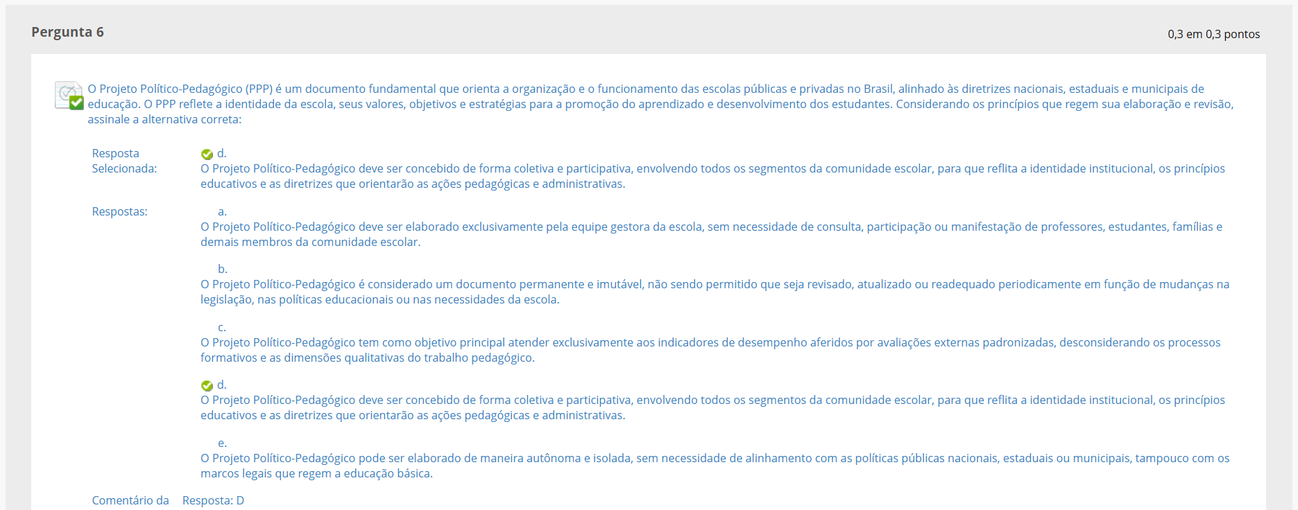 Pergunta 6 0,3 em 0,3 pontos Projeto (PPP) é um documento fundamental que orienta a organização e funcionamento das escolas públicas e privadas no Brasil, alinhado às diretrizes nacionais, estaduais e municipais de educação. PPP reflete a identidade da escola, seus valores, objetivos e estratégias para a promoção do aprendizado e desenvolvimento dos estudantes. Considerando os princípios que regem sua elaboração e revisão, assinale a alternativa correta: Resposta d. Selecionada: Projeto Político-Pedagógico deve ser concebido de forma coletiva e participativa, envolvendo todos segmentos da comunidade escolar, para que reflita a identidade institucional, os princípios educativos e as diretrizes que orientarão as ações pedagógicas e administrativas. Respostas: a. Projeto Político-Pedagógico deve ser elaborado exclusivamente pela equipe gestora da escola, sem necessidade de consulta, participação ou manifestação de professores, estudantes, famílias e demais membros da comunidade escolar. b. Projeto é considerado um documento permanente e imutável, não sendo permitido que seja revisado, atualizado ou readequado periodicamente em função de mudanças na legislação, nas políticas educacionais ou nas necessidades da escola. C. Projeto Político-Pedagógico tem como objetivo principal atender exclusivamente aos indicadores de desempenho aferidos por avaliações externas padronizadas, desconsiderando os processos formativos e as dimensões qualitativas do trabalho pedagógico. d. Projeto Político-Pedagógico deve ser concebido de forma coletiva e participativa, envolvendo todos os segmentos da comunidade escolar, para que reflita a identidade institucional, os princípios educativos e as diretrizes que orientarão as ações pedagógicas e administrativas. e. Projeto Político-Pedagógico pode ser elaborado de maneira autônoma e isolada, sem necessidade de alinhamento com as políticas públicas nacionais, estaduais ou municipais, tampouco com os marcos legais que regem a educação básica. Comentário da Resposta: D
