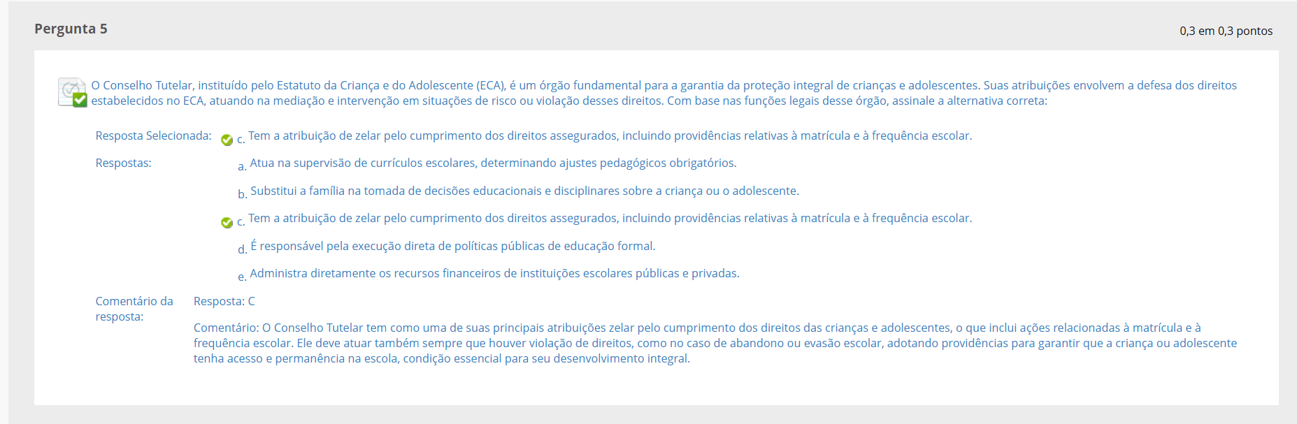 Pergunta 5 0,3 em 0,3 pontos Conselho Tutelar, instituído pelo Estatuto da Criança e do Adolescente (ECA), é um órgão fundamental para a garantia da proteção integral de crianças e adolescentes. Suas atribuições envolvem a defesa dos direitos estabelecidos no ECA, atuando na mediação e intervenção em situações de risco ou violação desses direitos. Com base nas funções legais desse órgão, assinale a alternativa correta: Resposta Selecionada: C. Tem a atribuição de zelar pelo cumprimento dos direitos assegurados, incluindo providências relativas à matrícula e à frequência escolar. Respostas: a. Atua na supervisão de currículos escolares, determinando ajustes pedagógicos obrigatórios. b. Substitui a família na tomada de decisões educacionais e disciplinares sobre a criança ou adolescente. C. Tem a atribuição de zelar pelo cumprimento dos direitos assegurados, incluindo providências relativas à matrícula e à frequência escolar. d. É responsável pela execução direta de políticas públicas de educação formal. e. Administra diretamente os recursos financeiros de instituições escolares públicas e privadas. Comentário da Resposta: C resposta: Comentário: Conselho Tutelar tem como uma de suas principais atribuições zelar pelo cumprimento dos direitos das crianças e adolescentes, que inclui ações relacionadas à matrícula e à frequência escolar. Ele deve atuar também sempre que houver violação de direitos, como no caso de abandono ou evasão escolar, adotando providências para garantir que a criança ou adolescente tenha acesso e permanência na escola, condição essencial para seu desenvolvimento integral.
