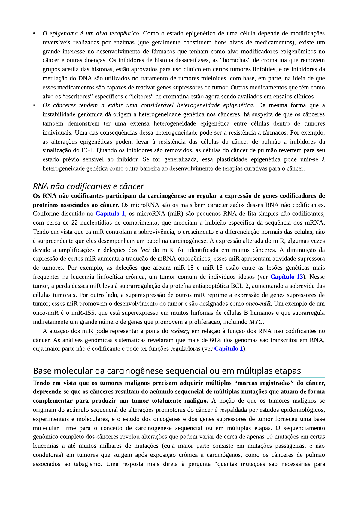 O epigenoma é um alvo terapêutico. Como 0 estado epigenético de uma célula depende de modificações reversíveis realizadas por enzimas (que geralmente constituem bons alvos de medicamentos), existe um grande interesse no desenvolvimento de fármacos que tenham como alvo modificadores epigenômicos no câncer e outras doenças. Os inibidores de histona desacetilases, as "borrachas" de cromatina que removem grupos acetila das histonas, estão aprovados para uso clínico em certos tumores linfoides, e os inibidores da metilação do DNA são utilizados no tratamento de tumores mieloides, com base, em parte, na ideia de que esses medicamentos são capazes de reativar genes supressores de tumor. Outros medicamentos que têm como alvo os "escritores" específicos e "leitores" de cromatina estão agora sendo avaliados em ensaios clínicos Os cânceres tendem a exibir uma considerável heterogeneidade epigenética. Da mesma forma que a instabilidade genômica dá origem à heterogeneidade genética nos cânceres, há suspeita de que os cânceres também demonstrem ter uma extensa heterogeneidade epigenética entre células dentro de tumores individuais. Uma das consequências dessa heterogeneidade pode ser a resistência a fármacos. Por exemplo, as alterações epigenéticas podem levar à resistência das células do câncer de pulmão a inibidores da sinalização do EGF. Quando os inibidores são removidos, as células do câncer de pulmão revertem para seu estado prévio sensível ao inibidor. Se for generalizada, essa plasticidade epigenética pode unir-se à heterogeneidade genética como outra barreira ao desenvolvimento de terapias curativas para 0 câncer. RNA não codificantes e câncer Os RNA não codificantes participam da carcinogênese ao regular a expressão de genes codificadores de proteínas associados ao câncer. Os microRNA são os mais bem caracterizados desses RNA não codificantes. Conforme discutido no Capítulo 1, os microRNA (miR) são pequenos RNA de fita simples não codificantes, com cerca de 22 nucleotídios de comprimento, que medeiam a inibição específica da sequência dos mRNA. Tendo em vista que os miR controlam a sobrevivência, 0 crescimento e a diferenciação normais das células, não é surpreendente que eles desempenhem um papel na carcinogênese. A expressão alterada do miR, algumas vezes devido a amplificações e deleções dos loci do miR, foi identificada em muitos cânceres. A diminuição da expressão de certos miR aumenta a tradução de mRNA oncogênicos; esses miR apresentam atividade supressora de tumores. Por exemplo, as deleções que afetam miR-15 e miR-16 estão entre as lesões genéticas mais frequentes na leucemia linfocítica crônica, um tumor comum de indivíduos idosos (ver Capítulo 13). Nesse tumor, a perda desses miR leva à suprarregulação da proteína antiapoptótica BCL-2, aumentando a sobrevida das células tumorais. Por outro lado, a superexpressão de outros miR reprime a expressão de genes supressores de tumor; esses miR promovem 0 desenvolvimento do tumor e são designados como onco-miR. Um exemplo de um onco-miR é miR-155, que está superexpresso em muitos linfomas de células humanos e que suprarregula indiretamente um grande número de genes que promovem a proliferação, incluindo MYC. A atuação dos miR pode representar a ponta do iceberg em relação à função dos RNA não codificantes no câncer. As análises genômicas sistemáticas revelaram que mais de 60% dos genomas são transcritos em RNA, cuja maior parte não é codificante e pode ter funções reguladoras (ver Capítulo 1). Base molecular da carcinogênese sequencial ou em múltiplas etapas Tendo em vista que os tumores malignos precisam adquirir múltiplas "marcas registradas" do câncer, depreende-se que os cânceres resultam do acúmulo sequencial de múltiplas mutações que atuam de forma complementar para produzir um tumor totalmente maligno. A noção de que os tumores malignos se originam do acúmulo sequencial de alterações promotoras do câncer é respaldada por estudos epidemiológicos, experimentais e moleculares, e 0 estudo dos oncogenes e dos genes supressores de tumor forneceu uma base molecular firme para 0 conceito de carcinogênese sequencial ou em múltiplas etapas. sequenciamento genômico completo dos cânceres revelou alterações que podem variar de cerca de apenas 10 mutações em certas leucemias a até muitos milhares de mutações (cuja maior parte consiste em mutações passageiras, e não condutoras) em tumores que surgem após exposição crônica a carcinógenos, como os cânceres de pulmão associados ao tabagismo. Uma resposta mais direta à pergunta "quantas mutações são necessárias paraestabelecer um tumor completamente maligno?" é obtida das tentativas experimentais de transformar células humanas normais em cancerígenas com combinações de oncogenes, alguns dos quais derivados de vírus transformadores (descritos mais adiante). Por exemplo, as células epiteliais humanas normais podem ser transformadas pela seguinte combinação de eventos: (1) ativação de RAS; (2) inativação de RB; (3) inativação da p53; (4) inativação de PP2A, uma fosfatase supressora de tumor, que é um regulador negativo de muitas vias de sinalização; e (5) expressão constitutiva da telomerase. As células portadoras de todas essas alterações são imortais e produzem tumores invasivos e totalmente malignos quando injetadas em camundongos com imunodeficiência. Diferentemente do que ocorre no laboratório, esses eventos presumivelmente nunca são observados de modo simultâneo durante 0 desenvolvimento natural de um câncer humano, porém ocorre de maneira sequencial. Qual é a evidência de que isso ocorre dessa maneira? Um exemplo clássico de aquisição incremental do fenótipo maligno é encontrado no carcinoma de cólon. Muitos desses cânceres evoluem por meio de uma série de estágios morfologicamente