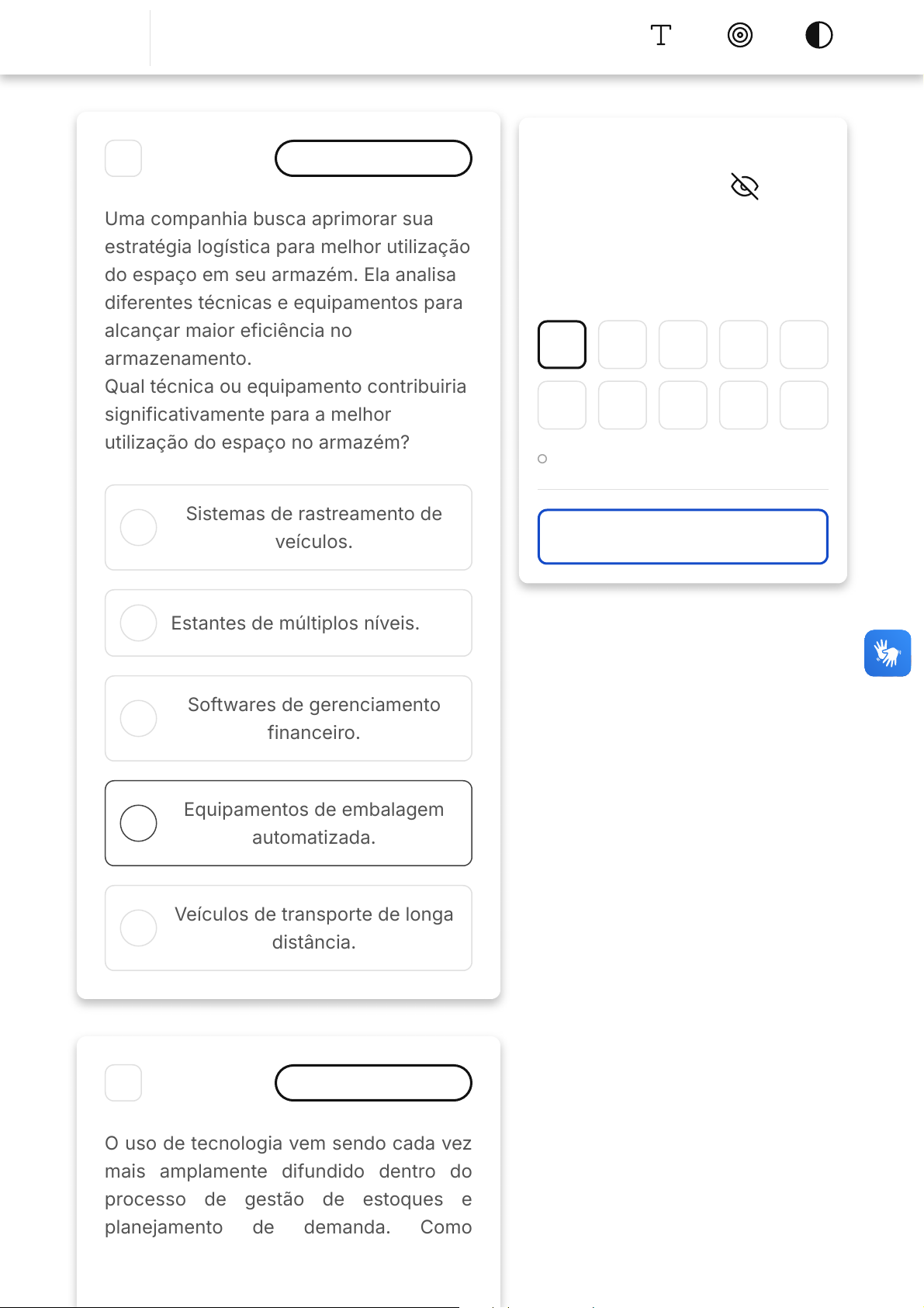 A B C D E 1 Marcar para revisão Uma companhia busca aprimorar sua estratégia logística para melhor utilização do espaço em seu armazém. Ela analisa diferentes técnicas e equipamentos para alcançar maior eficiência no armazenamento. Qual técnica ou equipamento contribuiria significativamente para a melhor utilização do espaço no armazém? Sistemas de rastreamento de veículos. Estantes de múltiplos níveis. Softwares de gerenciamento financeiro. Equipamentos de embalagem automatizada. Veículos de transporte de longa distância. 2 Marcar para revisão O uso de tecnologia vem sendo cada vez mais amplamente difundido dentro do processo de gestão de estoques e planejamento de demanda. Como 00 hora : 49 min : 50 seg Ocultar Questão 1 de 10 Em branco (10) Finalizar prova 1 2 3 4 5 6 7 8 9 10 SM1 Logística 4.0 A B C D E chamamos ao softwares dedicados à gestão dos processos de armazenagem? WMS TMS VMS SGS ISO 3 Marcar para revisão A logística de estoques e armazenagem é um componente estratégico para o sucesso operacional das empresas. Diversos fatores influenciam as decisões sobre a alocação de materiais em armazéns. Ao considerar a gestão logística de estoques e armazenagem, qual dos seguintes critérios é relevante para a alocação eficiente de materiais em armazéns? A B C D E Optar por materiais que demandam uma cobertura térmica específica, garantindo que a temperatura do armazém esteja sempre ajustada ao clima externo. Priorizar produtos de alto valor para maximizar o retorno financeiro, independentemente do custo operacional associado à movimentação desses materiais. Buscar equilibrar o peso dos produtos em diferentes andares do armazém para manter uma distribuição uniforme da carga e evitar sobrecargas. Procurar maximizar os momentos de movimentação agregados, mesmo que isso resulte em custos operacionais mais elevados, para otimizar os tempos de atendimento ao cliente. Considerar a localização geográfica do armazém em relação aos fornecedores e clientes para minimizar os custos de transporte e reduzir os prazos de entrega. 4 Marcar para revisão O sistema logístico é composto de diversos elementos. O que pode ocorrer se uma empresa adotar uma estratégia A B C D E A B C isolada, com base em um único elemento do sistema logístico? Aumento da eficiência operacional. Redução dos custos logísticos. Melhoria na gestão de estoques. Impactos em outros componentes do sistema. Aumento da satisfação do cliente. 5 Marcar para revisão Os trabalhos de transporte de cargas dentro de um armazém são influenciados pelo arranjo físico e pelos equipamentos utilizados. Desse modo, o gerente deve buscar maior eficiência: aumentando as distâncias entre movimentações para garantir a segurança dos trabalhadores. evitando a consolidação de cargas para reduzir os custos. usando transportadoras de esteiras de roletes para roteiros aleatórios. D E A B C D E padronizando os dispositivos de armazenagem para os diversos produtos. utilizando tratores para movimentar cargas em fluxos verticais. 6 Marcar para revisão A gestão da distribuição física e os sistemas de estoque de múltiplos estágios são muito utilizados pelas empresas. Na rede de suprimentos, os armazéns e centros de distribuição têm, entre outras, as funções abaixo, EXCETO a de: simplificar o sistema de comunicação. reduzir o número de rotas de transporte. proteger as cargas embarcadas contra furtos. prover pontos para fracionamento de volumes. melhorar a coordenação entre a oferta e a demanda. 7 Marcar para revisão A B C D E A função Logística tornou-se fundamental para manter a competitividade de empresas na era do comércio globalizado. Sobre as responsabilidades básicas da função Logística, desde o ponto de origem até o ponto de consumo, analise os procedimentos abaixo. I - Manter a qualidade e integridade dos produtos até sua entrega ao cliente. II - Entregar os produtos aos clientes sempre o mais rápido possível. III - Manter o cliente final constantemente informado sobre o status da entrega dos produtos. IV - Entregar o produto certo no lugar certo, ao menor custo possível. São responsabilidades básicas da função Logística APENAS os procedimentos: I e IV. II e III. I, II e IV. I, III e IV. II, III e IV. 8 Marcar para revisão O gerenciamento eficaz da cadeia de suprimentos (Supply Chain Management - SCM) desempenha um papel vital na integração e otimização dos processos externos à empresa. Explorando o conceito proposto por Slack, vamos nos A B C D E concentrar em uma dimensão específica relacionada às atividades fora dos limites organizacionais. Segundo o conceito apresentado por Slack, qual termo é utilizado para descrever as atividades logísticas que ocorrem fora da empresa e englobam interações entre fornecedores, transportadoras e a área de compras? Gestão de fornecedores. Logística de distribuição. Logística de produção. Cadeia de abastecimento Logística externa. 9 Marcar para revisão O gerenciamento da cadeia de suprimentos (supply chain management) envolve a coordenação estratégica e operacional de todas as atividades relacionadas à produção, estoques, transporte e distribuição, visando a integração eficiente de fornecedores, fabricantes, distribuidores e clientes para atender às demandas do mercado. Considerando seus conhecimentos a respeito supply chain management, avalie as asserções abaixo e a relação entre elas. I) Dentro do planejamento logístico, a decisão a respeito da localização dos estoques e dos centros de distribuição é A B C D E fortemente influenciada pela maneira como os estoques serão gerenciados. PORQUE II) Na estratégia de transportes são tomadas decisões que envolvem seleção dos meios de transporte, volumes de embarque, programação e rotas Assinale a alternativa correta: As asserções I e II são proposições verdadeiras, mas a II não é uma justificativa da I