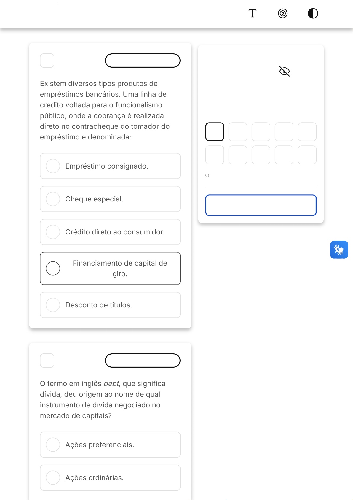 A B C D E A B 1 Marcar para revisão Existem diversos tipos produtos de empréstimos bancários. Uma linha de crédito voltada para o funcionalismo público, onde a cobrança é realizada direto no contracheque do tomador do empréstimo é denominada: Empréstimo consignado. Cheque especial. Crédito direto ao consumidor. Financiamento de capital de giro. Desconto de títulos. 2 Marcar para revisão O termo em inglês debt, que significa dívida, deu origem ao nome de qual instrumento de dívida negociado no mercado de capitais? Ações preferenciais. Ações ordinárias. 00 hora : 49 min : 57 seg Ocultar Questão 1 de 10 Em branco (10) Finalizar prova 1 2 3 4 5 6 7 8 9 10 SM1 Mercado Financeiro C D E A B C Debêntures. Commercial papers. Treasury Bonds. 3 Marcar para revisão A intermediação financeira é um serviço que atende grande parte economia. Qual das seguintes afirmações sobre a intermediação financeira é verdadeira? A intermediação financeira não desempenha um papel significativo na economia nacional A intermediação financeira visa exclusivamente atender às necessidades dos superavitários A intermediação financeira facilita a transferência de recursos entre agentes superavitários e deficitários D E A B C D E A intermediação financeira é uma atividade recente que surgiu com o advento das tecnologias digitais A intermediação financeira traz ônus financeiros para os agentes deficitários 4 Marcar para revisão Qual dos órgãos é responsável pelas normas relativas aos bancos comerciais? Ministério da Fazenda. SUSEP. CNPC. CNSP. CMN. 5 Marcar para revisão As instituições financeiras prestam alguns serviços que impactam nossa economia. Quais são as transformações que ocorrem na intermediação financeira? A B C D E A B C Transformação de preços e transformação de volumes de mercadorias transacionadas Transformação de produtos e transformação de distribuição Transformação de liquidez Transformação de oferta Transformação de renda 6 Marcar para revisão O Sistema Financeiro Nacional é parte fundamental na sociedade econômica atual. Nesse contexto, o que é a base monetária e como ela se relaciona com a oferta monetária? O volume total de moeda na economia e sua oferta depende do volume físico de moeda criada pelo Banco Central. O volume físico de moeda criada pelo Banco Central e sua oferta depende do volume total de moeda na economia. O volume total de moeda na economia é determinado pela quantidade de pessoas que consomem e poupam. D E A B C D E O volume físico de moeda criada pelo Banco Central é determinado pela quantidade de empresas que existem na economia. O volume total de moeda na economia é determinado pelo nível de renda per capita do país. 7 Marcar para revisão Em 1995 houve uma mudança na composição do Conselho Monetário Nacional (CMN). Que mudança foi essa? A inclusão de representantes de sindicatos patronais e dos trabalhadores. A nomeação de três ministros para compor o CMN. A extinção do CMN e criação de um novo órgão regulador. A redução do número de membros do governo no CMN. A indicação do presidente do Banco Central como ministro da Fazenda. A B C D E 8 Marcar para revisão Os títulos de renda fixa são predominantemente negociados no chamado mercado de balcão, e não em bolsa de valores, apresentando alguns destes títulos mercados bastante líquidos, como o caso dos papéis emitidos pelo Governo Federal. A duration de Macaulay para um título de renda fixa pode ser interpretado como: Uma média ponderada do tempo de vencimento dos fluxos de caixa de um título a valor futuro Um desvio padrão dos prazos de vencimento dos fluxos de caixa de um título a valor presente Uma média ponderada do tempo de vencimento dos fluxos de caixa de um título a valor presente Um desvio padrão dos prazos de vencimento dos fluxos de caixa de um título a valor futuro Uma média aritmética simples de vencimento dos fluxos de caixa de um título a valor presente 9 Marcar para revisão A B C D E A duration foi criada como indicador de finanças empresariais, em 1938, pelo financista Macaulay, mas só difundido na década de 70 e posteriormente aplicado em análises macroeconômicas. Admita um empréstimo de R$ 50.000,00 pelo prazo de dois anos. A taxa de juro contratada é de 12% ao ano. Para liquidação do empréstimo considerando pagamento do principal ao final de dois anos e juros anualmente, a duration é: 1,89 ano 1,47 ano 1,36 ano 1,27 ano 1,12 ano 10 Marcar para revisão A volatilidade de um título é o percentual de variação dos preços do título em razão de modificações verificadas nas taxas de juros de mercado. Assinale a afirmativa correta. A B C D E Para um título com valor de face, cupom e maturity dados, quanto mais alta a taxa de desconto, maior o deságio Para um título com valor de face, maturity e taxa de desconto dados, quanto menor o retorno oferecido, menor o preço de negociação Para um título com maturity, cupom e taxa de desconto dados, quanto maior o valor de face, maior o preço de negociação Para um título com valor de face, cupom e maturity dados, quanto mais alta a taxa de desconto, maior o preço de negociação Para um título com valor de face, maturity e taxa de desconto dados, quanto maior o retorno oferecido, o ágio permanece igual