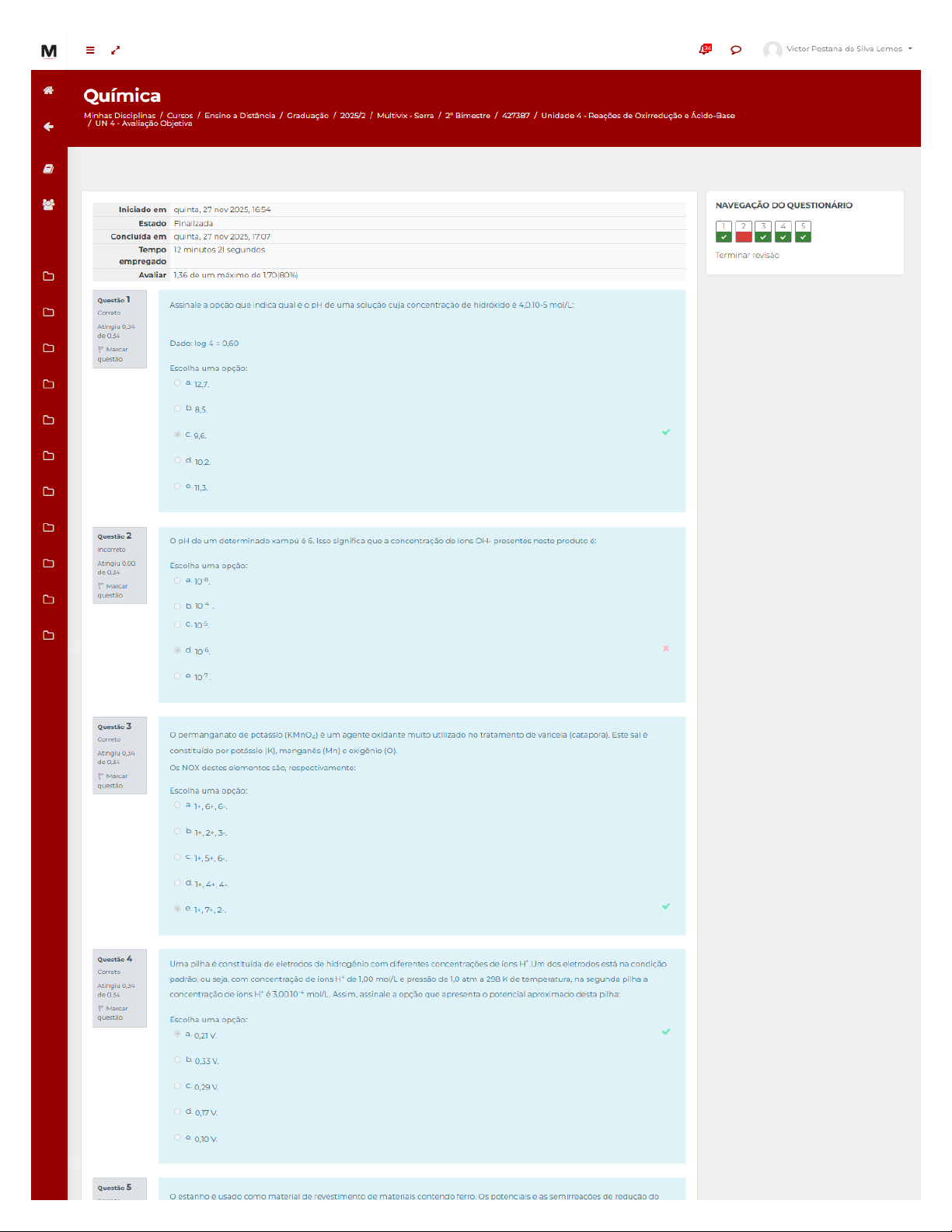 M Victor Pestana da Silva Lemos Química Minhas Disciplinas / Cursos / Ensino a Distância / Graduação / 2025/2 / Multivix Serra / 2° Bimestre / 427387 / Unidade 4 Reações de Oxirredução e Ácido-Base / UN 4 Avaliação Objetiva Iniciado em quinta, 27 nov 2025, 16:54 NAVEGAÇÃO DO QUESTIONÁRIO Estado Finalizada 1 2 3 4 5 Concluída em quinta, 27 nov 2025, 17:07 Tempo 12 minutos 21 segundos Terminar revisão empregado Avaliar 1,36 de um máximo de 1,70(80%) Questão 1 Assinale a opção que indica qual é pH de uma solução cuja concentração de hidróxido é 4,0.10-5 Correto Atingiu 0,34 de Dado: log 4 0,60 P Marcar questão Escolha uma opção: e. Questão 2 pH de um determinado é 6. Isso significa que a concentração de ions OH- presentes neste produto é: Atingiu Escolha uma opção: de 0,34 P Marcar questão Questão 3 permanganato de potássio é um agente oxidante muito utilizado no tratamento de varicela (catapora). Este sal é Correto Atingiu 0,34 constituído por potássio (K), manganês (Mn) e oxigênio (O). de Os NOX destes elementos são, respectivamente: P Marcar questão Escolha uma opção: Questão 4 Uma pilha é constituída de eletrodos de hidrogênio com diferentes concentrações de ions H* Um dos eletrodos está na condição Correto padrão, ou seja, com concentração de ions H* de 1,00 mol/L e pressão de 1,0 atm a 298 K de temperatura, na segunda pilha a Atingiu 0,34 de concentração de ions é 3,00.10 Assim, assinale a opção que apresenta potencial aproximado desta pilha: P Marcar questão Escolha uma opção: Questão 5 estanho é usado como material de revestimento de materiais contendo ferro. Os potenciais e as semirreações de redução doAtingiu 0,34 estanho são: de 0,34 P Marcar questão +2e +2e -0,14 V A finalidade do estanho é proteger ferro, por isso este metal é adicionado sobre a sua na forma de uma fina camada. No entanto, quando a fina camada de estanho é danificada, O metal é exposto e forma-se uma pilha, ocorrendo um efeito indesejado. Este efeito pode ser explicado pela formação de uma pilha de contato entre estes dois metais. Considerando as informações e os potenciais dos dois metais, assinale a opção correta: Escolha uma opção: a. Na pilha, O ferro reduz e O potencial desta é -0,30 V. b. Na pilha, O estanho oxida e potencial desta é +0,30 V. C. Na pilha, O ferro oxida e potencial desta é +0,30 V. d. Na pilha, O ferro reduz e O potencial desta é +0,30 V. e. Na pilha, estanho reduz e potencial desta é -0,30 V. Terminar revisão Conteúdo Online Seguir para... Conteúdo Online - MOODLE BY ITVIX