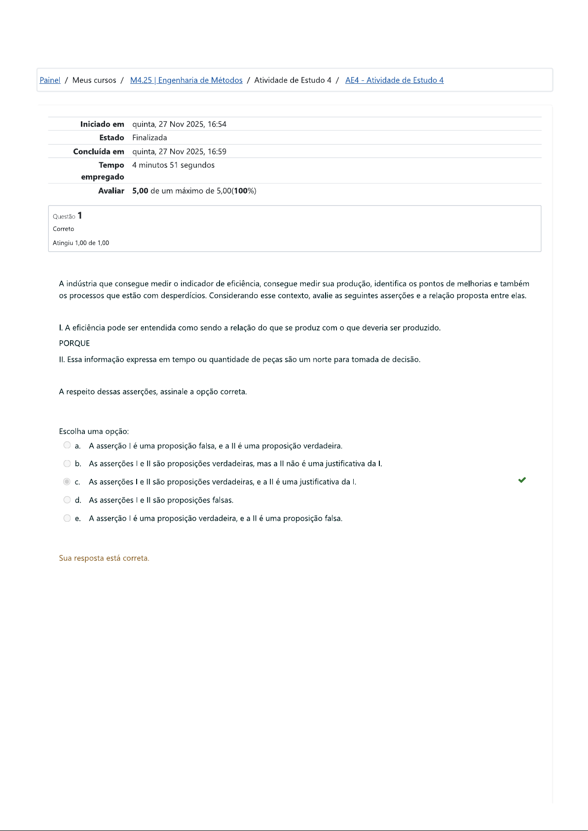 Painel / Meus cursos / M4.25 Engenharia de Métodos / Atividade de Estudo 4 / AE4 - Atividade de Estudo 4 Iniciado em quinta, 27 Nov 2025, 16:54 Estado Finalizada Concluída em quinta, 27 Nov 2025, 16:59 Tempo 4 minutos 51 segundos empregado Avaliar 5,00 de um máximo de 5,00(100%) Questão 1 Correto Atingiu 1,00 de 1,00 A indústria que consegue medir o indicador de eficiência, consegue medir sua produção, identifica os pontos de melhorias e também os processos que estão com desperdícios. Considerando esse contexto, avalie as seguintes asserções e a relação proposta entre elas. I. A eficiência pode ser entendida como sendo a relação do que se produz com o que deveria ser produzido. PORQUE II. Essa informação expressa em tempo ou quantidade de peças são um norte para tomada de decisão. A respeito dessas asserções, assinale a opção correta. Escolha uma opção: a. A asserção I é uma proposição falsa, e a é uma proposição verdadeira. b. As asserções e são proposições verdadeiras, mas a não é uma justificativa da I. C. As asserções e II são proposições verdadeiras, e a II é uma justificativa da I. d. As asserções e II são proposições falsas. e. A asserção lé uma proposição verdadeira, e a é uma proposição falsa. Sua resposta está correta.Questão 2 Correto Atingiu 1,00 de 1,00 Suponha que você começou a trabalhar em uma empresa de iogurtes e uma das suas primeiras tarefas é ter a informação de produtividade da fábrica. Sendo assim, escolha a alternativa que melhor representa essas informações. Escolha uma opção: a. A produtividade é resultante do trabalho indireto do homem sobre a produção, pois depende de fatores auxiliares. b. A eficiência é resultante do trabalho indireto do homem sobre a produção, pois depende de fatores auxiliares. C. A produtividade é resultante do trabalho indireto do homem sobre a produção, pois depende por exemplo de disponibilidade de maquinários. d. A eficiência deverá ser observada como sendo o resultado direto do trabalhador sobre a produção. e. A produtividade é resultante do trabalho indireto do homem sobre a produção, pois depende por exemplo de disponibilidade de materiais. Sua resposta está correta. Questão 3 Correto Atingiu 1,00 de 1,00 Trabalhar com números é importante para que as melhores decisões sejam tomadas, de forma mais assertiva e confiável. Os indicadores proporcionam essas decisões pois são construídos ao longo do período de análise. Diante desse contexto, preencha as lacunas. Escolha uma opção: a. Organização, Desempenho, Indicador. b. Virtualização, Desempenho, Indicador. C. Ineficiência, Desempenho, Indicador. d. Negligência, Desempenho, Indicador. e. Realidade, Desempenho, Indicador. Sua resposta está correta.Questão 4 Correto Atingiu 1,00 de 1,00 Os indicadores são definidos de acordo com os objetivos das organizações, ou seja, de acordo com a informação que a mesma deseja para tomada de decisão. Considerando esse contexto, avalie as seguintes asserções e a relação proposta entre elas. I. planejamento da produção é essencial para acompanhar a produtividade da organização. PORQUE II. planejamento é um norte para as ações, mas acompanhar e controlar o processo por meio de indicadores de desempenho é primordial para validar as ações que formam planejadas. A respeito dessas asserções, assinale a opção correta. Escolha uma opção: a. A asserção é uma proposição falsa, e a é uma proposição verdadeira. b. A asserção é uma proposição verdadeira, e a é uma proposição falsa. C. As asserções e são proposições verdadeiras, e a é uma justificativa da d. As asserções e são proposições falsas. e. As asserções e são proposições verdadeiras, mas a não é uma justificativa da I. Sua resposta está correta. Questão 5 Correto Atingiu 1,00 de 1,00 A fábrica de chinelos "Calce bem" está aumentando sua área de atuação e precisa saber a quantidade de chinelos que consegue produzir mensalmente, assim precisou calcular sua capacidade produtiva. Diante desse contexto, escolha a alternativa correta: Escolha uma opção: a. A capacidade produtiva é sinônimo de faturamento diário. b. Capacidade produtiva é sinônimo de volume de produção. C. Capacidade produtiva é sinônimo de número de máquinas. d. A capacidade está relacionada a dimensão tempo. e. Capacidade produtiva é sinônimo de número de colaboradores. Sua resposta está correta. Aula Digital 16 Seguir para... PR1 Prática