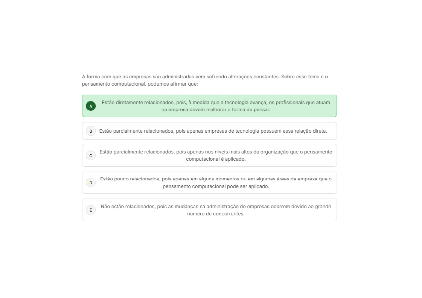 A forma com que as empresas são administradas vem sofrendo alterações constantes. Sobre esse tema e 0 pensamento computacional, podemos afirmar que: Estão diretamente relacionados, pois, à medida que a tecnologia avança, os profissionais que atuam A na empresa devem melhorar a forma de pensar. Estão parcialmente relacionados, pois apenas empresas de tecnologia possuem essa relação direta. Estão parcialmente relacionados, pois apenas nos níveis mais altos da organização que 0 pensamento C computacional é aplicado. Estão pouco relacionados, pois apenas em alguns momentos ou em algumas áreas da empresa que 0 D pensamento computacional pode ser aplicado. Não estão relacionados, pois as mudanças na administração de empresas ocorrem devido ao grande E número de concorrentes.