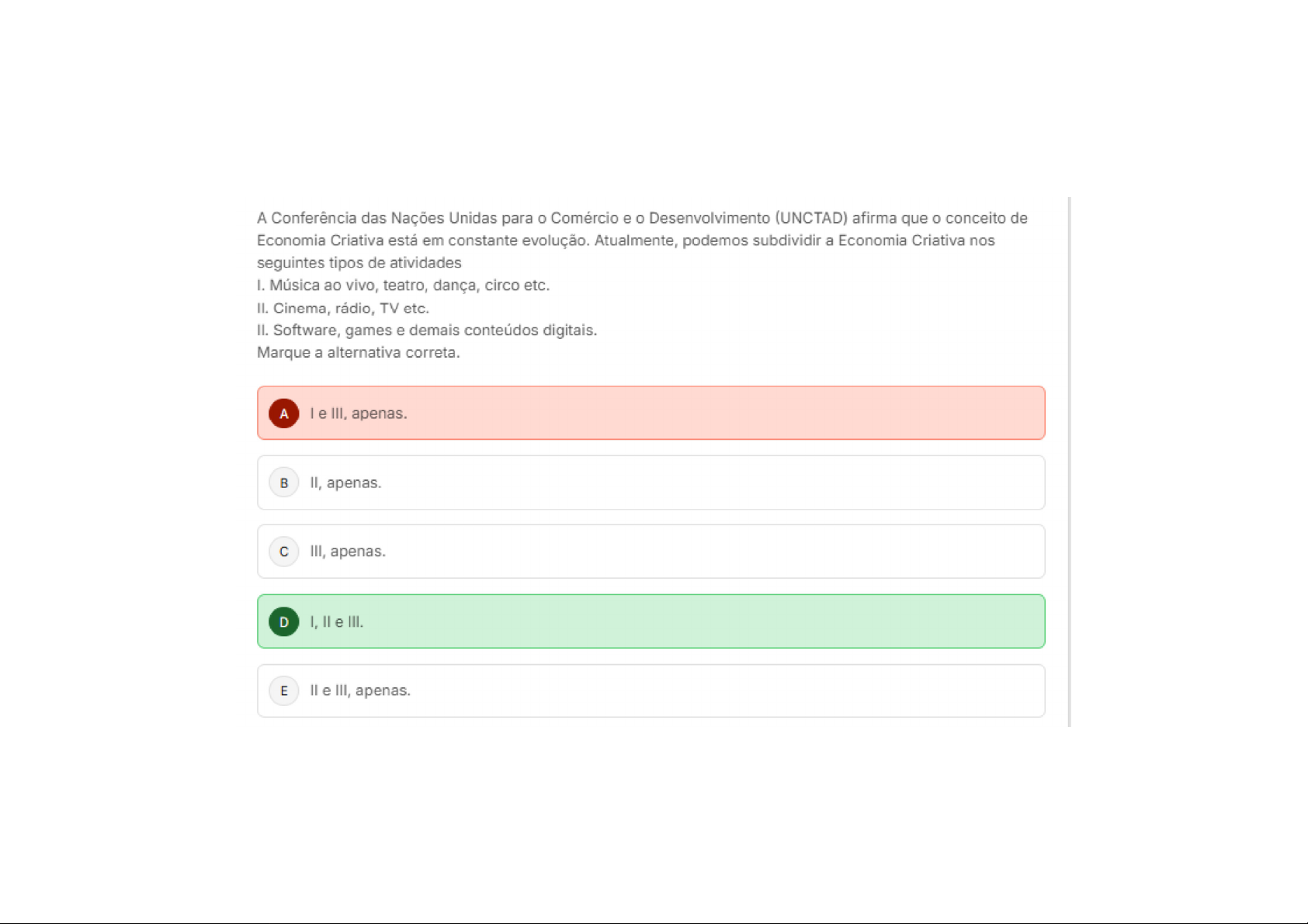 A Conferência das Nações Unidas para Comércio e 0 Desenvolvimento (UNCTAD) afirma que 0 conceito de Economia Criativa está em constante evolução. Atualmente, podemos subdividir a Economia Criativa nos seguintes tipos de atividades Música ao vivo, teatro, dança, circo etc. II. Cinema, rádio, TV etc. II. Software, games e demais conteúdos digitais. Marque a alternativa correta. A e III, apenas. II, apenas. C III, apenas. D I, e III. E e III, apenas.