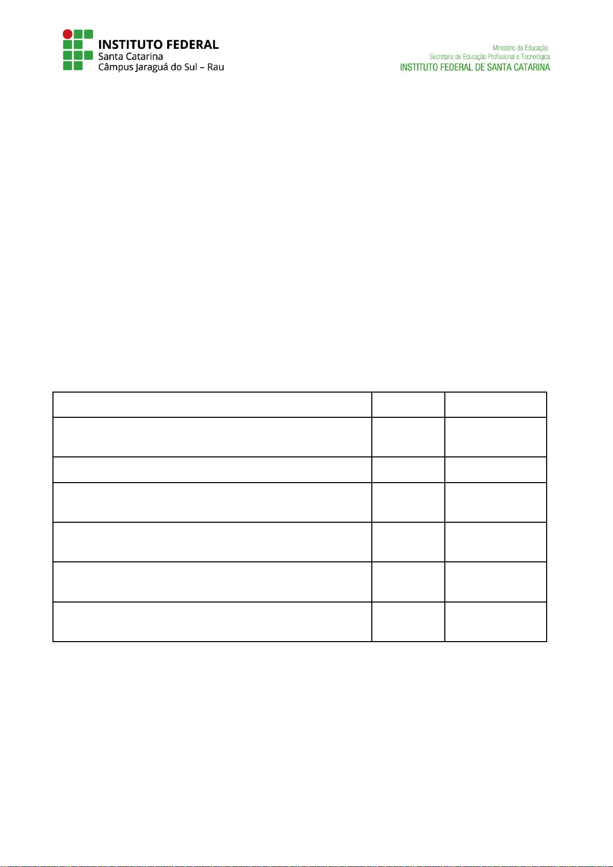 ________________________________________________________________________________ _____________________________________________________________________________________________________________________ Instituto Federal de Santa Catarina – Jaraguá do Sul - RAU Rua dos Imigrantes, 445 | Rau | Jaraguá do Sul /SC | CEP: 89254-430 Fone: (47) 3276-9600 | www.gw.ifsc.edu.br | CNPJ 11.402.887/0005-94 CURSO: Engenharia Elétrica. Campus Jaraguá do Sul - Rau DOCENTE: Marcos Antônio Salvador COMPONENTE CURRICULAR: Eletrônica Digital – ELD Estudante: ________________________________________________ Data: ___/___/___ TRABALHO FINAL DE ELETRÔNICA DIGITAL 1. Os trabalhos deverão ser realizados individualmente; 2. Não será permitida a repetição de temas; 3. Deverão ser trabalhos práticos feitos por meio da simulação em ambiente virtual apropriado; 4. O trabalho deve contemplar os seguintes tópicos: a. Demonstração do desenvolvimento via apresentação oral conforme data especificada no cronograma de aulas cadastrado no SIGAA; b. Entrega do arquivo de apresentação que deverá conter pelo menos uma breve contextualização/descrição do projeto, seu desenvolvimento, circuito resultante, seu funcionamento, correlação com aplicação prática e referências. 5. A avaliação seguirá os seguintes critérios: Descrição do Critério Valor máx. Valor Atribuído Nível de complexidade técnica do projeto: detalhamento e profundidade 2,5 Simulação coerente com a funcionalidade apresentada 2,5 Capacidade de síntese (Transmitir a ideia do projeto sem perder a perspectiva da essência do conteúdo) 1,0 Apresentação com linguagem clara e coerente com as teorias de eletrônica digital 1,5 Estabelecimento das correlações entre a solução simulada e as possíveis aplicações práticas 1,5 Qualidade do material apresentado (Formato, estilo e apresentação do conteúdo, etc...) 1,0 6. A escolha dos temas é livre, objetivando projetar um sistema digital prático para solucionar o problema escolhido, sem o emprego de microcontroladores, microprocessadores e similares. Abaixo estão algumas sugestões: a. Relógio digital com recursos; b. Frequêncímetro/contador de frequência; c. Sistema de monitoramento de portas (alarme); d. Voltímetro digital; e. Controlador de motor de passo; f. Contador de passagem; g. Controle de fila, (painel de senha para fila); h. Fechadura eletrônica com segredo; i. Medidor de rotações de um motor.