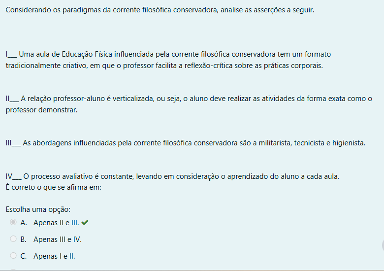Considerando paradigmas da corrente conservadora, analise as asserções a seguir. Uma aula de Educação Física influenciada pela corrente filosófica conservadora tem um formato tradicionalmente criativo, em que O professor facilita a reflexão-crítica sobre as práticas corporais. II A relação professor-aluno é verticalizada, ou seja, O aluno deve realizar as atividades da forma exata como O professor demonstrar. III As abordagens influenciadas pela corrente filosófica conservadora são a militarista, tecnicista e higienista. IV_O processo avaliativo é constante, levando em consideração O aprendizado do aluno a cada aula. É correto O que se afirma em: Escolha uma opção: A. Apenas II e III. B. Apenas III e IV. C. Apenas I e II.