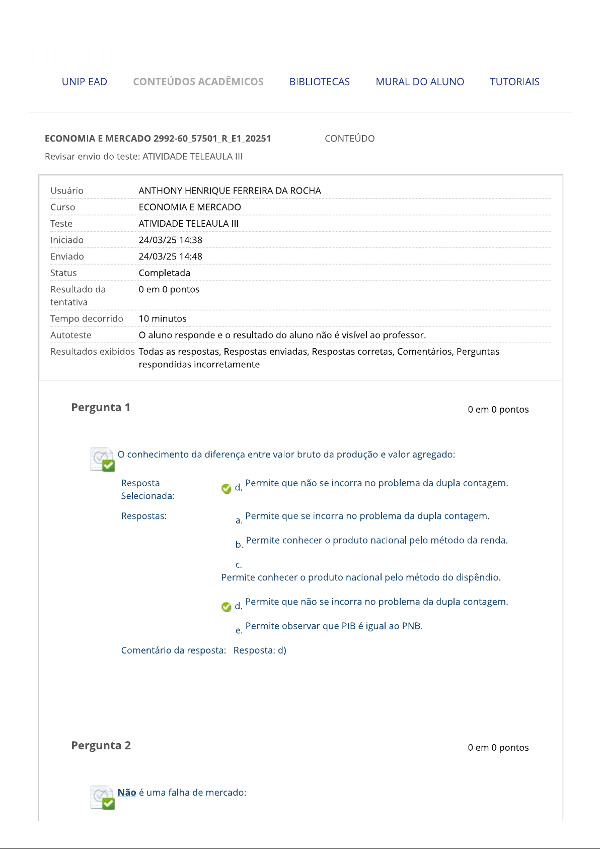 UNIP EAD CONTEÚDOS ACADÊMICOS BIBLIOTECAS MURAL DO ALUNO TUTORIAIS ECONOMIA E MERCADO 2992-60_57501_R_E1_20251 CONTEÚDO Revisar envio do teste: ATIVIDADE TELEAULA III Usuário ANTHONY HENRIQUE FERREIRA DA ROCHA Curso ECONOMIA E MERCADO Teste ATIVIDADE TELEAULA III Iniciado 24/03/25 14:38 Enviado 24/03/25 14:48 Status Completada Resultado da 0 em 0 pontos tentativa Tempo decorrido 10 minutos Autoteste aluno responde e o resultado do aluno não é visível ao professor. Resultados exibidos Todas as respostas, Respostas enviadas, Respostas corretas, Comentários, Perguntas respondidas incorretamente Pergunta 1 0 em 0 pontos conhecimento da diferença entre valor bruto da produção e valor agregado: Resposta d. Permite que não se incorra no problema da dupla contagem. Selecionada: Respostas: a. Permite que se incorra no problema da dupla contagem. b. Permite conhecer produto nacional pelo método da renda. Permite conhecer produto nacional pelo método do dispêndio. d. Permite que não se incorra no problema da dupla contagem. Permite observar que PIB é igual ao PNB. e. Comentário da resposta: Resposta: d) Pergunta 2 0 em 0 pontos Não é uma falha de mercado:Resposta Selecionada: d. Corrupção. Respostas: a. Informação imperfeita. b. Externalidades, tanto positivas quanto negativas. Presença de monopólios. d. Corrupção. e. Inflação. Comentário da resposta: Resposta: d) Pergunta 3 0 em 0 pontos Não é um instrumento de política monetária: Resposta Selecionada: a. Imposto inflacionário. Respostas: Imposto inflacionário. a. b. Recolhimento compulsório. Administração da taxa de juros. d. Mercado aberto. Selecionar crédito. e. Comentário da resposta: Resposta: a) Pergunta 4 0 em 0 pontos Qual dos itens não representa uma característica física da moeda? Resposta Selecionada: e. Padrão de pagamento diferido. Respostas: a. Indestrutibilidade. b. Inalterabilidade. d. Homogeneidade. Padrão de pagamento diferido. e.Comentário da resposta: Resposta: e) Quarta-feira, 2 de Abril de 2025 22h15min37s GMT-03:00 OK