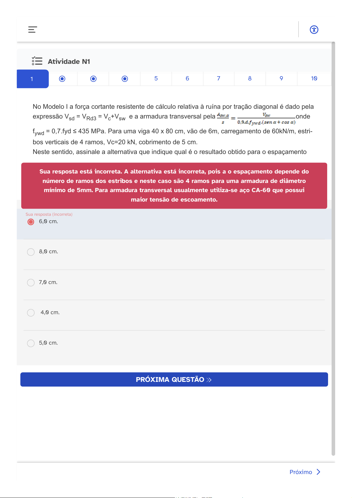 Atividade N1 No Modelo I a força cortante resistente de cálculo relativa à ruína por tração diagonal é dado pela expressão Vsd = VRd3 = Vc+Vsw e a armadura transversal pela onde fywd = 0,7.fyd ≤ 435 MPa. Para uma viga 40 x 80 cm, vão de 6m, carregamento de 60kN/m, estri- bos verticais de 4 ramos, Vc=20 kN, cobrimento de 5 cm. Neste sentido, assinale a alternativa que indique qual é o resultado obtido para o espaçamento Sua resposta está incorreta. A alternativa está incorreta, pois a o espaçamento depende do número de ramos dos estribos e neste caso são 4 ramos para uma armadura de diâmetro mínimo de 5mm. Para armadura transversal usualmente utiliza-se aço CA-60 que possui maior tensão de escoamento. 6,0 cm. Sua resposta (incorreta) 8,0 cm. 7,0 cm. 4,0 cm. 5,0 cm. PRÓXIMA QUESTÃO 5 6 7 8 9 101 Próximo 27/11/2025, 21:03 Anhembi Morumbi DL https://student.ulife.com.br/ContentPlayer/Index?lc=aOgevN3U93DrOPu7DDhmwA%3d%3d&l=MyRBhaK9um9oQv5Nv%2bcDzQ%3d%3d&cd=1… 1/1