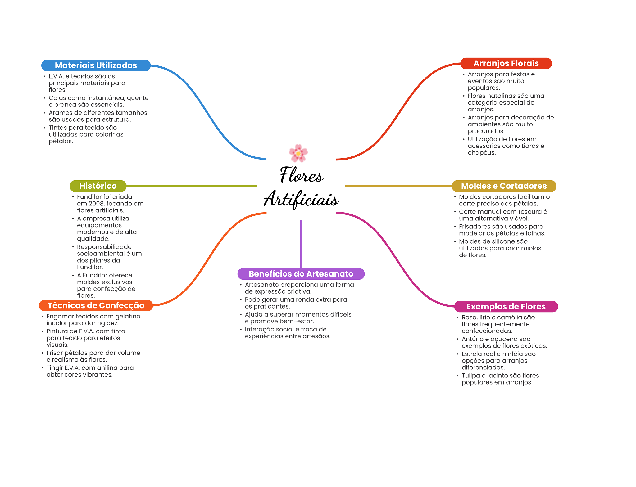 Materiais Utilizados Arranjos Florais E.V.A. e tecidos são Arranjos para festas e principais materiais para eventos são muito flores. populares. Colas como instantânea, quente Flores natalinas são uma e branca são essenciais. categoria especial de Arames de diferentes tamanhos arranjos. são usados para estrutura. Arranjos para decoração de ambientes são muito Tintas para tecido são utilizadas para colorir as procurados. pétalas. Utilização de flores em acessórios como tiaras e chapéus. Flores Histórico Moldes e Cortadores Fundifor foi criada Artificiais Moldes cortadores facilitam em 2008, focando em corte preciso das pétalas. flores artificiais. Corte manual com tesoura é A empresa utiliza uma alternativa viável. equipamentos Frisadores são usados para modernos e de alta modelar as pétalas e folhas. qualidade. Moldes de silicone são Responsabilidade utilizados para criar miolos socioambiental é um de flores. dos pilares da Fundifor. A Fundifor oferece Benefícios do Artesanato moldes exclusivos Artesanato proporciona uma forma para confecção de de expressão criativa. flores. Pode gerar uma renda extra para Técnicas de Confecção OS praticantes. Exemplos de Flores Engomar tecidos com gelatina Ajuda a superar momentos difíceis Rosa, lírio e camélia são incolor para dar rigidez. e promove bem-estar. flores frequentemente Pintura de E.V.A. com tinta Interação social e troca de confeccionadas para tecido para efeitos experiências entre artesãos. Antúrio e açucena são visuais. exemplos de flores exóticas. Frisar pétalas para dar volume Estrela real e ninféia são e realismo às flores. opções para arranjos Tingir E.V.A. com anilina para diferenciados. obter cores vibrantes. Tulipa e jacinto são flores populares em arranjos.