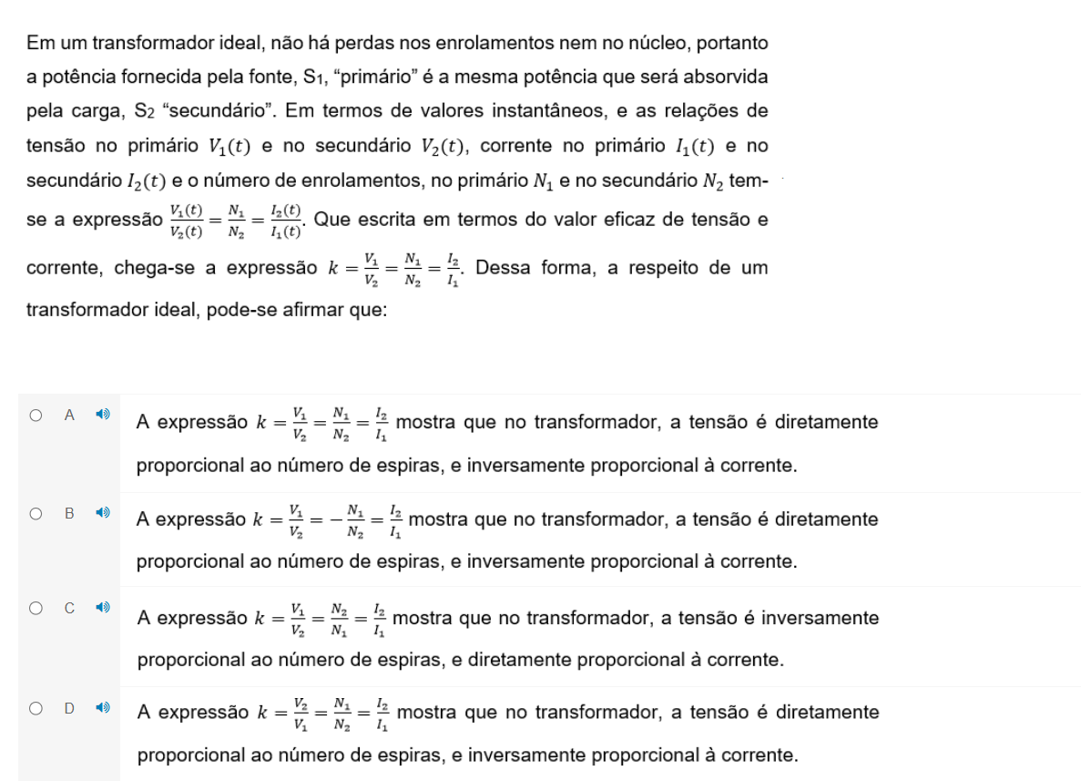 Em um transformador ideal, não há perdas nos enrolamentos nem no núcleo, portanto a potência fornecida pela fonte, S1, "primário" é a mesma potência que será absorvida pela carga, S₂ "secundário". Em termos de valores instantâneos, e as relações de tensão no primário V₁(t) e no secundário V₂(t), corrente no primário e no secundário I₂(t) e número de enrolamentos, no primário e no secundário N₂ tem- se a expressão V₁(t) V₂(t) = N₂ N1 I₂(t) Que escrita em termos do valor eficaz de tensão e corrente, chega-se a expressão k = V₂ = N₂ = Dessa forma, a respeito de um transformador ideal, pode-se afirmar que: A A expressão mostra que no transformador, a tensão é diretamente proporcional ao número de espiras, e inversamente proporcional à corrente. B A expressão k = N₂ = I₂ mostra que no transformador, a tensão é diretamente proporcional ao número de espiras, e inversamente proporcional à corrente. C A expressão k N₂ N1 I₂ mostra que no transformador, a tensão é inversamente proporcional ao número de espiras, e diretamente proporcional à corrente. D A expressão mostra que no transformador, a tensão é diretamente proporcional ao número de espiras, e inversamente proporcional à corrente.