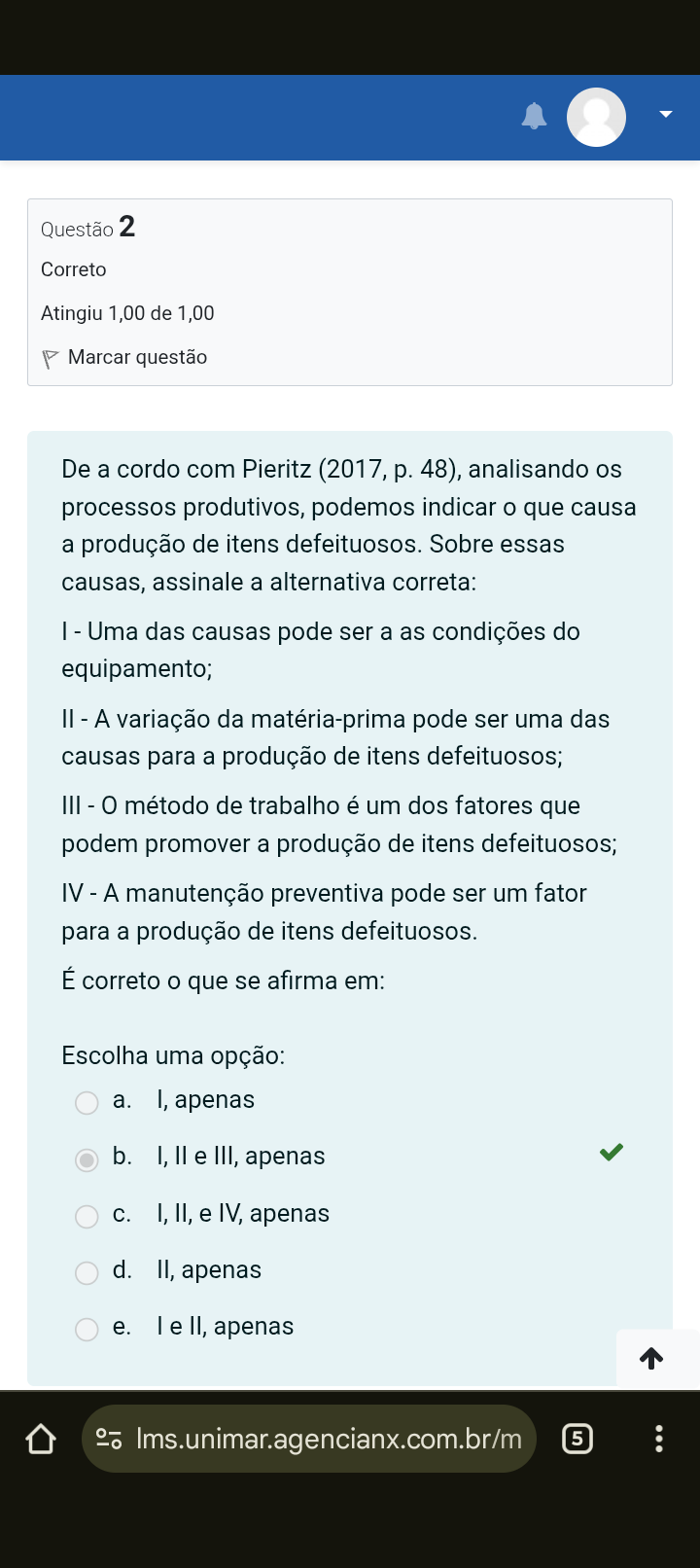 Questão 2 Correto Atingiu 1,00 de 1,00 Marcar questão De a cordo com Pieritz (2017, p. 48), analisando os processos produtivos, podemos indicar que causa a produção de itens defeituosos. Sobre essas causas, assinale a alternativa correta: Uma das causas pode ser a as condições do equipamento; A variação da matéria-prima pode ser uma das causas para a produção de itens defeituosos; III método de trabalho é um dos fatores que podem promover a produção de itens defeituosos; IV A manutenção preventiva pode ser um fator para a produção de itens defeituosos. É correto que se afirma em: Escolha uma opção: a. I, apenas b. I, e III, apenas C. I, II, e IV, apenas d. II, apenas e. le II, apenas Ims.unimar.agencianx.com.br/m 5